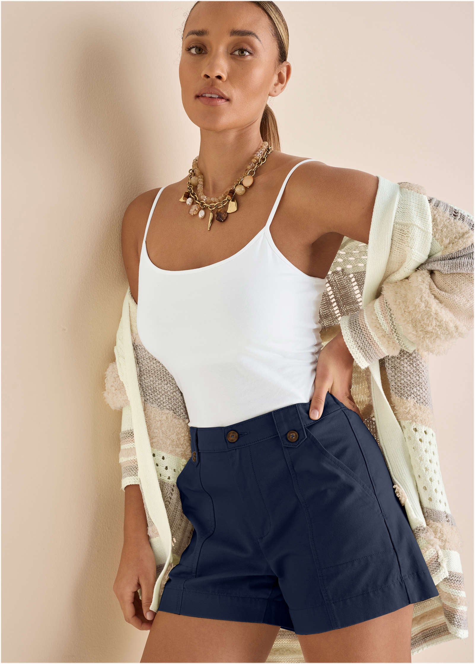 Eyelet Cuffed Button Shorts - Navy