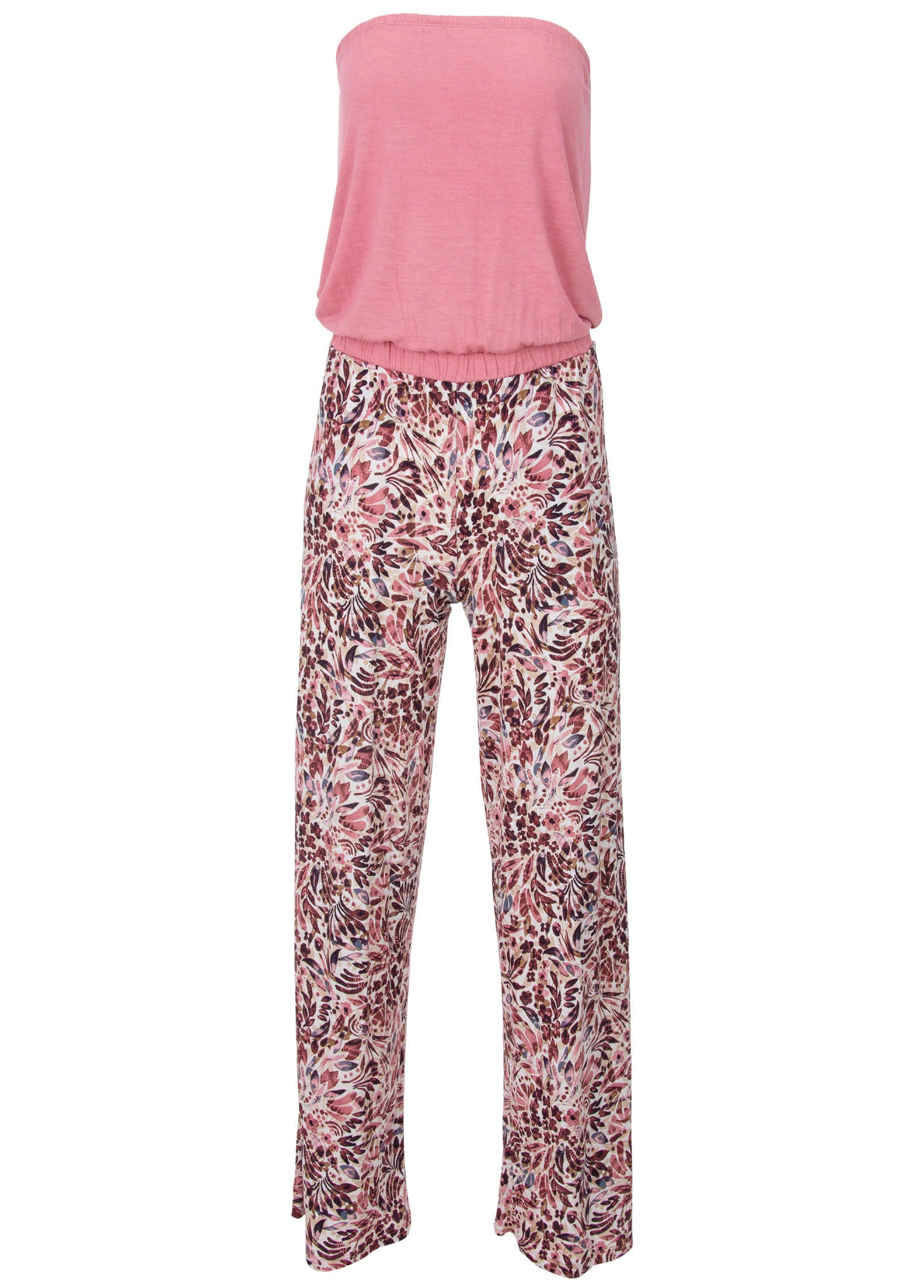 Breezy pants finish this lightweight jumpsuit with side pockets to hold your essentials. Cinched elastic wraps the strapless neckline keeping it secure and a matching elastic waistband adds a blouson effect to the top. Keep it lowkey with sandals or turn up the heat with heels and a luxe layer over top.* Sizes: XS (2). S (4-6). M (8-10). L (12-14). XL (16)* Plus sizes: 1X (18-20). 2X (22-24). 3X (26-28)* Print placement may vary* Side slit pockets* Elastic at strapless neckline and waist* Fabric has stretch* By Lascana for Basic Charm* Viscose. Imported