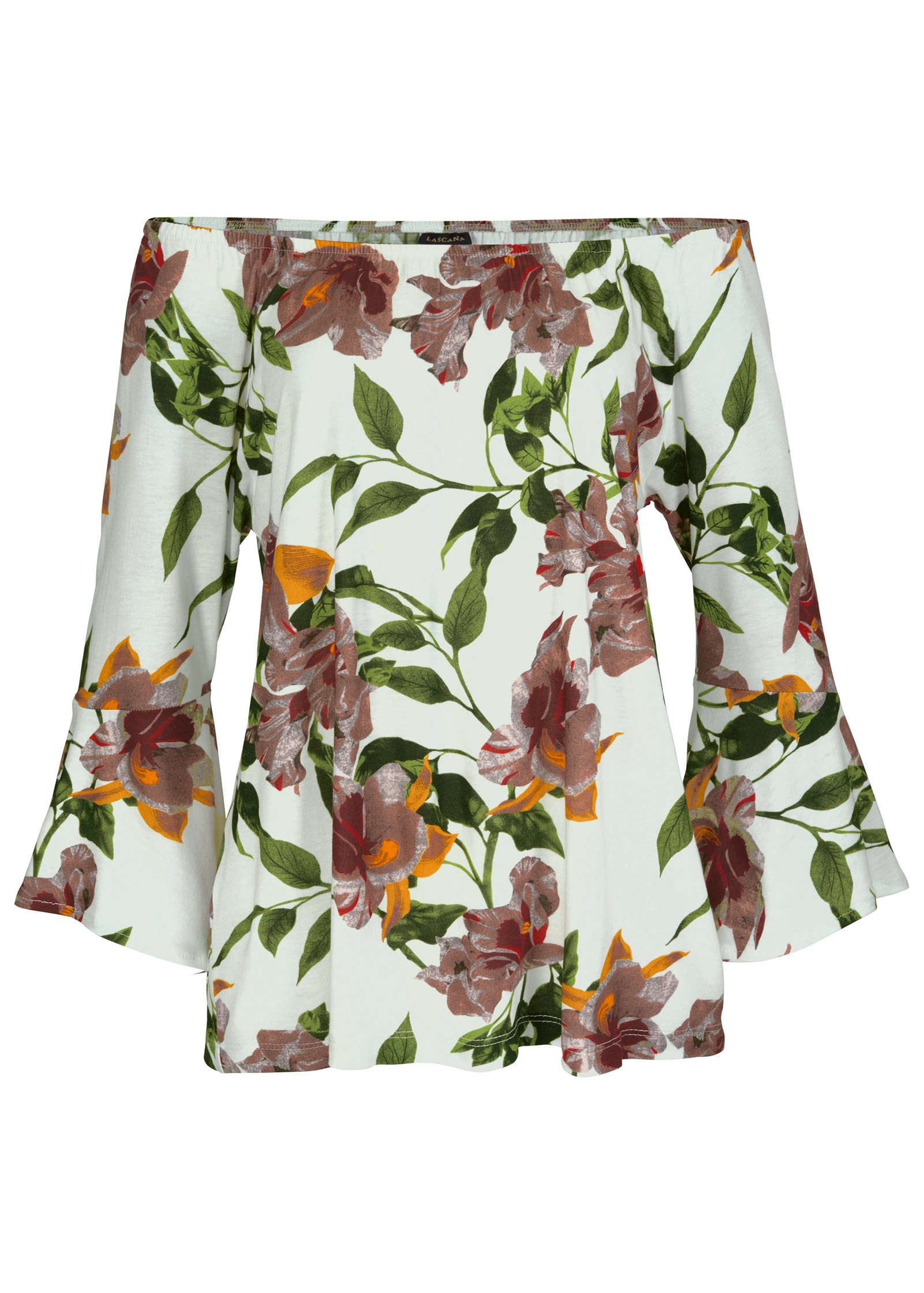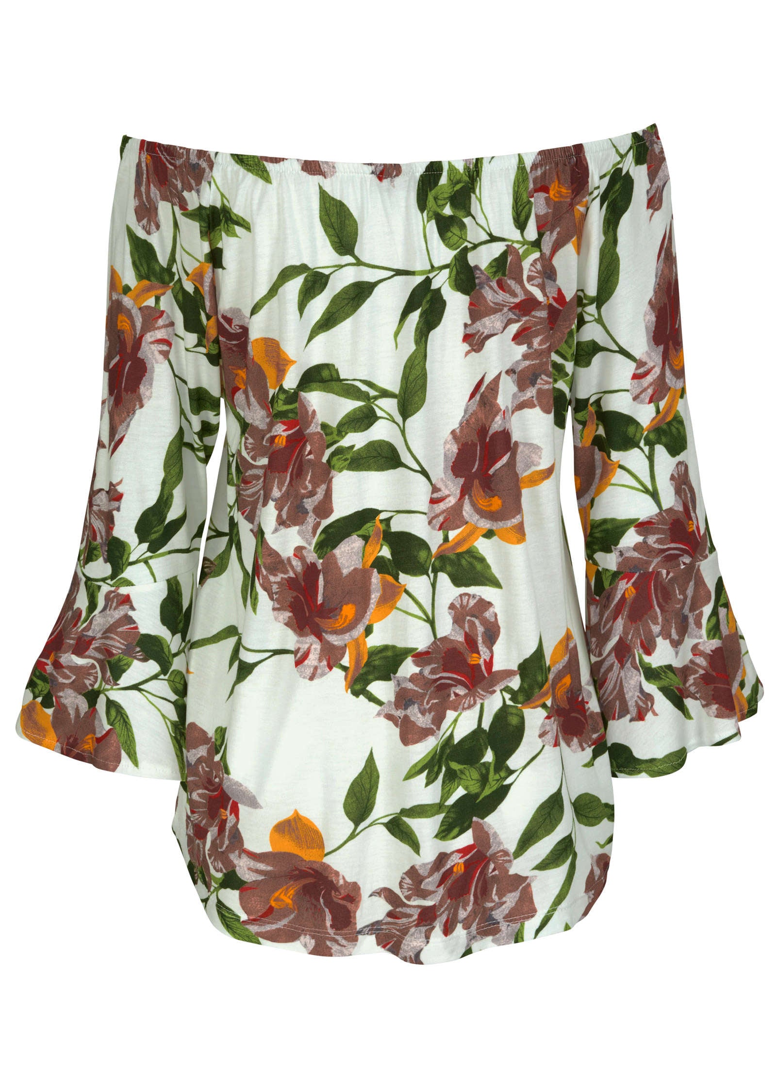 The loose fit hem and billowing bell sleeves bring a breezy vibe to this off-the-shoulder top. Nature-inspired prints enhance this bohemian look that pairs seamlessly with denim for an even more free-spirited flair.
