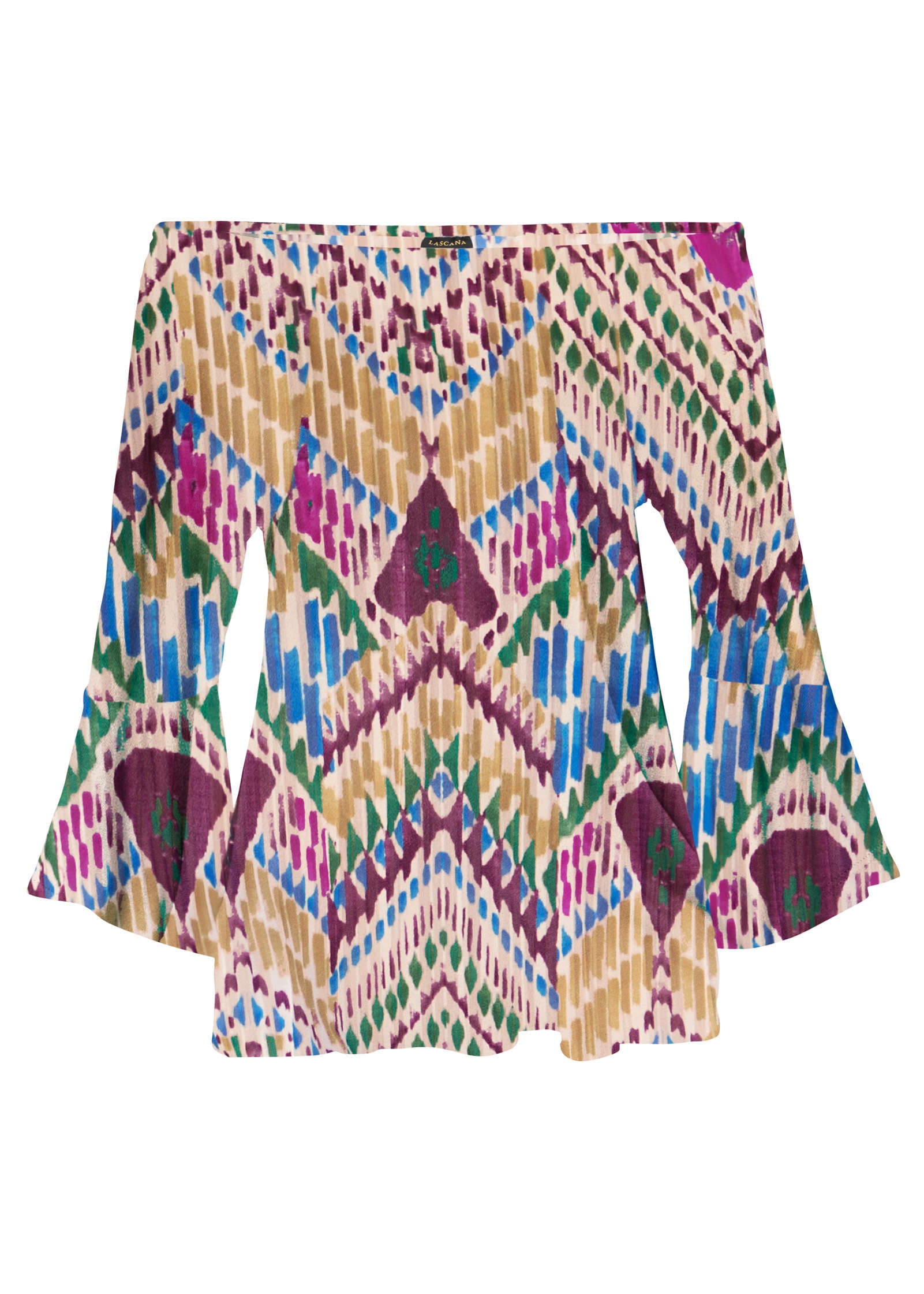 The loose fit hem and billowing bell sleeves bring a breezy vibe to this off-the-shoulder top. Nature-inspired prints enhance this bohemian look that pairs seamlessly with denim for an even more free-spirited flair.