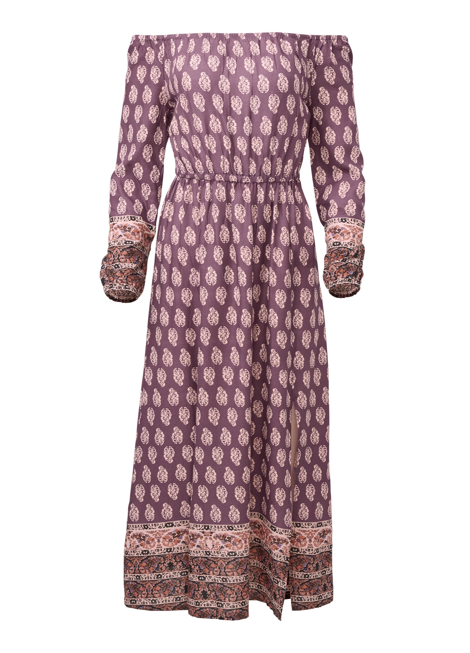 There's nothing more effortless than pulling on this maxi dress. The skirt features side slits that reveal a pop of leg while an off-the-shoulder neckline gives a glimpse of sun-kissed shoulders. Elastic at the cuffs and waist provide structure to ensure comfort follows this trendy. boho-inspired dress.* Sizes: XS (2). S (4-6). M (8-10). L (12-14). XL (16)* Plus sizes: 1X (18-20). 2X (22-24). 3X (26-28)* Off-the-shoulder detail* Pull-on; no closure* Elastic detail at waist* Belt not included* Side slits at hem* Print placement may vary* Fabric does not have stretch* Unlined* By Lascana for Basic Charm* Modal. Imported