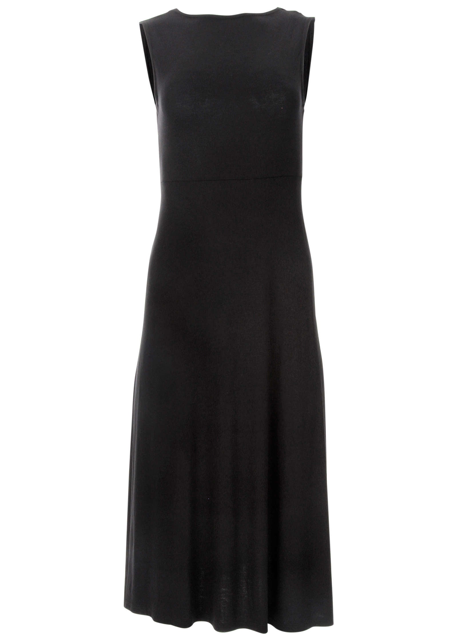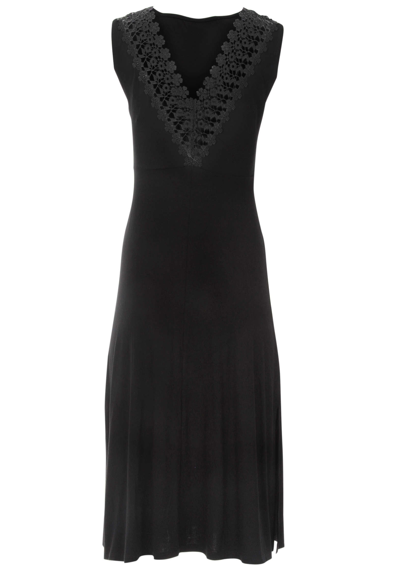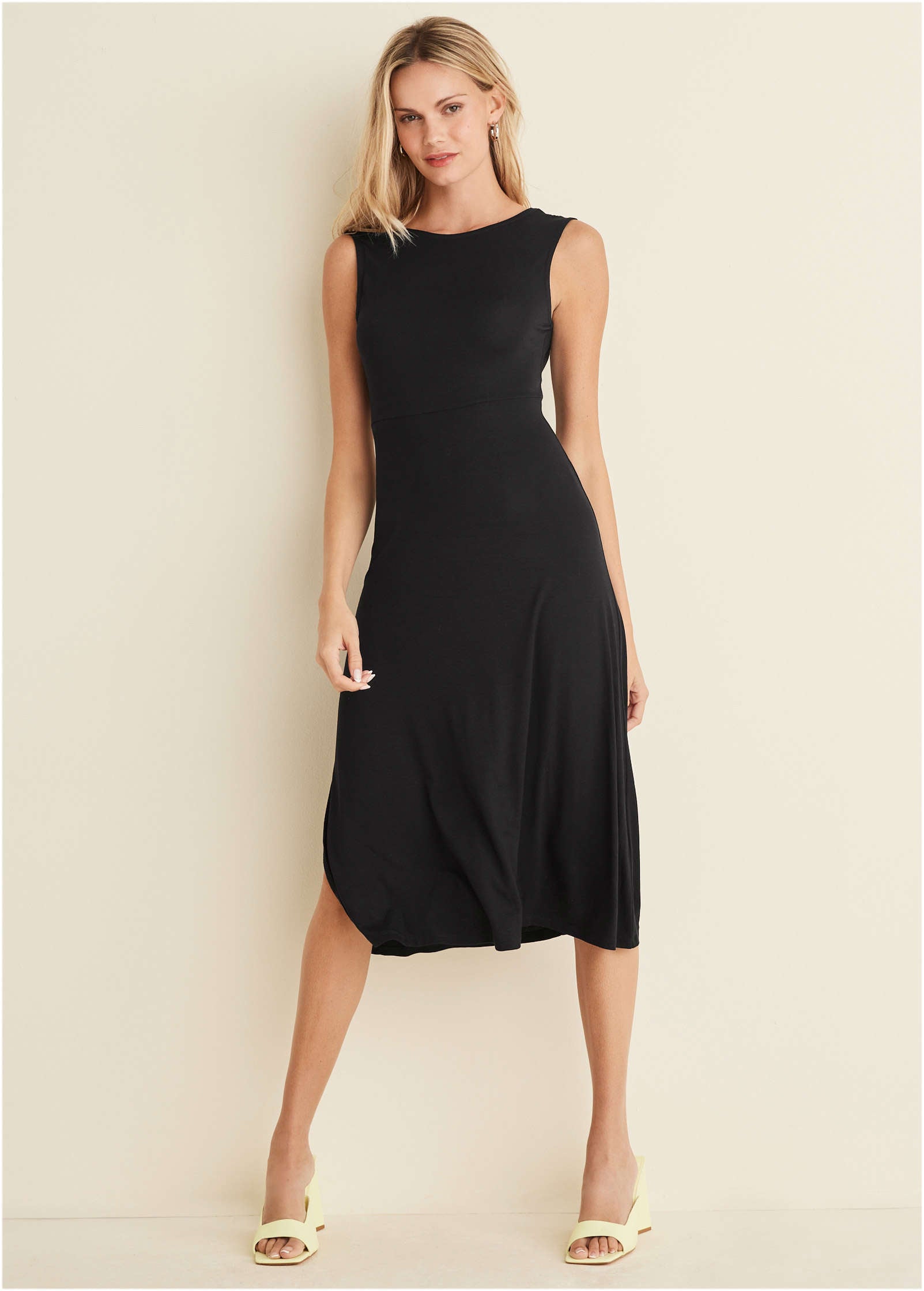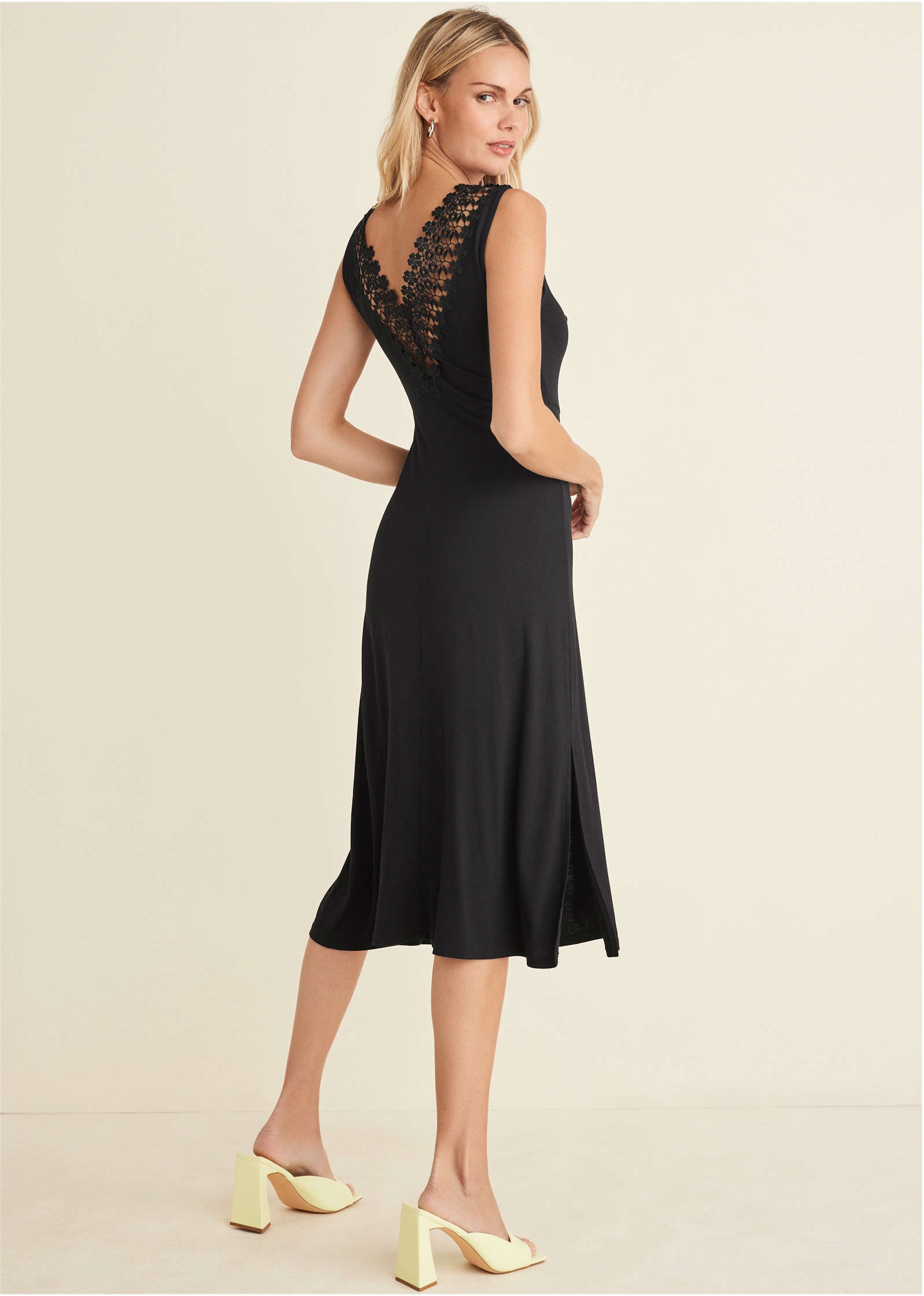 This midi is not your average LBD. From the front it's total sophistication with a high neckline and fit-and-flare shape. but turn around and that's where things really get interesting: a plunging V-back trimmed with crochet reveals this dress' flirty side! If you're feeling bold. flip it around and wear the plunging V in front—it goes both ways!* Sizes: XS (2). S (4-6). M (8-10). L (12-14). XL (16) * Crochet-lined V-back * Sleeveless * Leg slit * Unlined * 42" approx. length; varies by size * By Lascana for Basic Charm * Fabric has stretch * Viscose. Imported