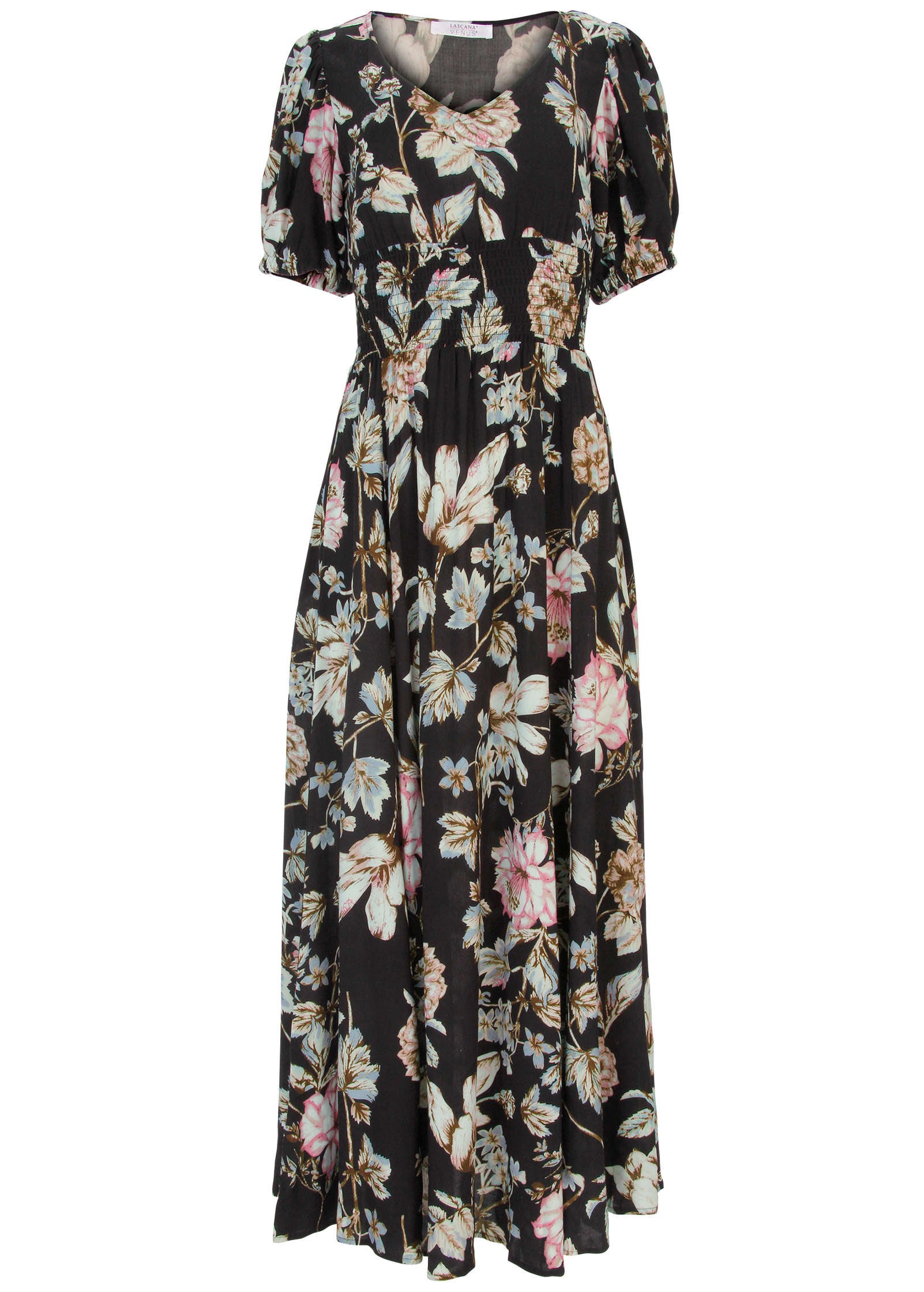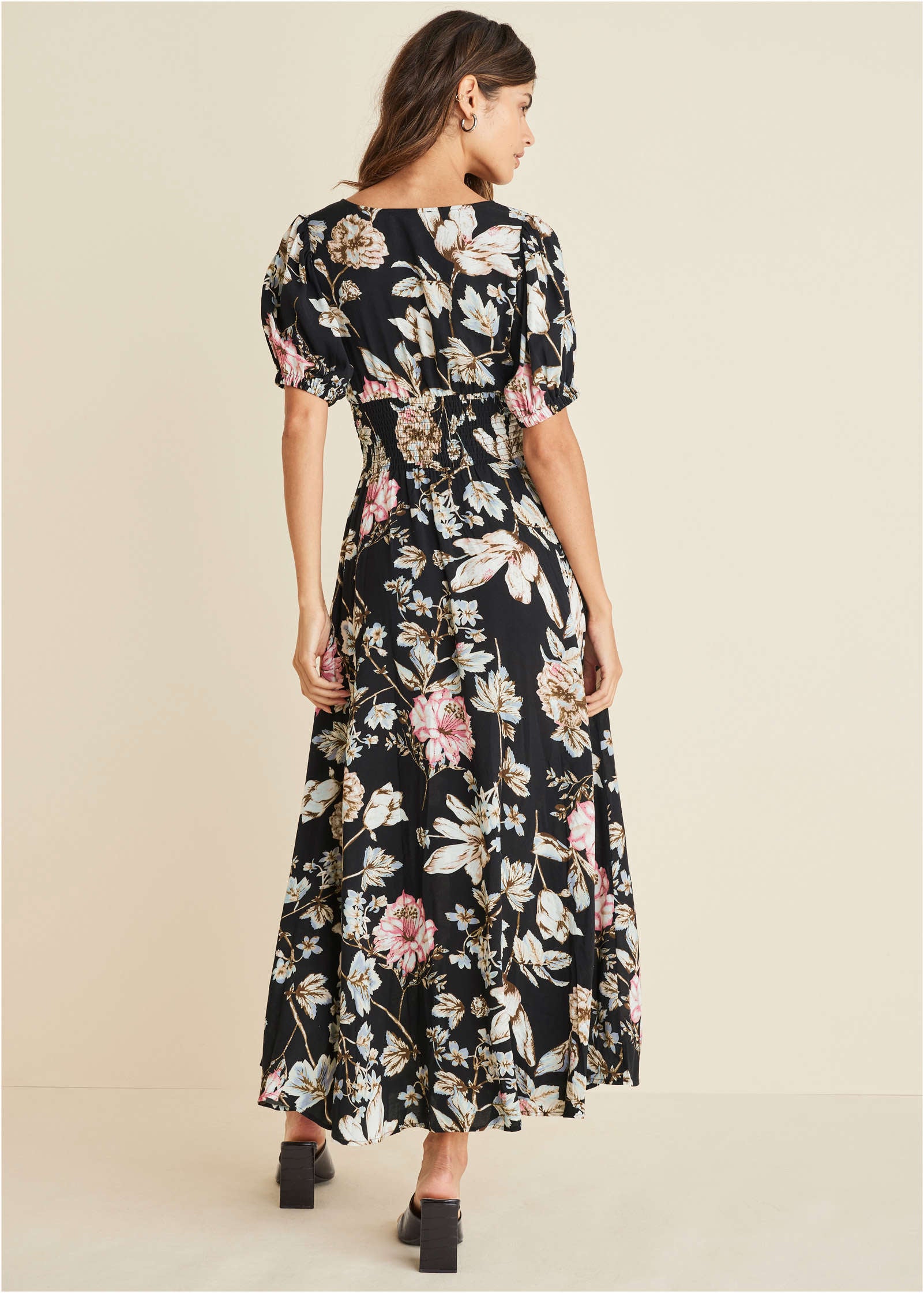 This maxi dress is like a bouquet of freshly picked flowers for your wardrobe. Pastel florals pop against the dark background. creating a look that's equally feminine and sophisticated. Relaxed puff sleeves add a romantic feel. while a smocked waistband defines your middle for a flattering hourglass silhouette.* Sizes: XS (2). S (4-6). M (8-10). L (12-14). XL (16)* V-neck* Short sleeves* Maxi length* Viscose. Imported