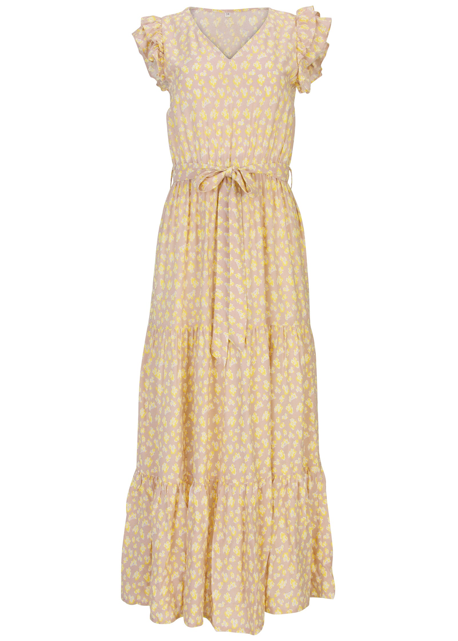 Sunny days call for sunny dresses. This maxi is easy and breezy from the flutter sleeves to the twirly tiered skirt. Cinch the waist with the included tie belt (or your own statement piece) and slip on sandals for a warm-weather uniform.* Sizes: XS (2). S (4-6). M (8-10). L (12-14). XL (16)* V-neck* Flutter sleeves* Tie waist belt* Front slit* Maxi length* By Lascana for Basic Charm* Viscose. Imported