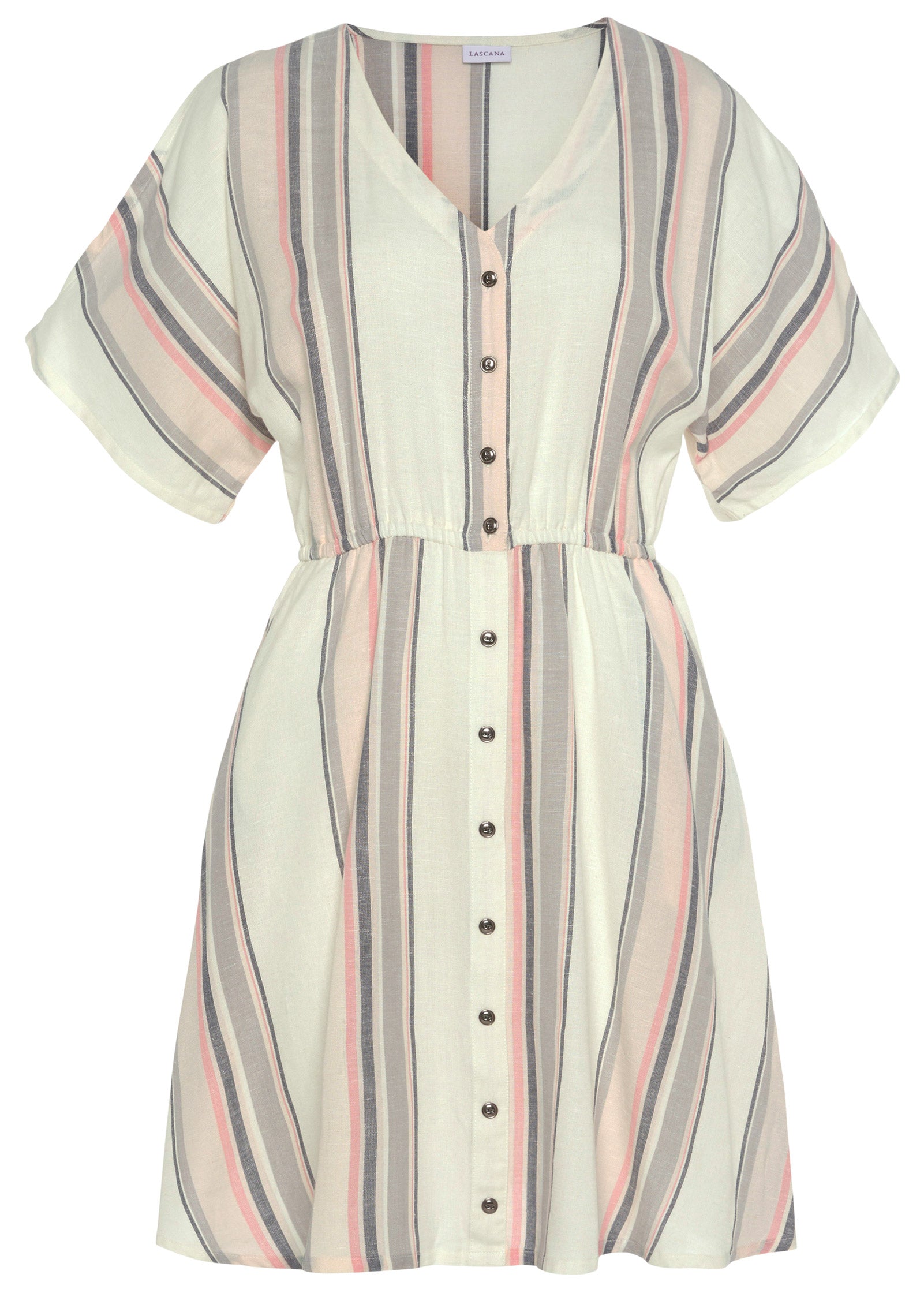 Lean into linen this summer with this breezy button-up dress. This light and breezy fabric pairs best with every beach vacation and brunch date. With shoulder slit details. this waist-cinching look provides an airy feel for when the season heats up. * Sizes: XS (2). S (4-6). M (8-10). L (12-14). XL (16)* By Lascana for Basic Charm* Viscose/linen. Imported