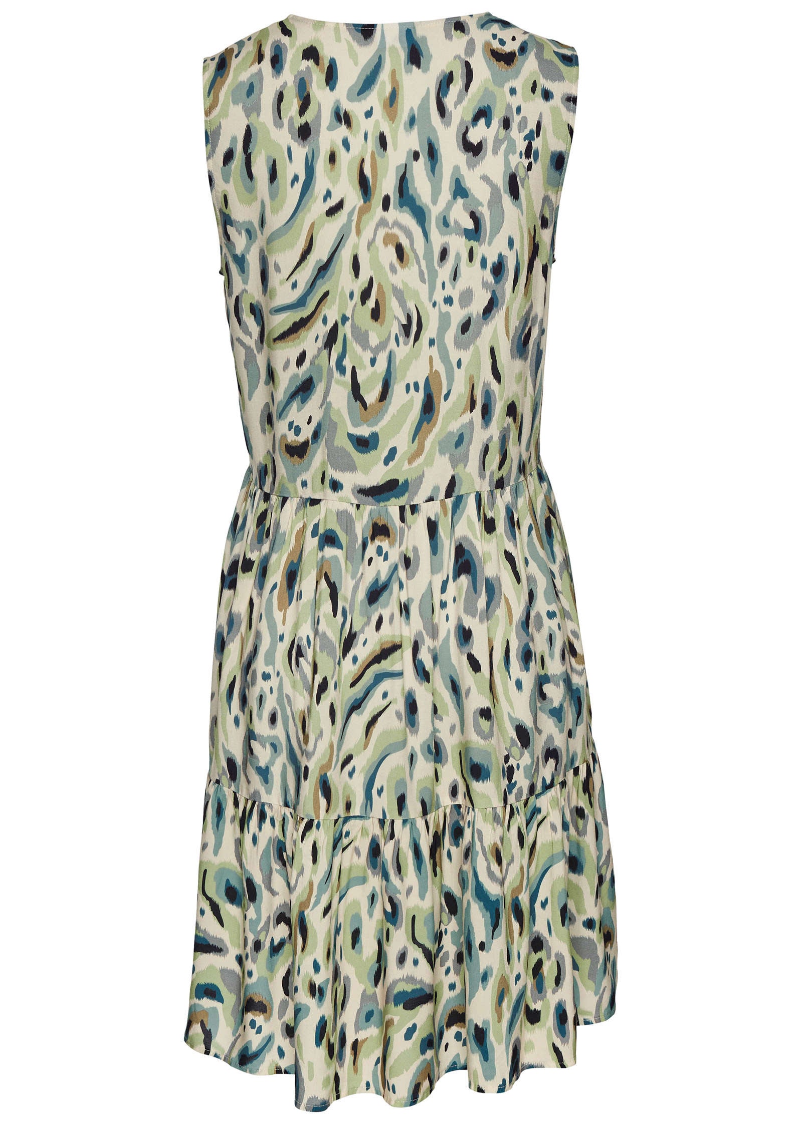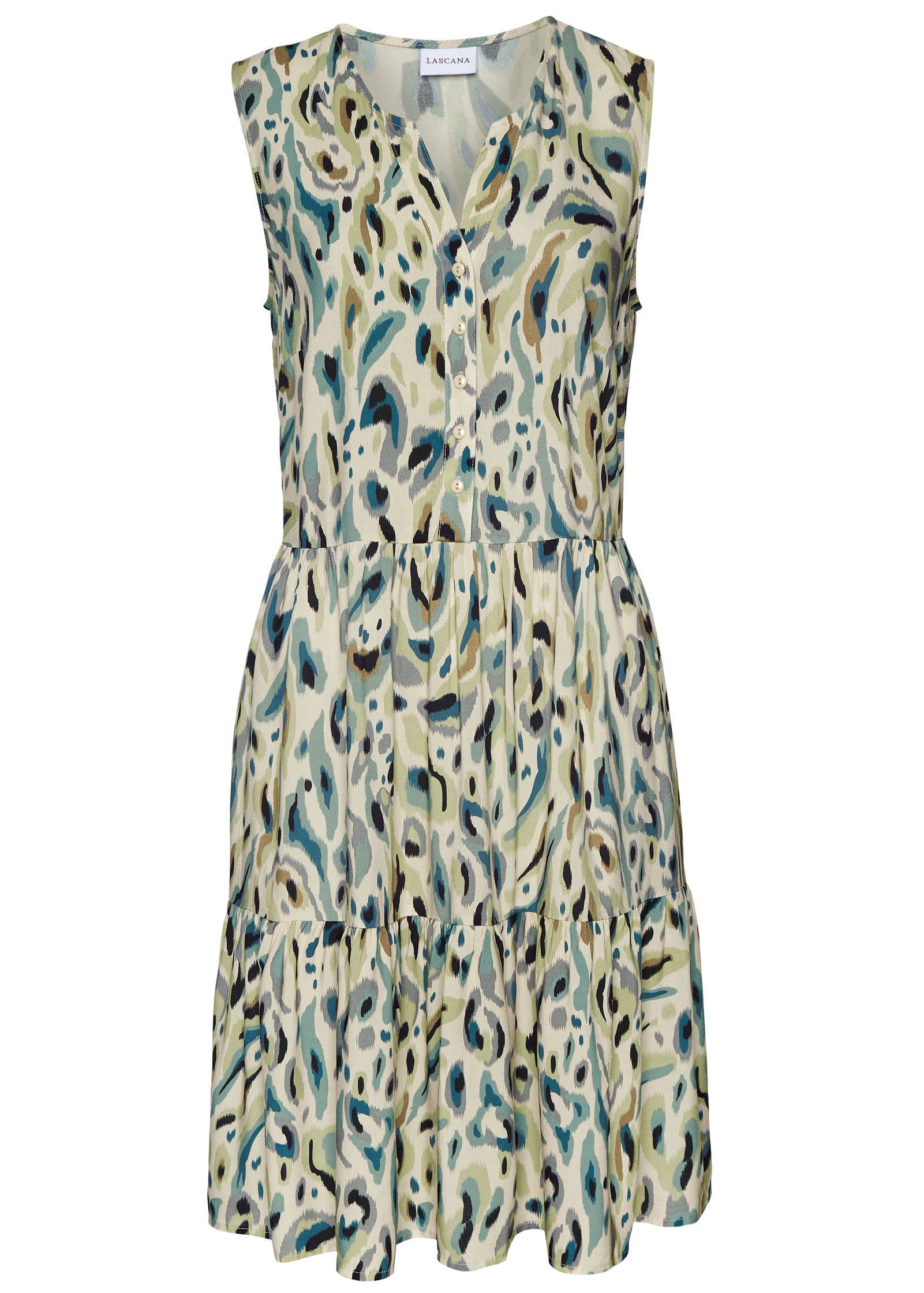 Turn heads in this breezy. playful mini dress. With a flattering V-neckline. tiered skirt. and button details. this dress combines chic style and comfort for your next outing.* Sizes: XS (2). S (4-6). M (8-10). L (12-14). XL (16)* Sleeveless: Perfect for warm weather and sunny days.* Button details: Add a touch of charm and flair.* Tiered skirt: Flouncy and fun. giving the dress movement and style.* V-neckline: A flattering cut that accentuates your frame.*By Lascana for Basic Charm* Viscose. Imported