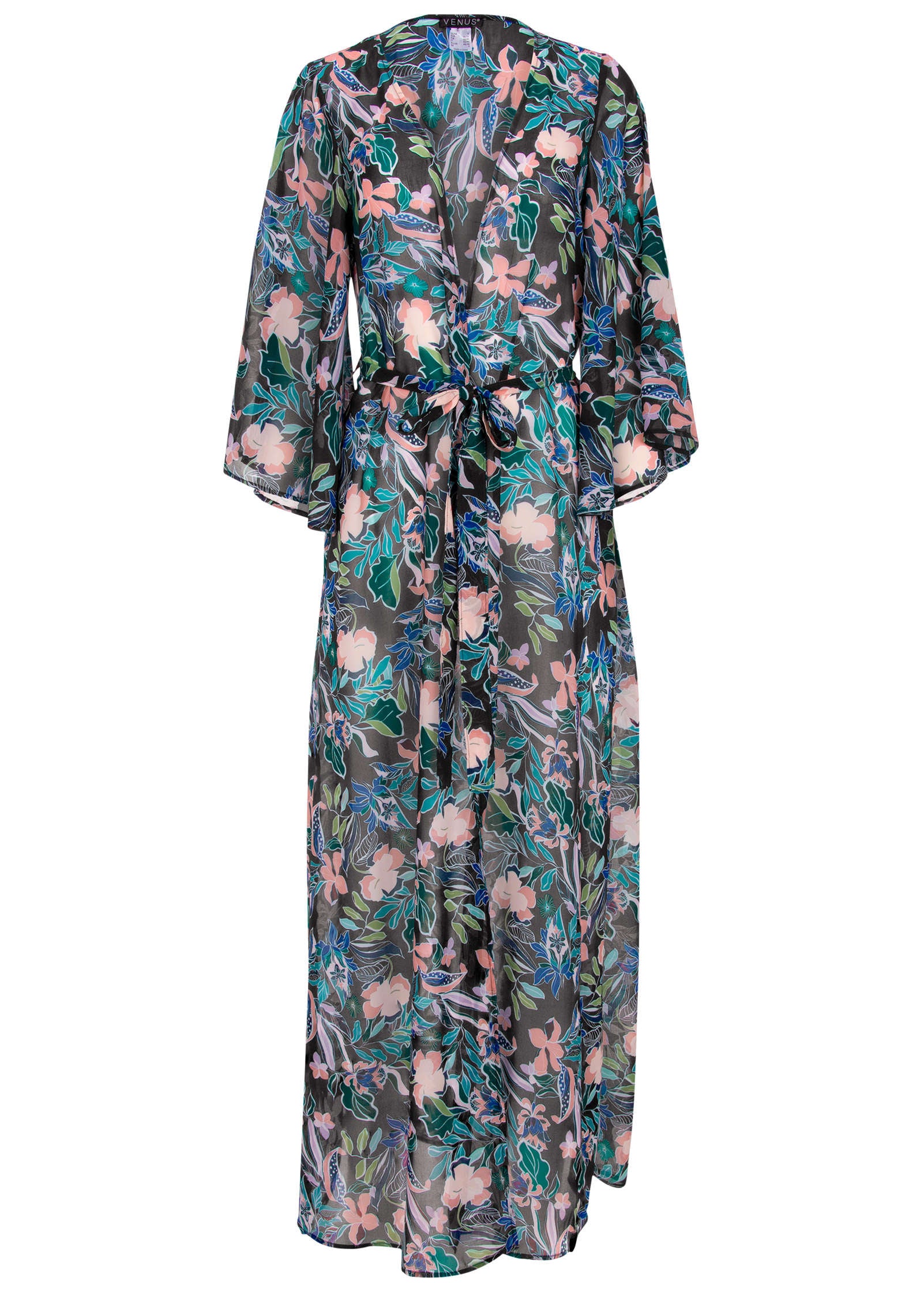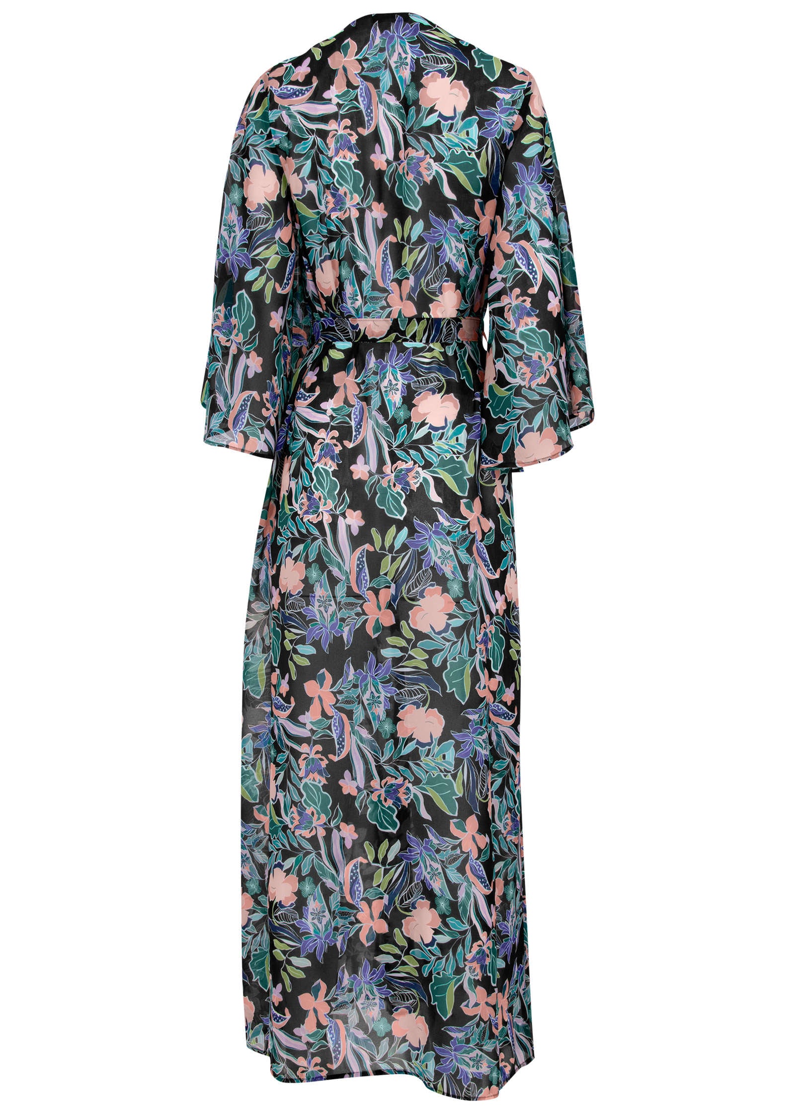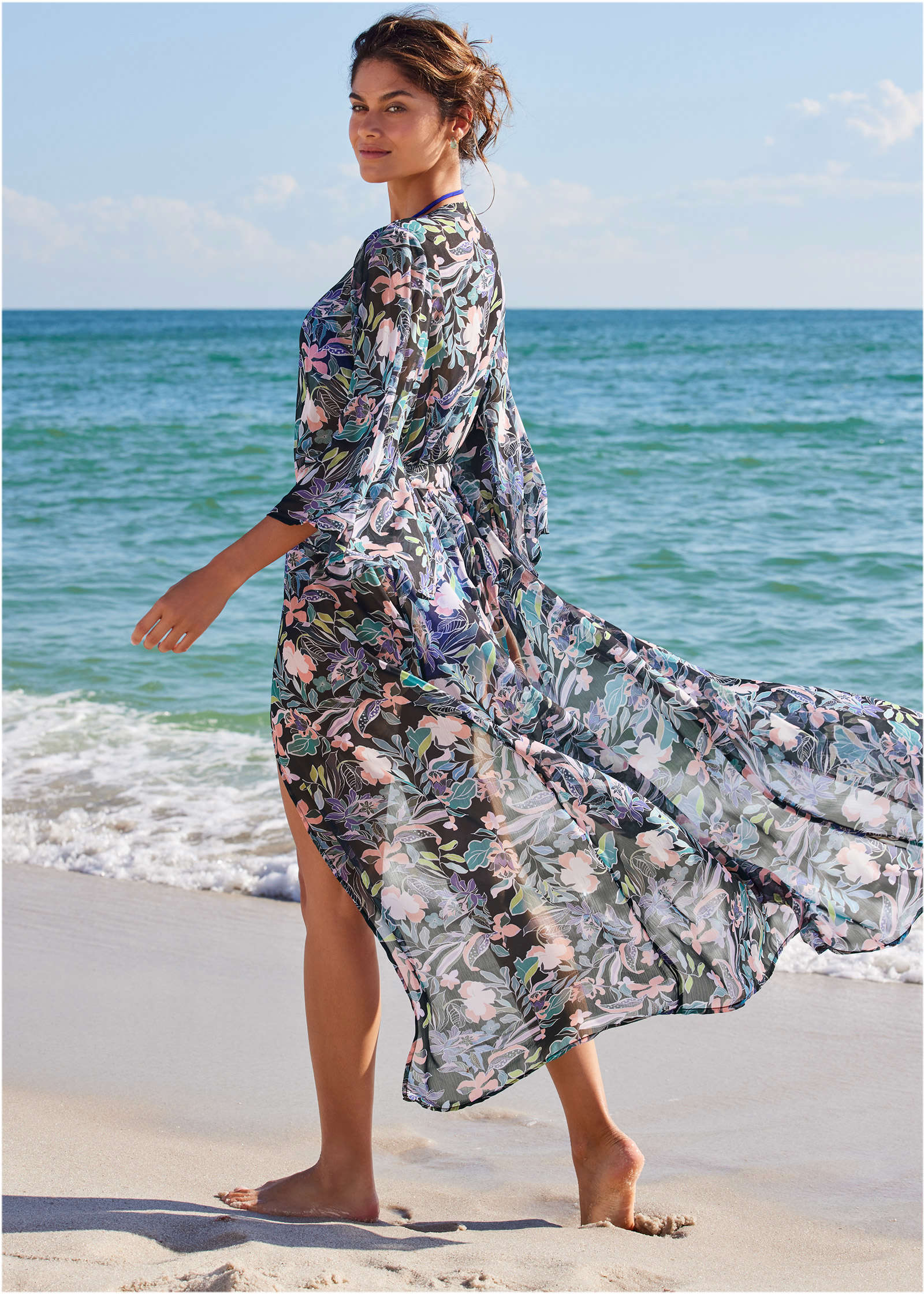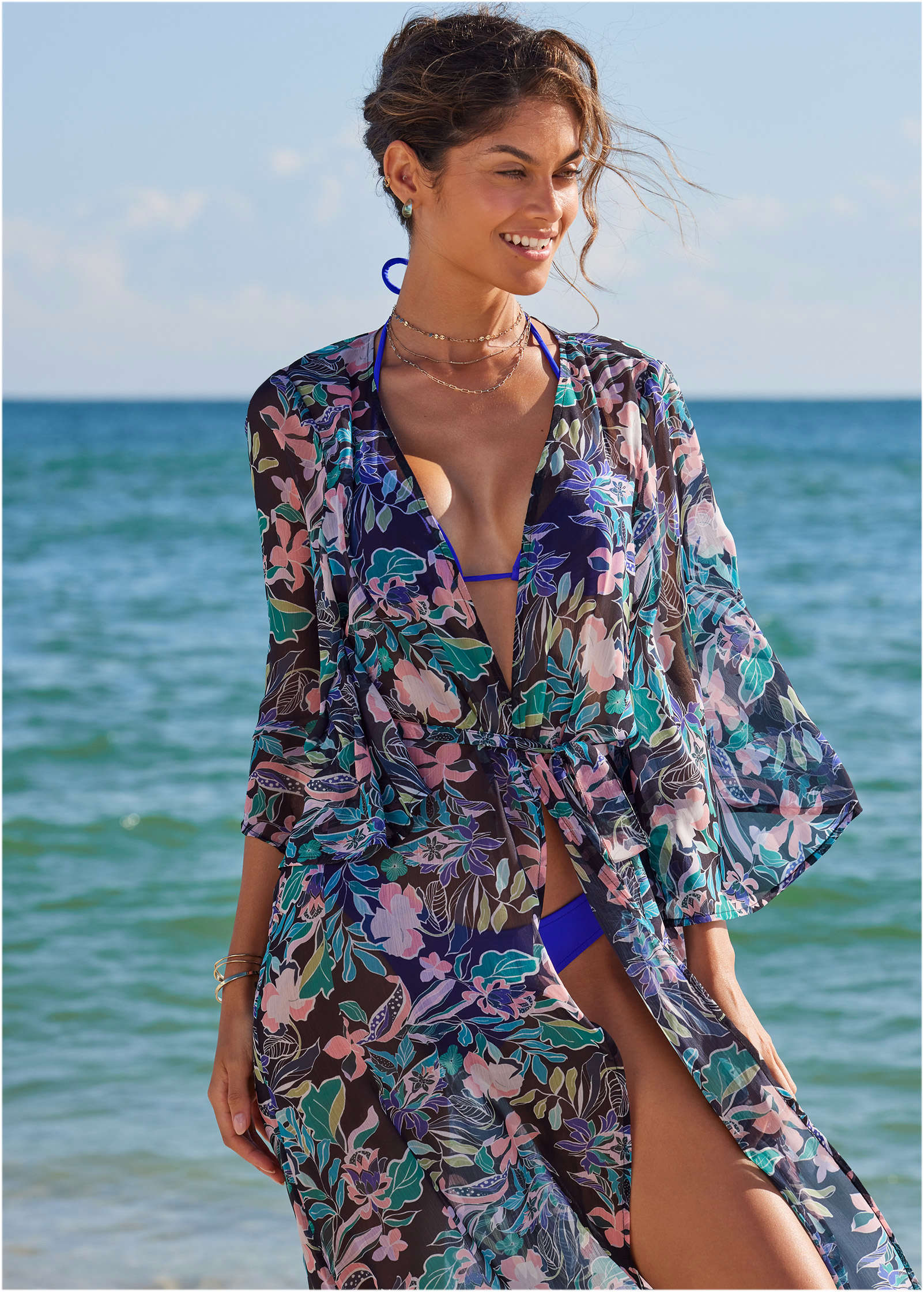 Picture this: you. seaside. with this billowy cover-up swaying in the cool ocean breeze. Feminine bell sleeves add to the relaxed shape of this lightweight layer that's perfect for tossing over your suit or wearing over any of your non-swim vacay looks. too.* Bell sleeves* Tie waist belt* Semi sheer* Polyester. Imported
