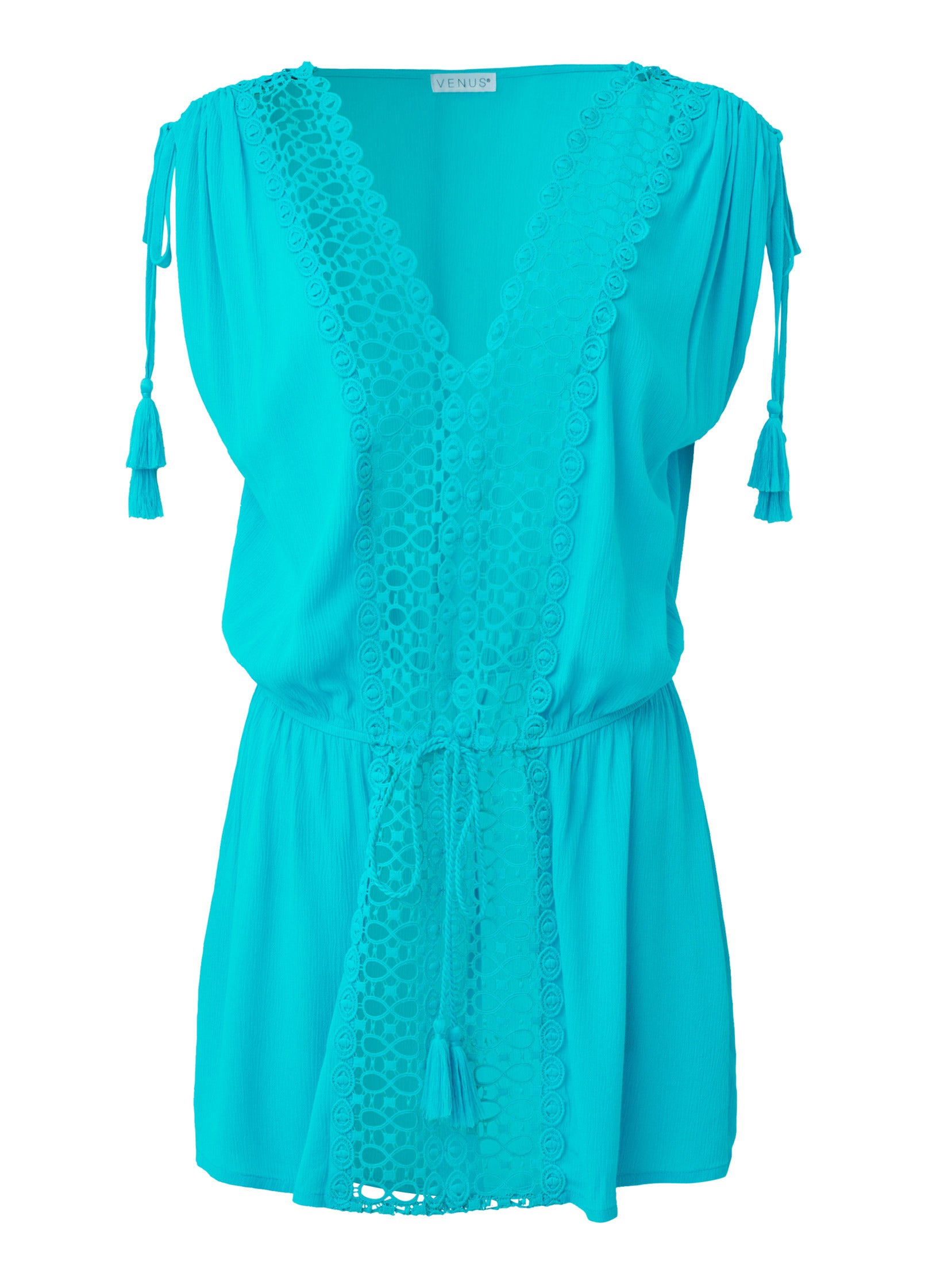 Fun in the sun starts with a playful cover-up. and this crochet detailed cover-up dress checks all the boxes. Blousy thanks to the elastic waist trim and high-on-the-thigh length. this feminine style keeps your look effortless with the added flair of tassel ties at the cap sleeves and waistline.* Sizes: S (4-6). M (8-10). L (12-14). XL (16) * Plus sizes: 1X (18-20). 2X (22-24). 3X (26-28)* Semi-sheer* Open crochet panel at front* Tassel ties at sleeves and front* Elastic waist for blouson fit* Rayon. Imported