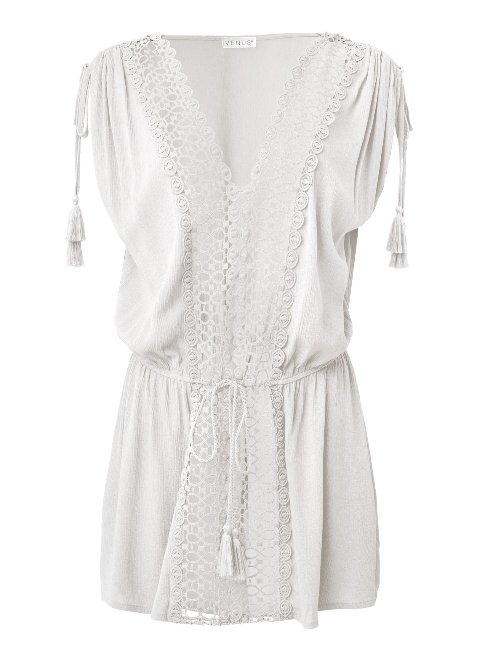Fun in the sun starts with a playful cover-up. and this crochet detailed cover-up dress checks all the boxes. Blousy thanks to the elastic waist trim and high-on-the-thigh length. this feminine style keeps your look effortless with the added flair of tassel ties at the cap sleeves and waistline.* Sizes: S (4-6). M (8-10). L (12-14). XL (16) * Plus sizes: 1X (18-20). 2X (22-24). 3X (26-28)* Semi-sheer* Open crochet panel at front* Tassel ties at sleeves and front* Elastic waist for blouson fit* Rayon. Imported