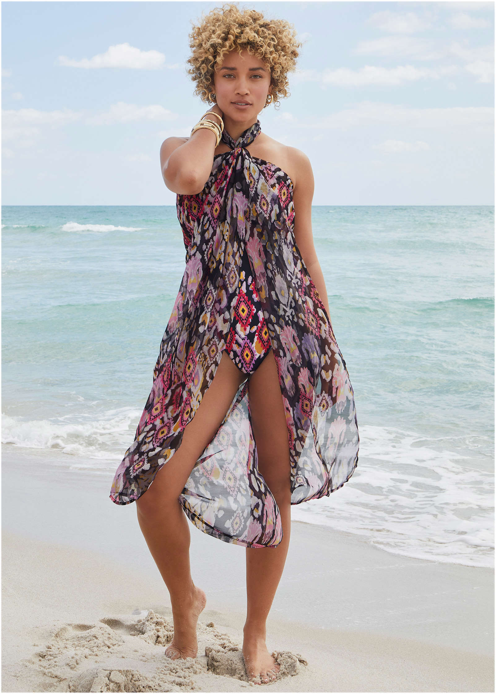 Beach goddess vibes are yours with this pareo cover-up. Perfectly lightweight for getting effortlessly swept up in an ocean breeze. and just sheer enough to show off your suit underneath. The best part: you can tie it five different ways for a different look each day of your vacation.*O/S (one size fits most sizes 2-16)* For printed items. print placement may vary* Sheer coverage* Can be worn multiple ways* Poly. Imported