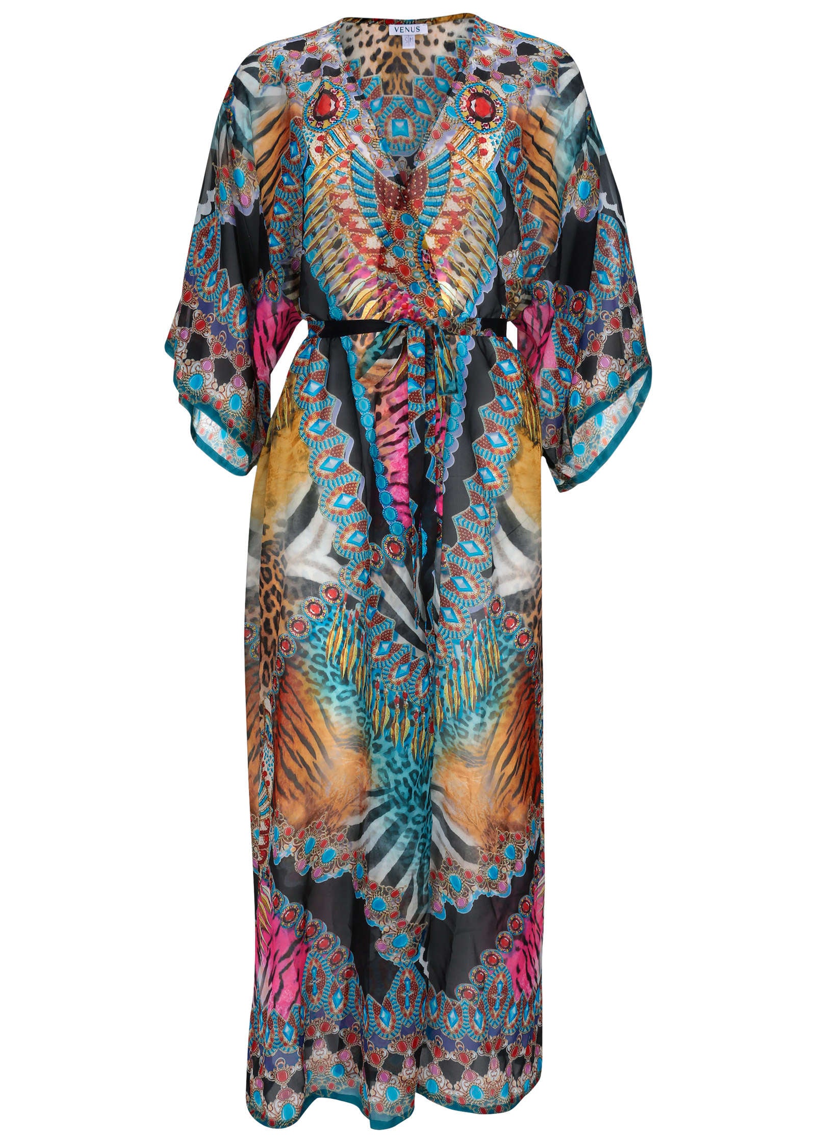 Own the beach in this ethereal kimono cover-up. It's lightweight and just sheer enough to show off your suit underneath. even when belted. The bold mixed print and vibrant palette are the perfect complement to a bright suit and add a fun color pop to a classic black or white swim look.* 56" from top of shoulder* Sash tie belt included* Semi-sheer coverage* Print placement may vary* Poly. Imported