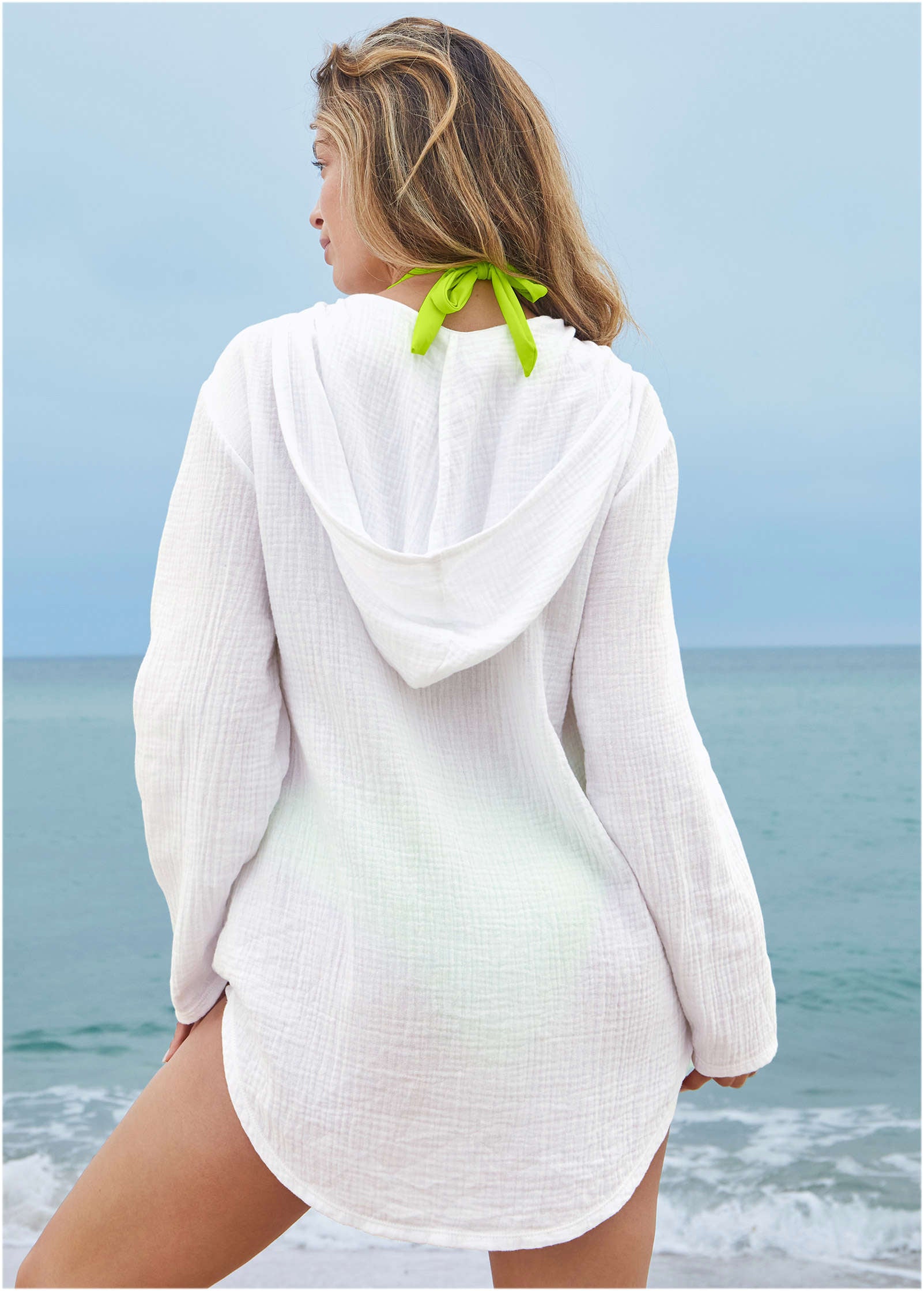 This cotton cover-up packs down to nothing. making it the perfect layer to throw in your beach bag. Semi sheer. it shows off a peek of your suit underneath. but long sleeves and an oversized hood are details that keep you covered when you've gotten too much sun or the clouds have rolled in. The best part: the gauzy texture means wrinkles. what wrinkles?* Sizes: XS (2). S (4-6). M (8-10). L (12-14). XL (16)* Plus sizes: 1X (18-20). 2X (22-24). 3X (26-28)* Hooded* Long sleeves* Front pocket* Oversized* Semi sheer* Cotton. Imported