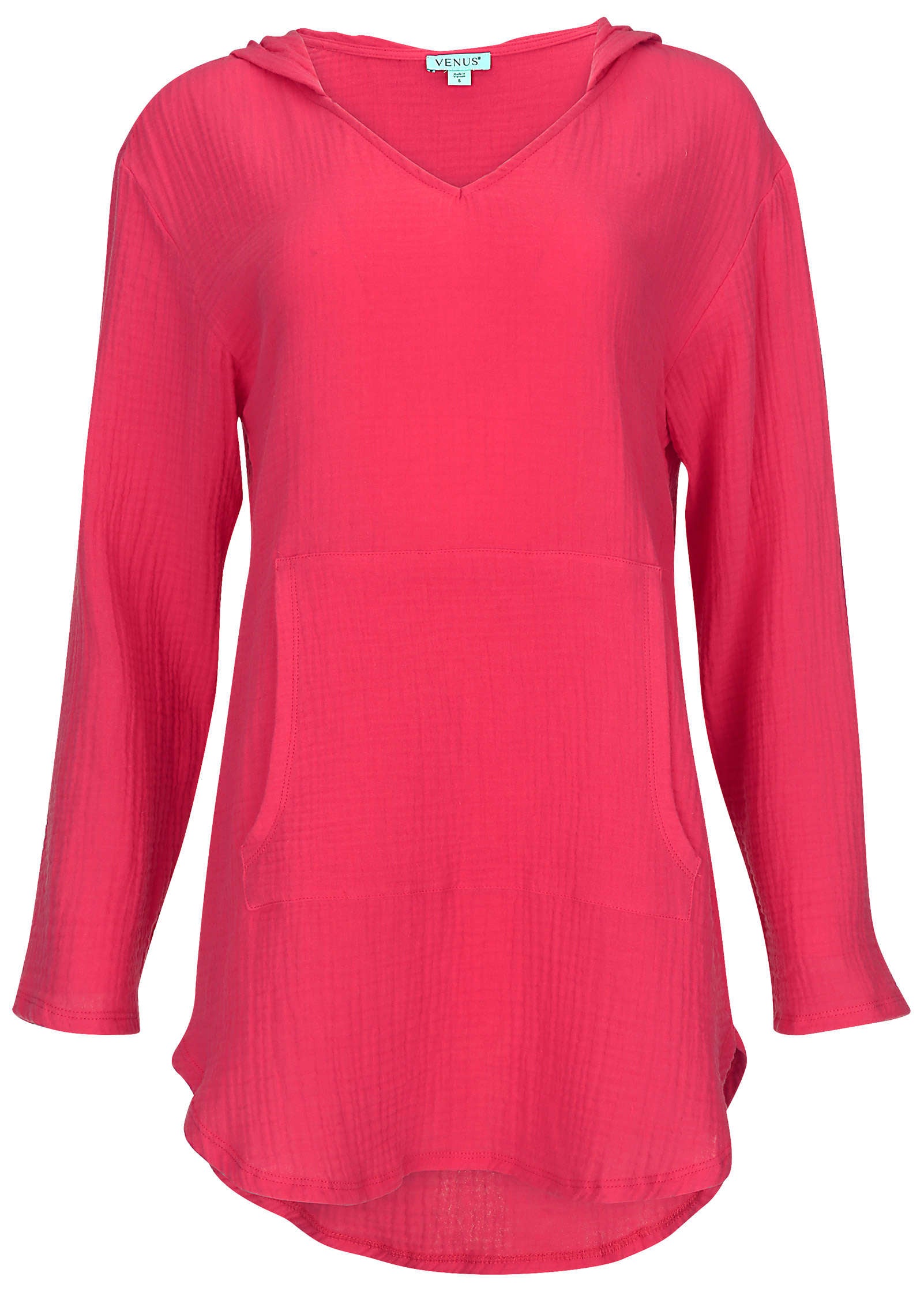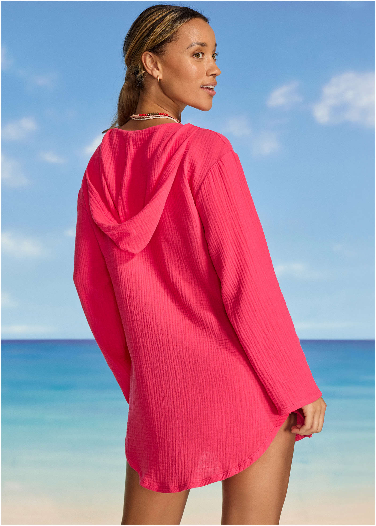 This cotton cover-up packs down to nothing. making it the perfect layer to throw in your beach bag. Semi sheer. it shows off a peek of your suit underneath. but long sleeves and an oversized hood are details that keep you covered when you've gotten too much sun or the clouds have rolled in. The best part: the gauzy texture means wrinkles. what wrinkles?* Sizes: XS (2). S (4-6). M (8-10). L (12-14). XL (16)* Plus sizes: 1X (18-20). 2X (22-24). 3X (26-28)* Hooded* Long sleeves* Front pocket* Oversized* Semi sheer* Cotton. Imported