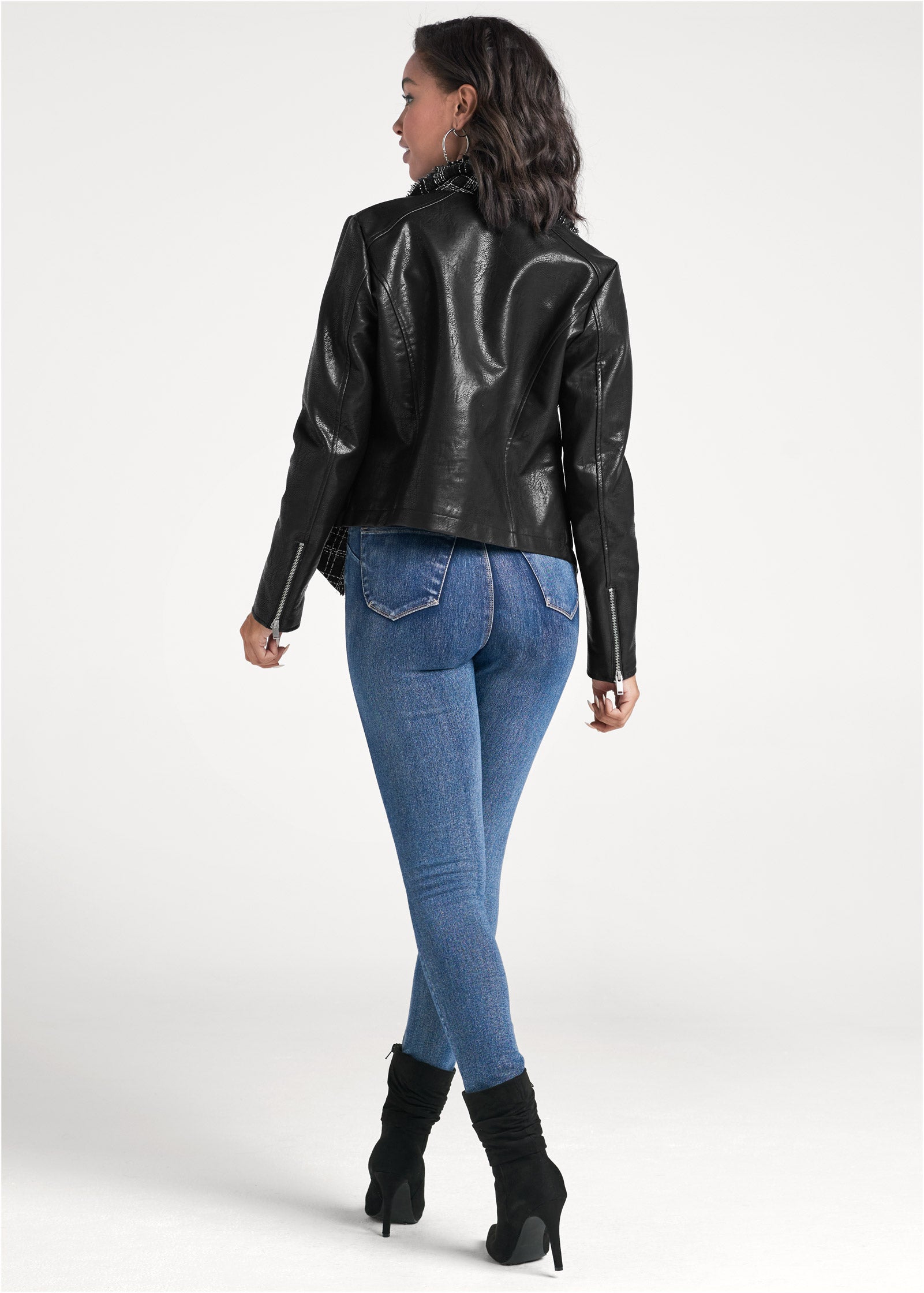 Add a little bit of edge to any simple outfit when you throw on this jacket. Faux leather hints at your wild side while the tweed-textured front echoes tradition. Fringe-trimmed edges on the open front and an oversized collar make this a standout accent piece for that extra layer of style.