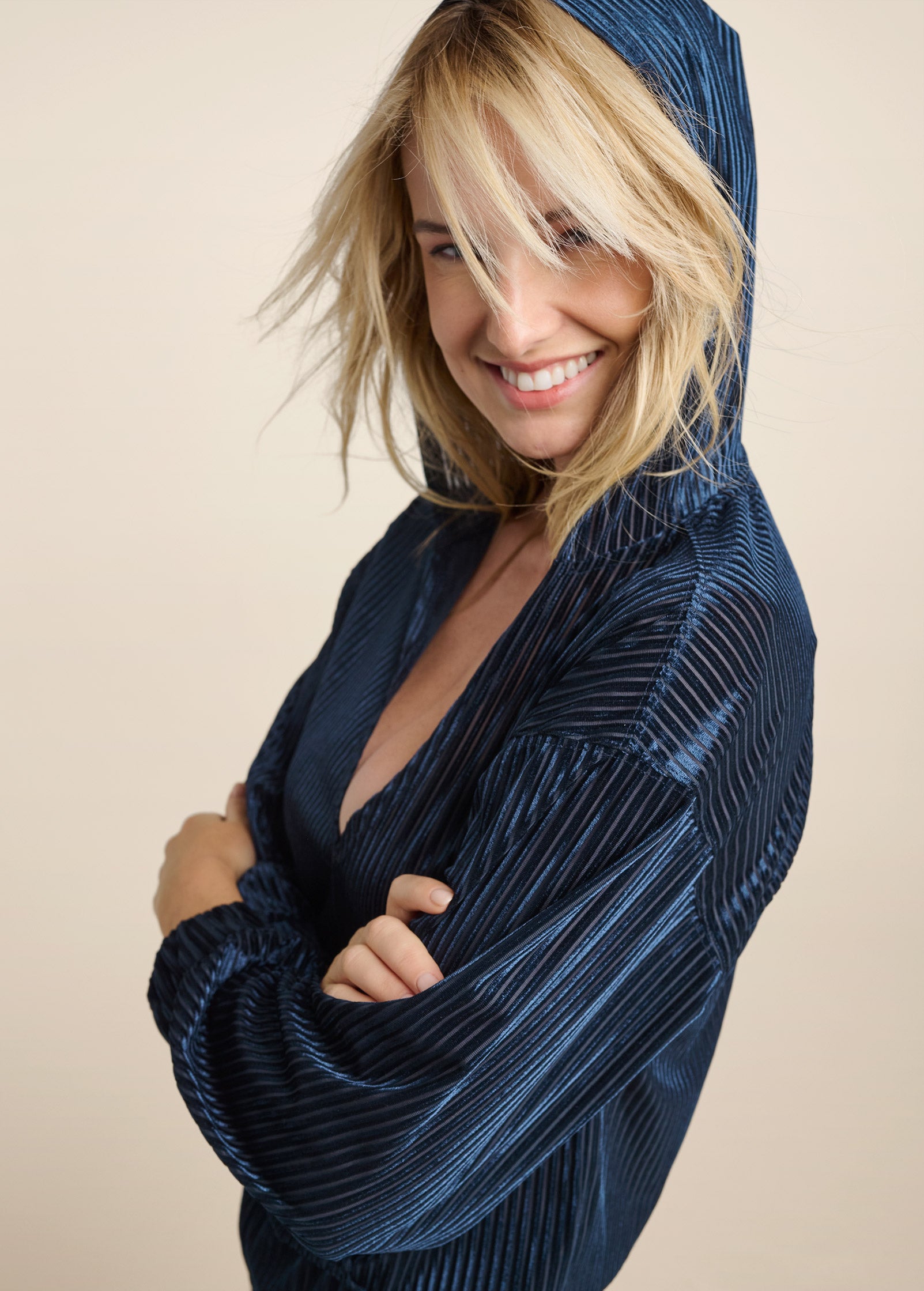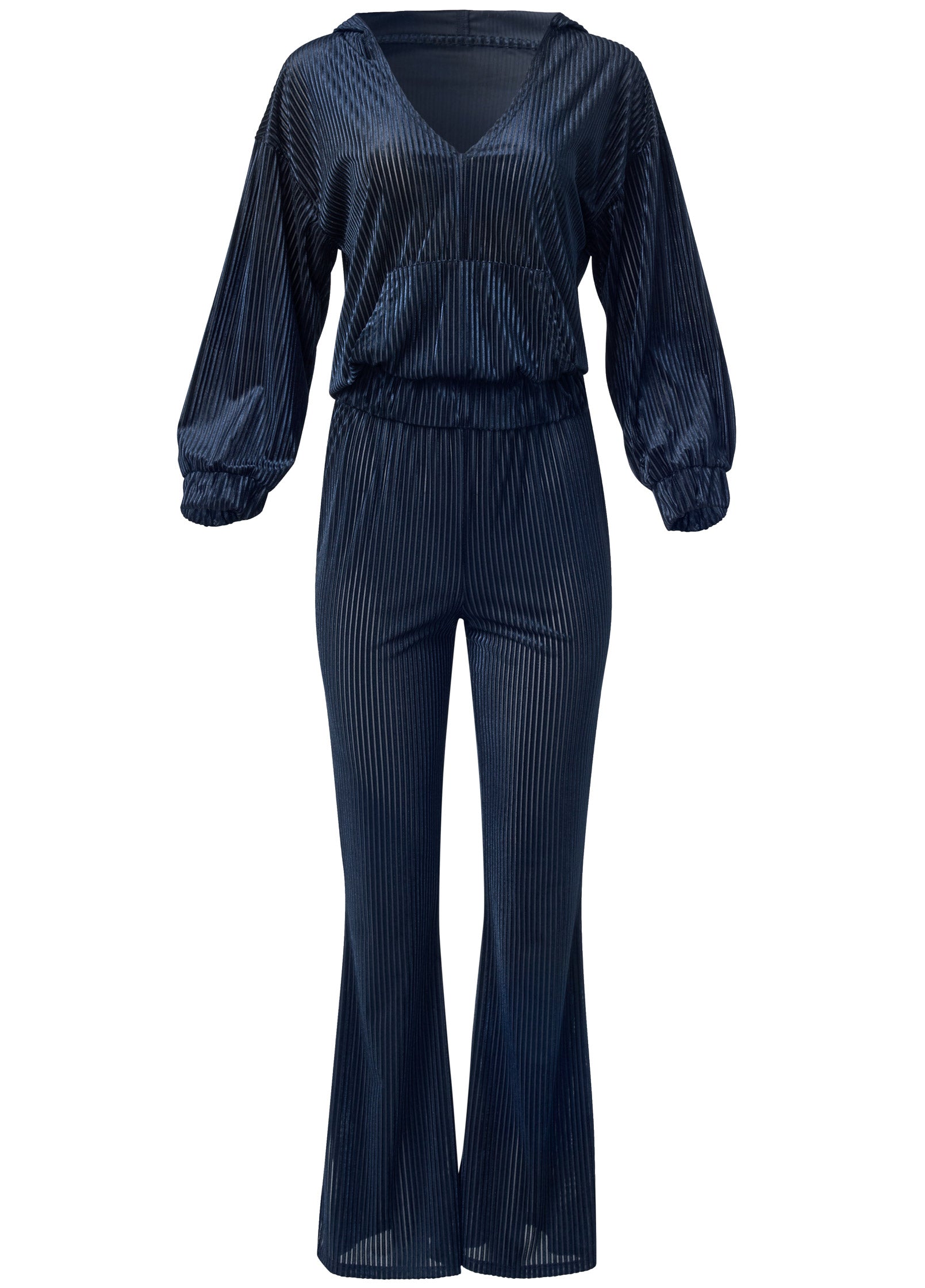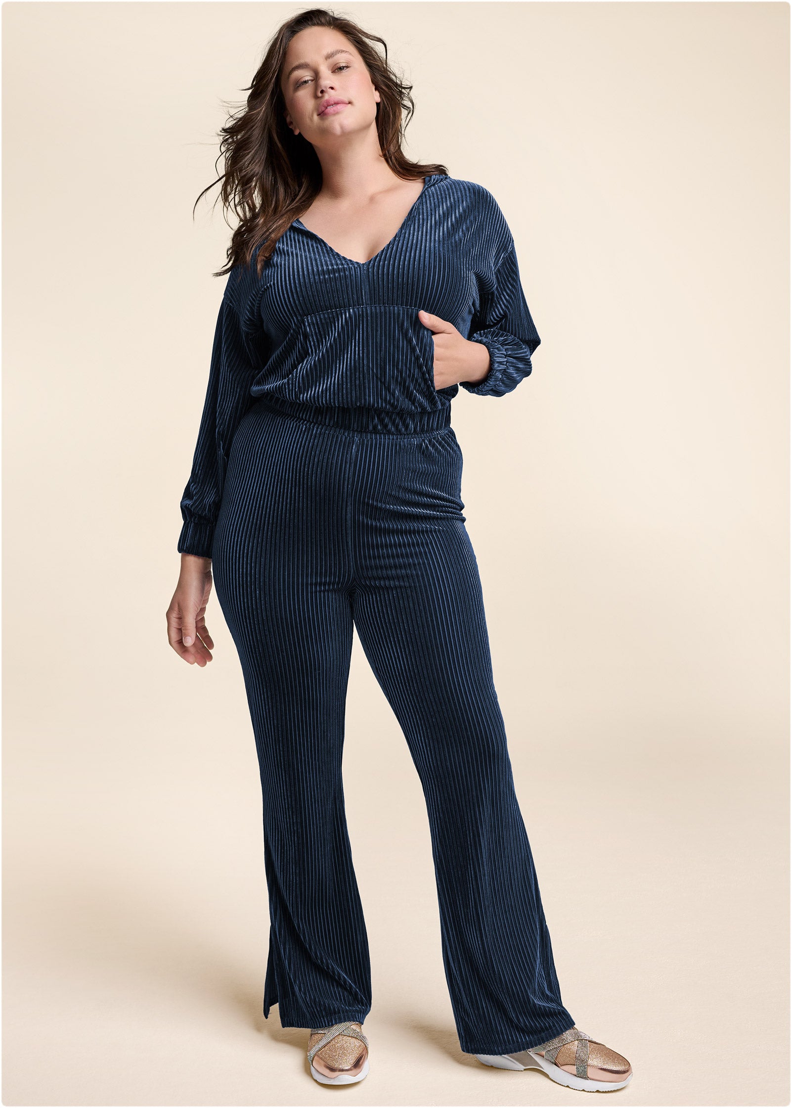 Reimagine your off-duty look in this two-piece ribbed velvet hoodie and pants set. Lightweight with a luxe sheen. this textured duo is silky to the touch and comes with a slightly-cropped V-neck pullover that features reach-in front pockets. along with elastic waist pants that flare at the slit ankle.* Sizes: XS (2). S (4-6). M (8-10). L (12-14). XL (16)* Plus sizes: 1X (18-20). 2X (22-24). 3X (26-28)* Top: 20.5" approx length* Pants: 31" inseam* Poly/spandex. Imported