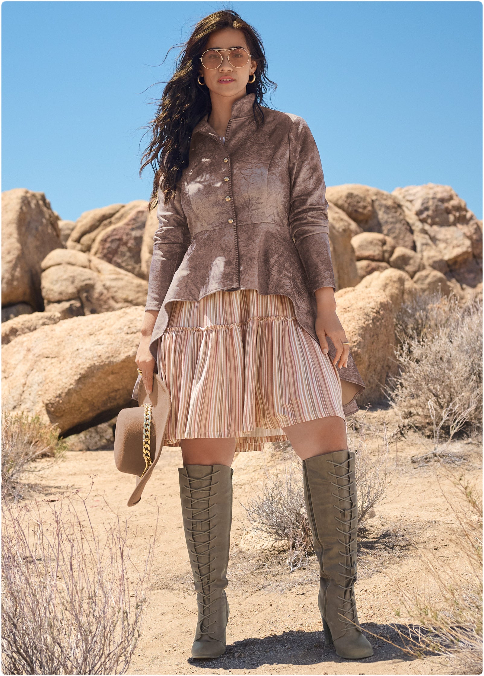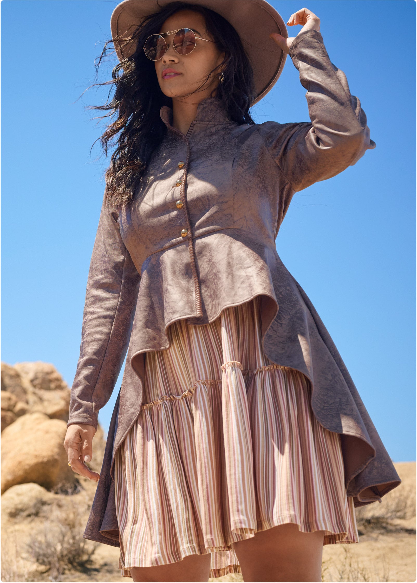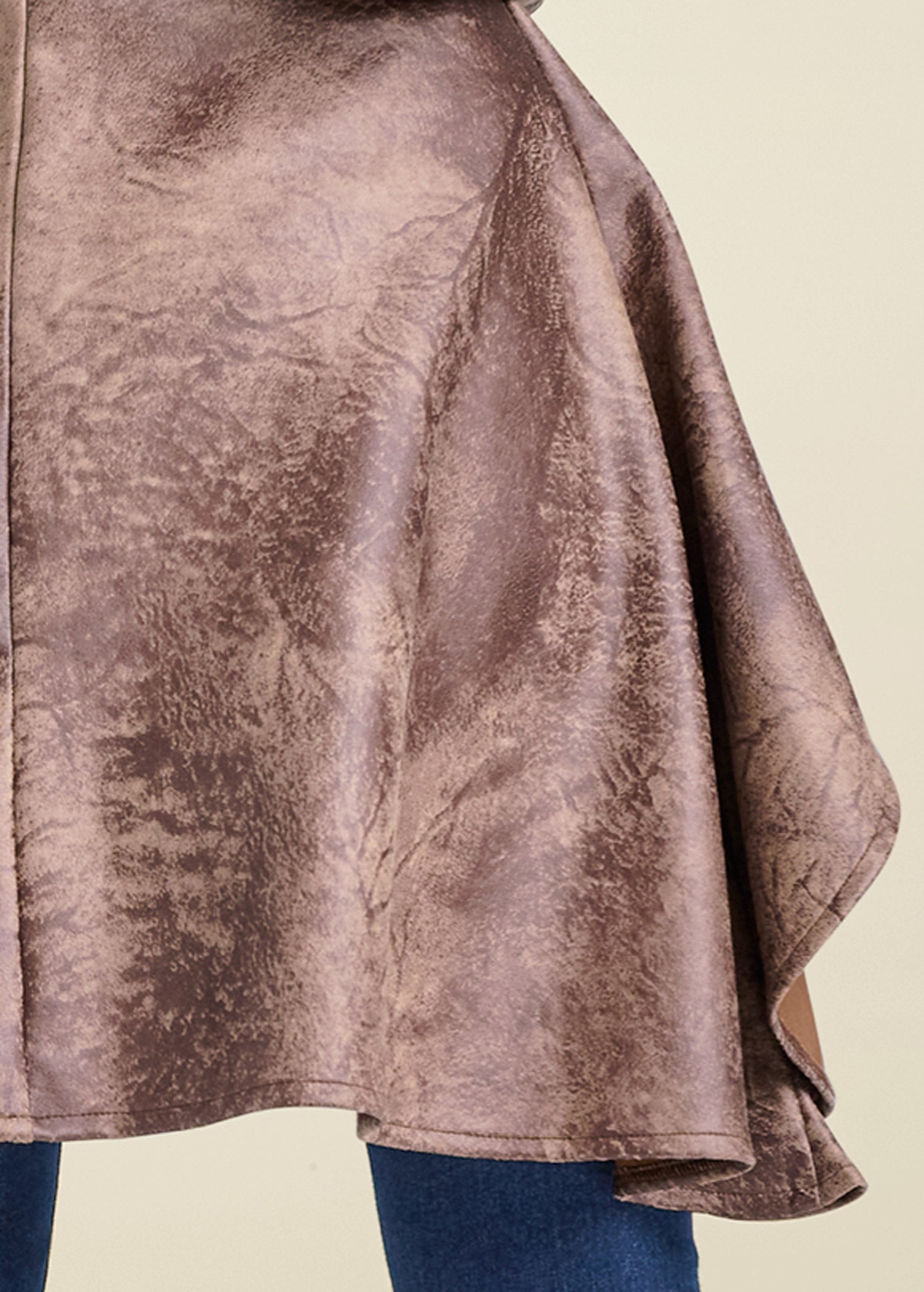 With it's high-low hem. this faux-suede trench coat assures plenty of rear coverage and a dramatic entrance! Stitched trim accents and metallic buttons adorn the front of the fitted bodice before it flares into the easy hem. Sleek faux-suede gives a sophisticated meets edgy touch to this collared topper.* Sizes: XS (2). S (4-6). M (8-10). L (12-14). XL (16)* Plus sizes: 1X (18-20). 2X (22-24). 3X (26-28)* High-low hem* Front button closure* Stitching detail at edges* 23" at shortest point; 36" at longest point* Measurements vary by size* Fabric does not have stretch* Poly/spandex. Imported