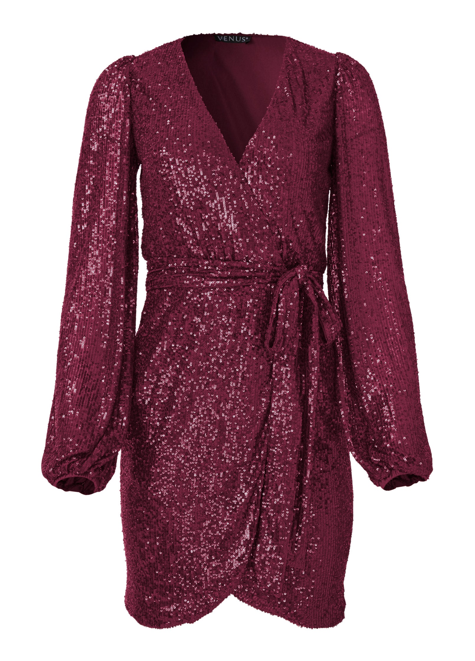 Give a toast to this head-turning mini dress. Shimmering with allover sequins. balloon-sleeves and a flouncy tulip-hem skirt add even more pizazz. Adjust the wrap silhouette to your desired fit with the sequin sash belt. Add glittering earrings plus heels. then you're set to celebrate.* Sizes: XS (2). S (4-6). M (8-10). L (12-14). XL (16)* Plus sizes: 1X (18-20). 2X (22-24). 3X (26-28)* Item runs large; size down for a better fit* Wrap silhouette* Belt tie closure* Mini length: 34.5" from shoulder* Elastic at waist and sleeve cuffs* Partially lined* Fabric has stretch* Polyester/spandex. Imported