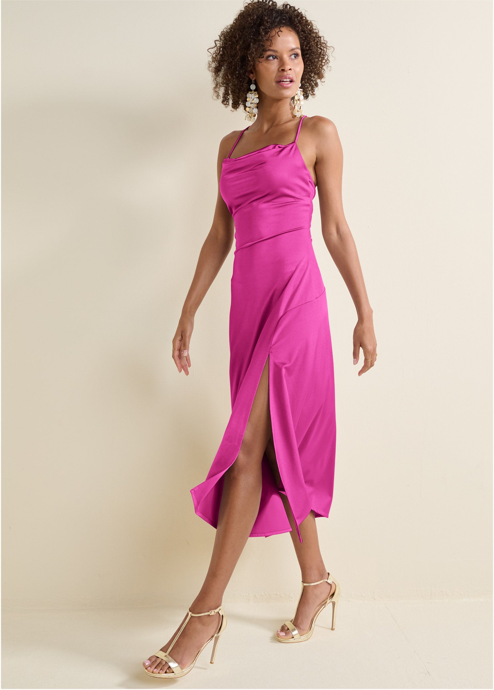 An of-the-moment midi silhouette with a high slit at the side gives this satin cowl neck dress its on-trend appeal! The sleek finish assures you shine wherever you wear it. while adjustable straps crisscross the low. open scoop back so you can find your perfect fit.* Sizes: XS (2). S (4-6). M (8-10). L (12-14). XL (16)* Plus sizes: 1X (18-20). 2X (22-24). 3X (26-28)* No closure* Slight cowl neck* Adjustable spaghetti straps crisscross at back* Side slit* 51" approx. length; varies by size* Fabric has stretch* Poly/spandex. Imported