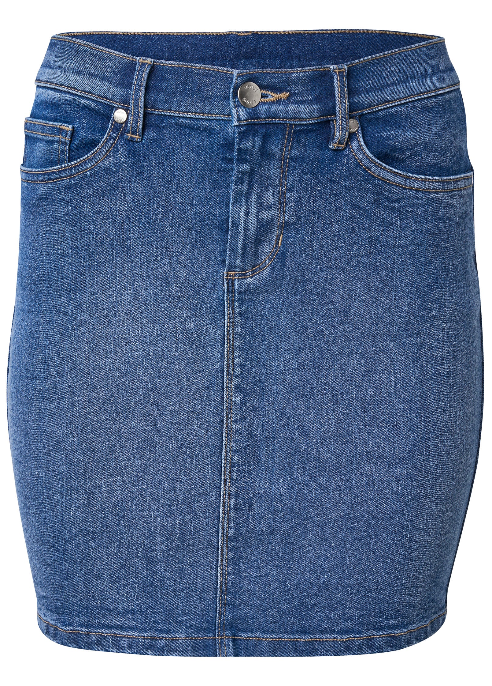 Paired with any tucked-in or loose and flirty top. this versatile denim skirt takes you from day to night. Functional pockets at the front and back show off the classic jean styling of this short and fitted skirt that gets a more dressed-up twist when worn with heels.* Button closure * Five-pocket styling * 17" approx. length; varies by size * BKAW. LW. MW: cotton/poly/elastane. Imported * All other colors: cotton/elastane. Imported
