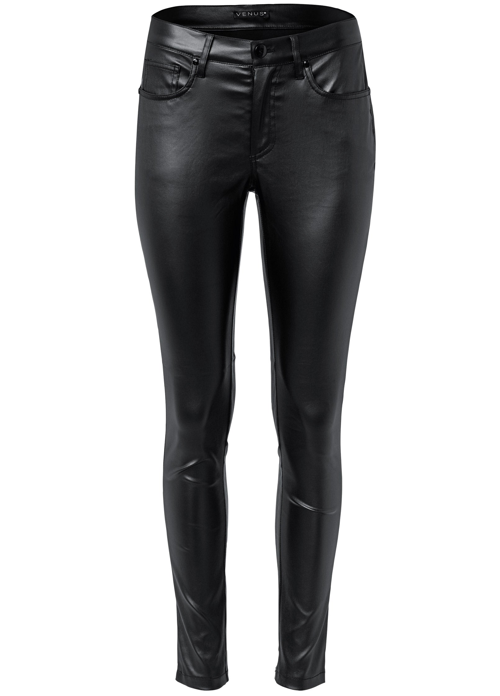Do date night or girls' night right when you slip into these sleek Faux-Leather Pants! The edgy fabrication hugs close to your curves thanks to the slim fit that tapers to the ankles: A daring silhouette that pairs perfectly with heels for a legs-for-days look.* Available in plus size* Mid rise* Five-pocket styling* Button/zipper closure* 29" inseam* Fabric has stretch* Cotton/poly/spandex. Imported