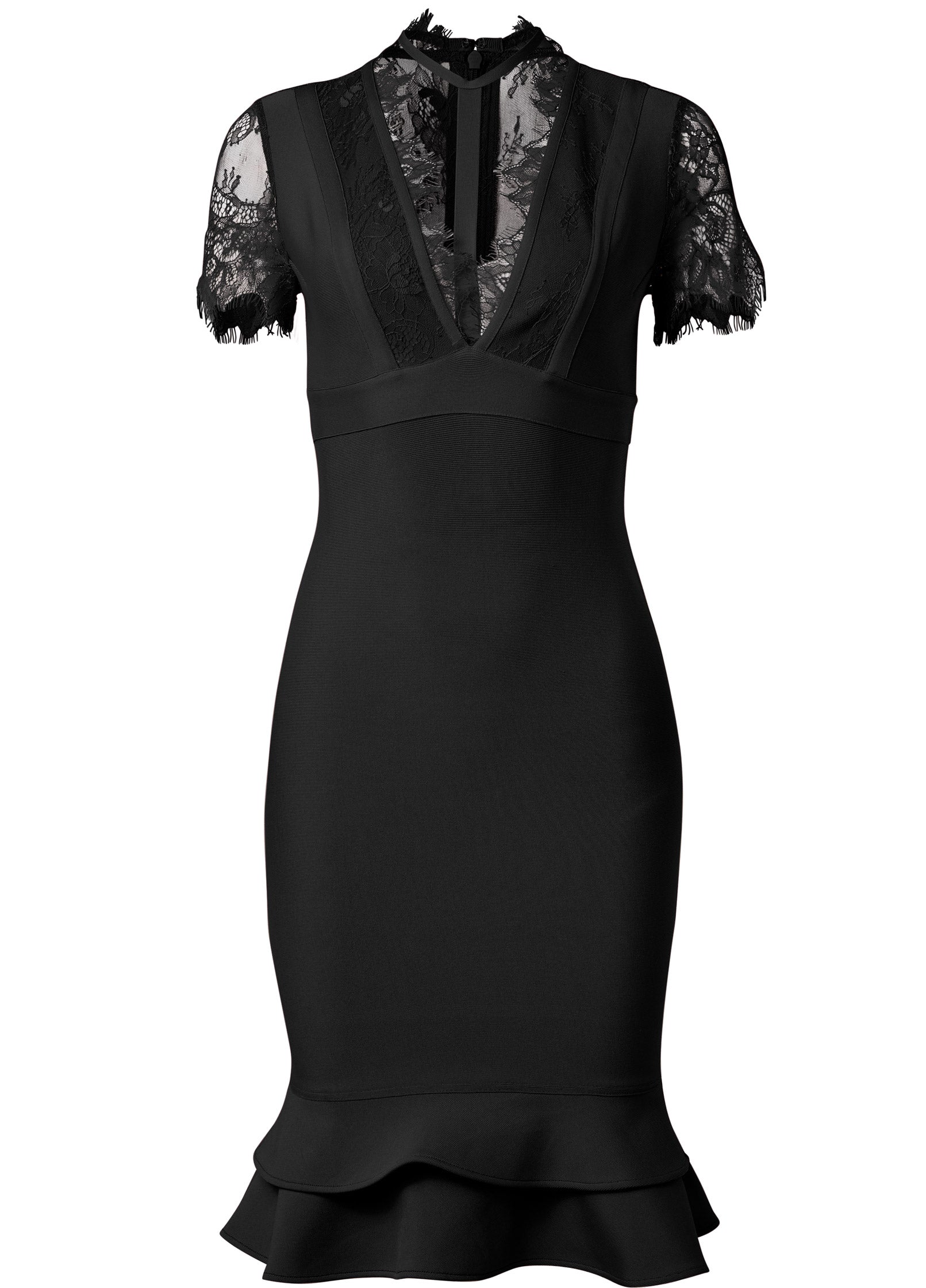 Let your curves get the attention when you zip up this bandage dress. Exclusive Hold U In lining smooths your shape with a plunging V-neck and strappy detail that gives this midi dress a Glamorous edge. Sheer. delicate lace at the neck. sleeves and back along with a ruffle hem give a feminine finishing touch.* Sizes: XS (2). S (4-6). M (8-10). L (12-14). XL (16)* Plus sizes: 1X (18-20). 2X (22-24). 3X (26-28)* Hold U In style* Lace detail at top bodice* Ruffle detail at hem* Invisible zipper at center back* Back lace is sheer* Low cut neckline; pair with VL1071 for concealed coverage* Hits at the knee 40"* Fabric has stretch* Poly/spandex. Hand wash or dry clean. Imported