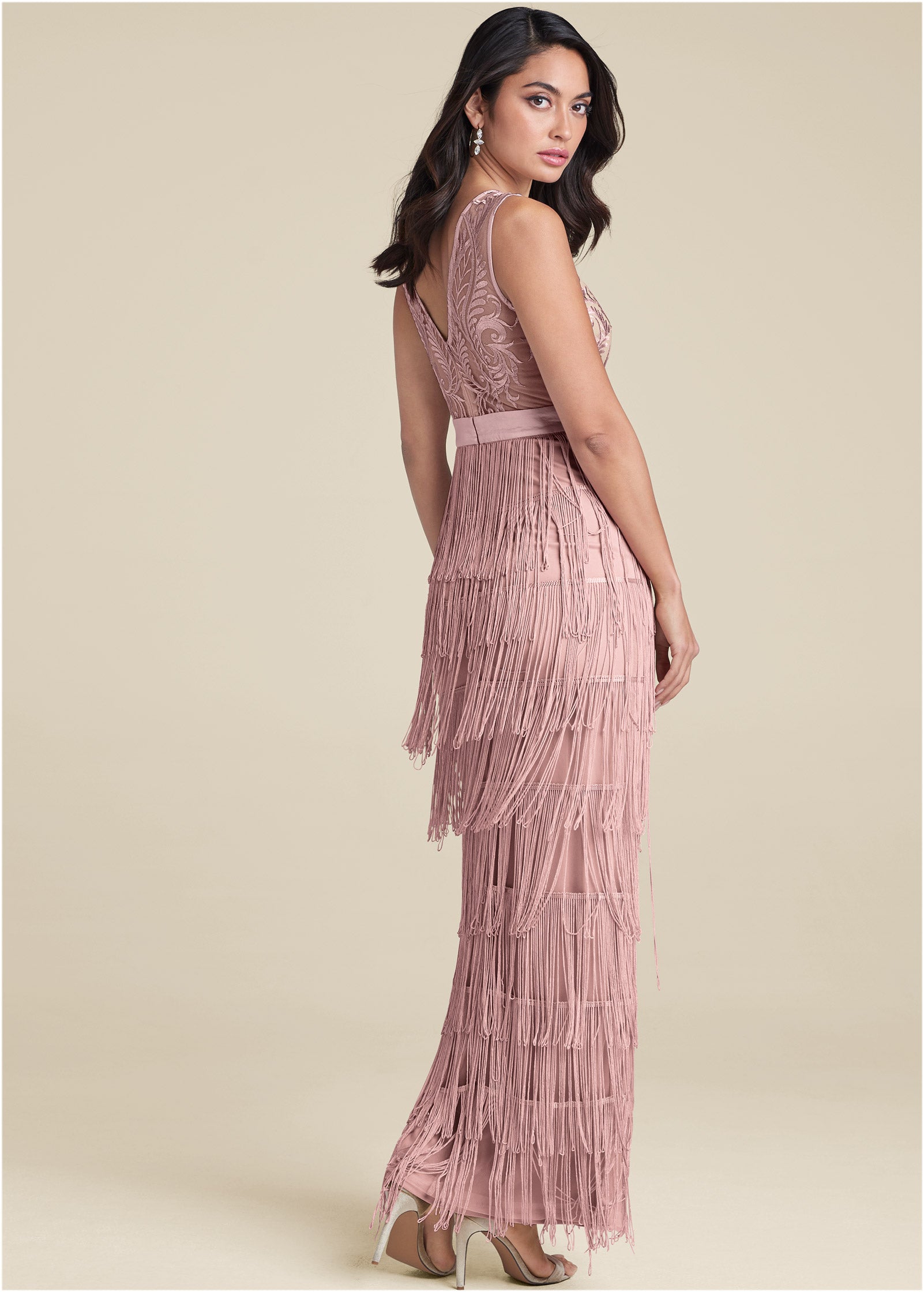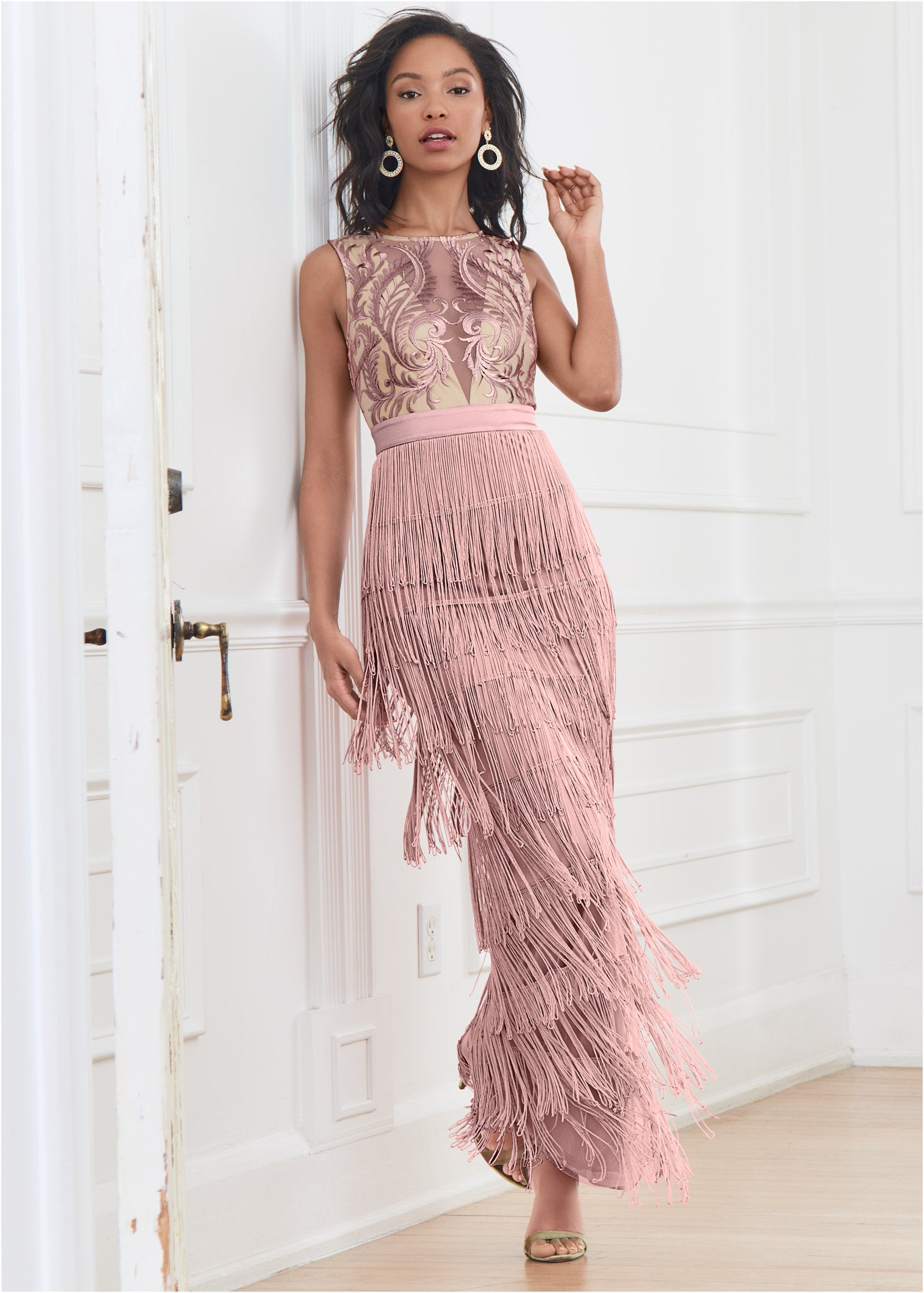 With tiers of swingy fringe. this flirty maxi dress features intricate embroidery along the sheer fabrication of the front and back panels. The plunging V-front matches the V-cut back to turn up the Glamorous before transitioning into the long. made-for-twirling skirt below a shape-defining waistband.* Item runs small; size up for a better fit* Plunging V-front and back* Back zipper closure* Tiered fringe detail at skirt* Maxi length: 61" from shoulder* Fabric has some stretch* Polyester. Imported