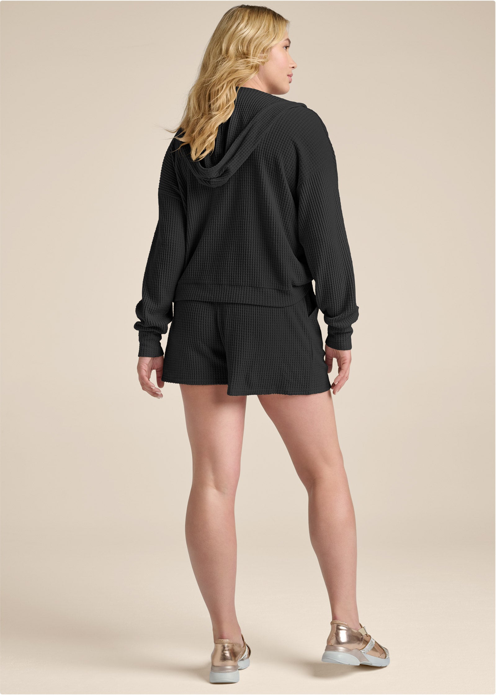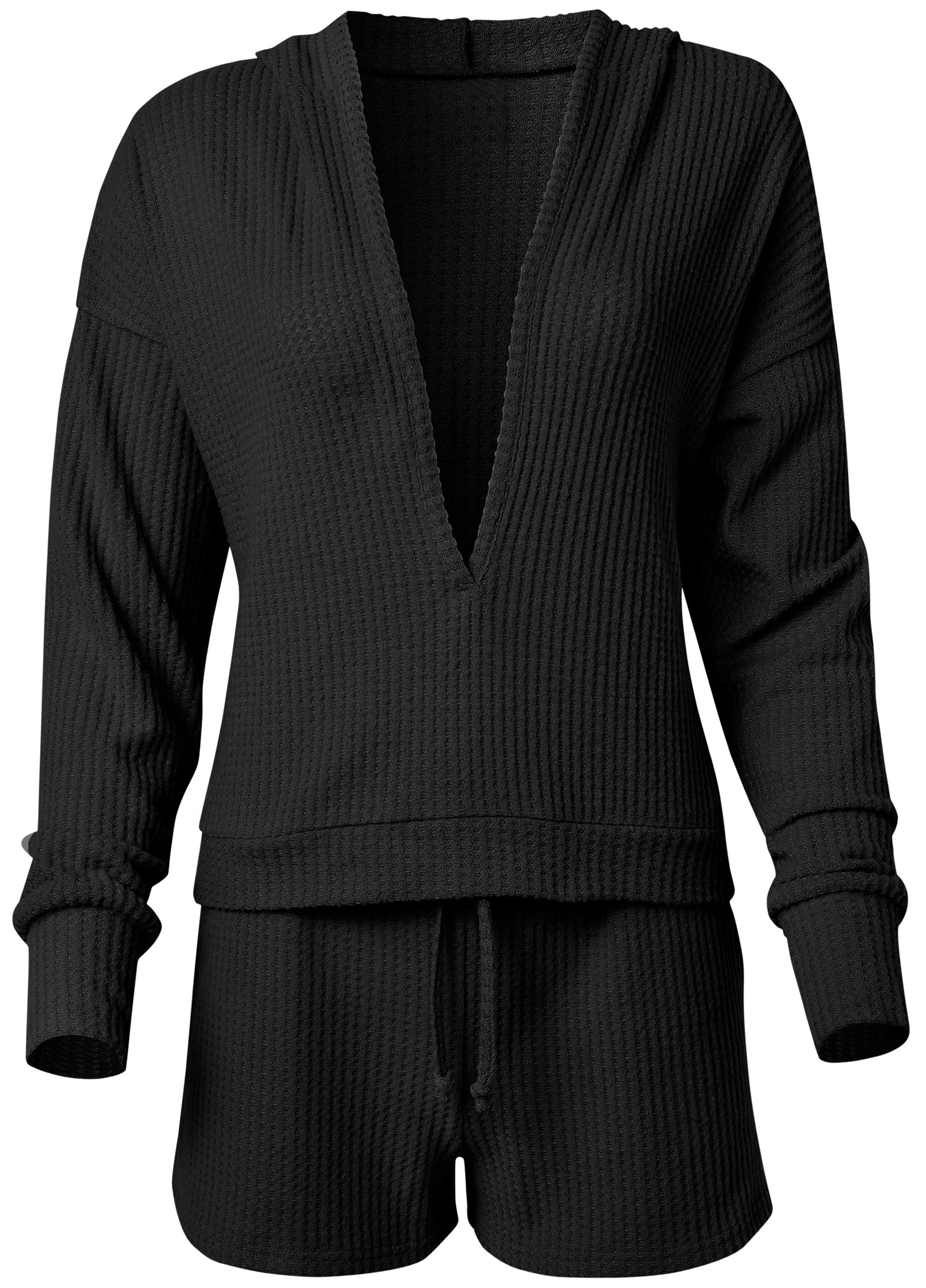 Cozy as can be. this sweatshirt and shorts set boasts super-soft brushed waffle knit fabric. The hood gives cozy coverage while the deep V-neck creates the perfect place to reveal the bralette or cami underneath. Secure the drawstring waist to keep the pocketed shorts in place through all your plans.* Sizes: XS (2). S (4-6). M (8-10). L (12-14). XL (16)* Plus sizes: 1X (18-20). 2X (22-24). 3X (26-28)* V-neck pullover sweatshirt with hood* Mid-rise shorts with adjustable drawstring waist* Front slit pockets in shorts* Top: 24" approx. length; varies by size* Shorts: 2.5" inseam* Poly/rayon/spandex. Imported