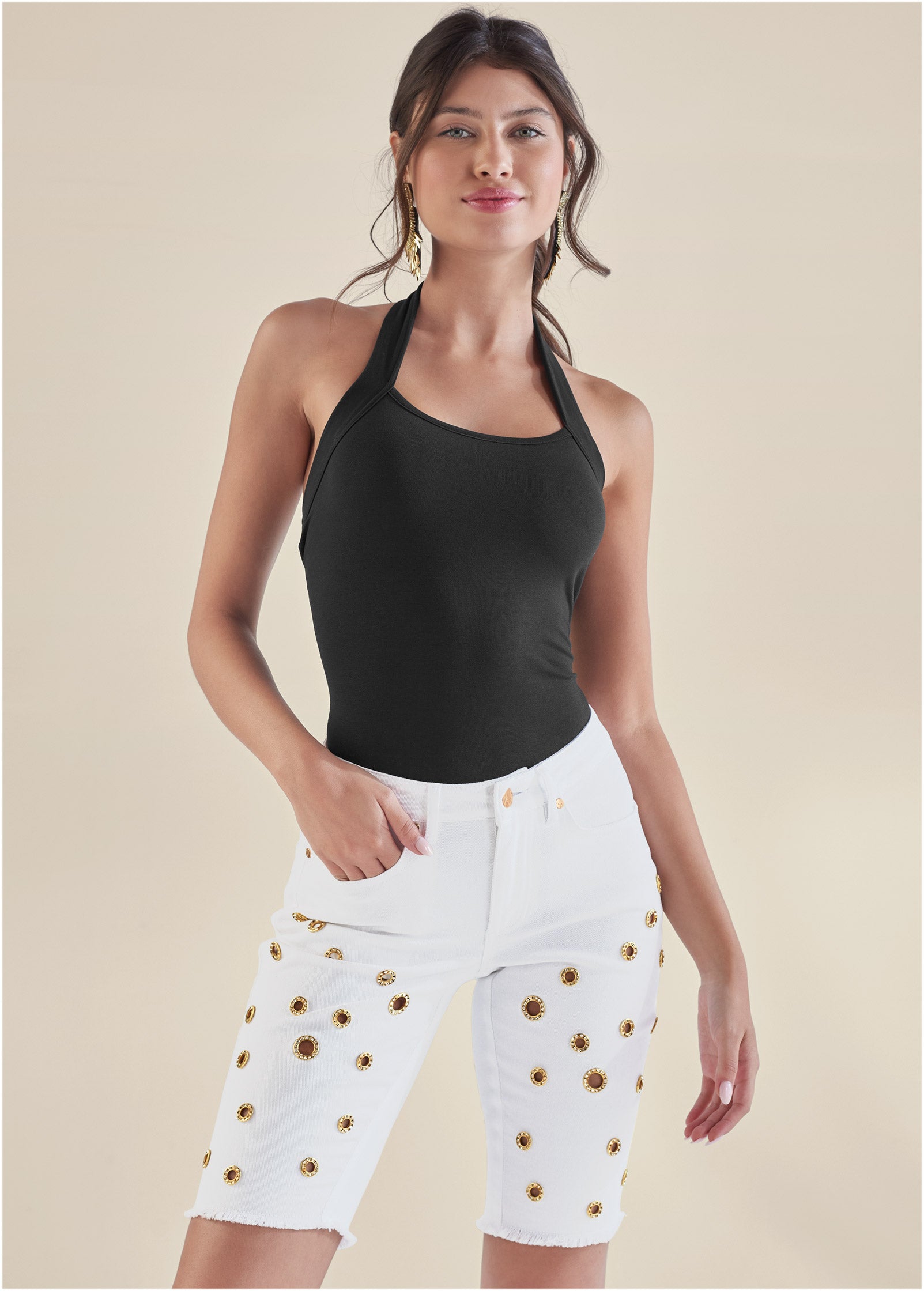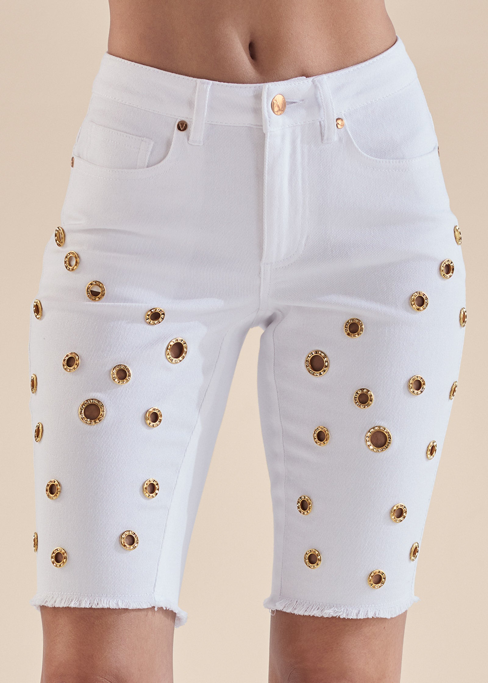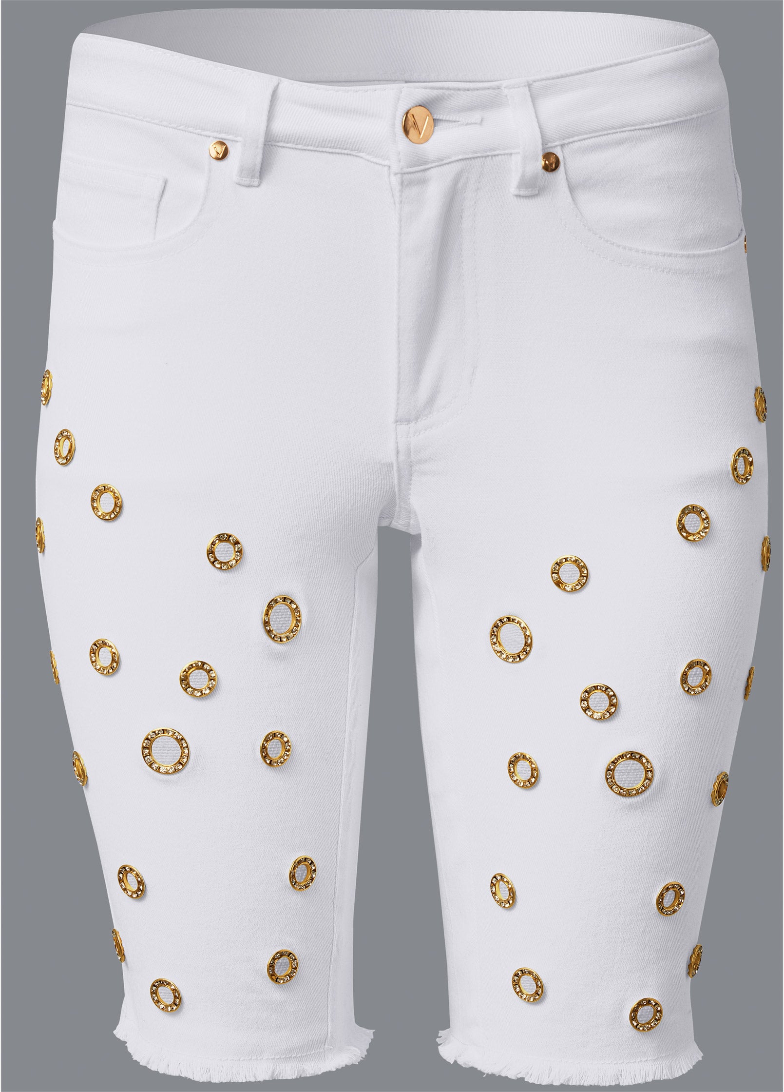 Bring on the bling in one elevated pair of shorts! With rhinestone-embellished grommets spanning the front and an edgy. unfinished hem. this Bermuda-length 5-pocket pair promises a balanced look. Tuck an understated top into the mid-rise fit that lets these shorts do all the talking!* Available in plus size* 5-pocket styling* Button/zipper closure* Mid rise* Rhinestone-embellished grommets at front* 11" inseam* Fabric has some stretch* Cotton/elastane. Imported