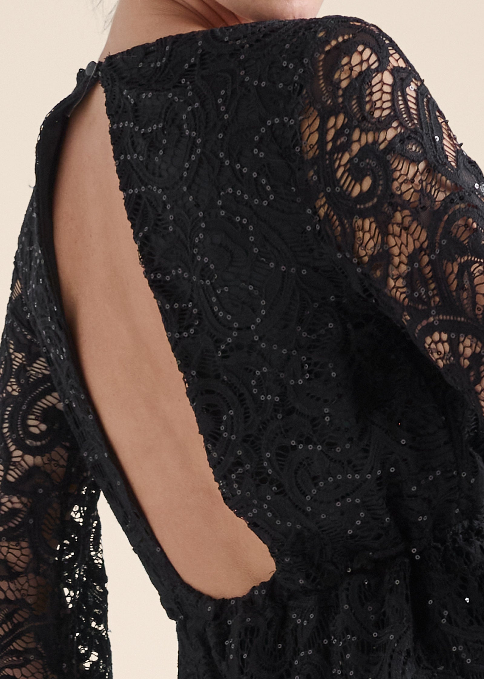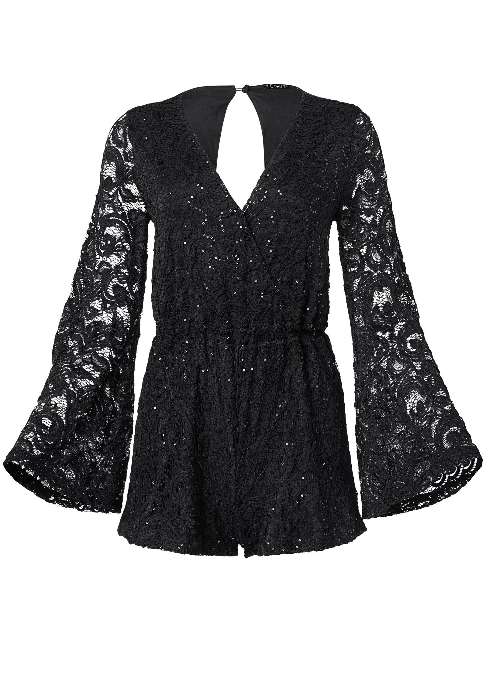 Sultry lace takes a playful turn in this long-sleeve. open-back romper. A chic party-dress alternative. this romper is fully lined except for the sheer bell sleeves and an open-back cutout that buttons behind the neck for easy wear. Sequins are sprinkled throughout this lacy look to amp up the glam.* Sizes: XS (2). S (4-6). M (8-10). L (12-14). XL (16)* Plus sizes: 1X (18-20). 2X (22-24). 3X (26-28)* Allover sequin lace* Surplice neckline* Back cutout* Elastic at waist* Bell sleeves* 3" inseam* Fabric has stretch* Polyamide/poly/elastane. Imported