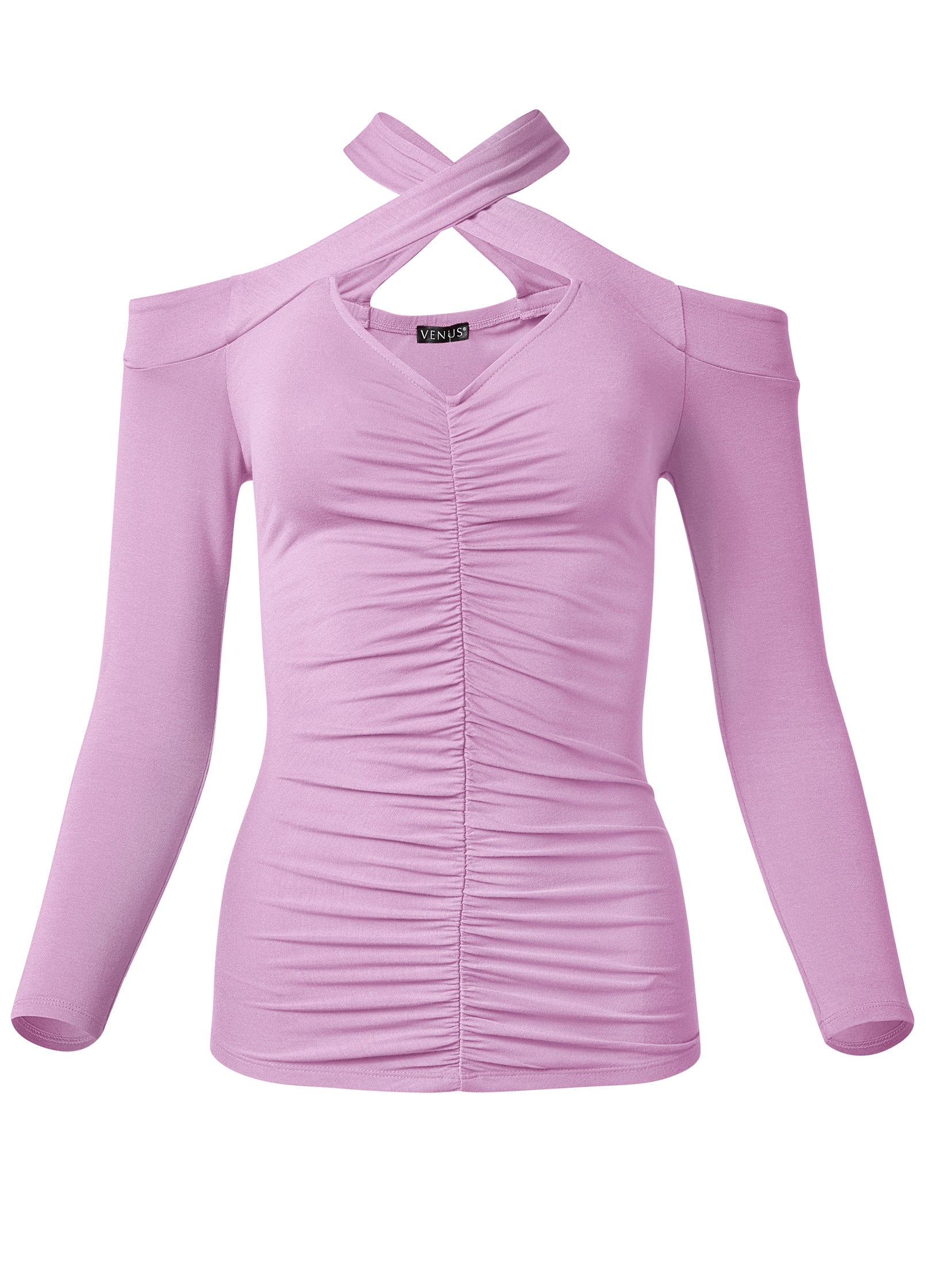 Show off your shoulders (plus a peek more) when you wear this fitted top! The crisscrossing neckline creates a front keyhole and cold-shoulder cutouts. while the vertical seam down the center connects the curve-defining ruching. Let your confidence show every time you pull on this square-back top!* Sizes: XS (2). S (4-6). M (8-10). L (12-14). XL (16) * Plus sizes: 1X (18-20). 2X (22-24). 3X (26-28)* Cross neck with keyhole cutout* Open shoulders* Center front seam with ruching* 20" approx. length; varies by size* Fabric has stretch* Ecovero viscose/spandex. Imported