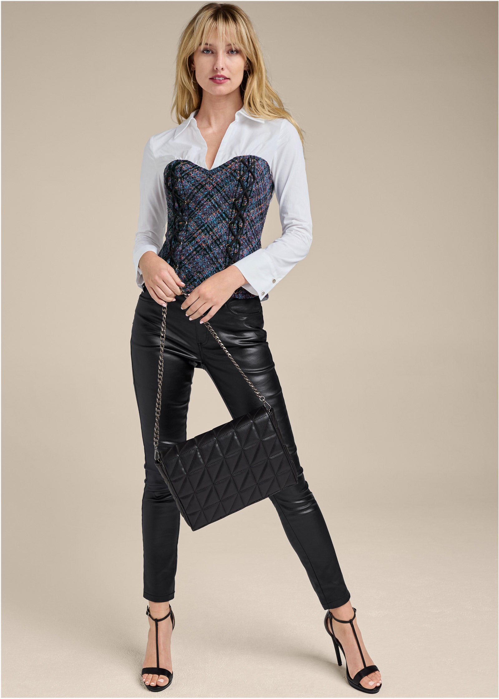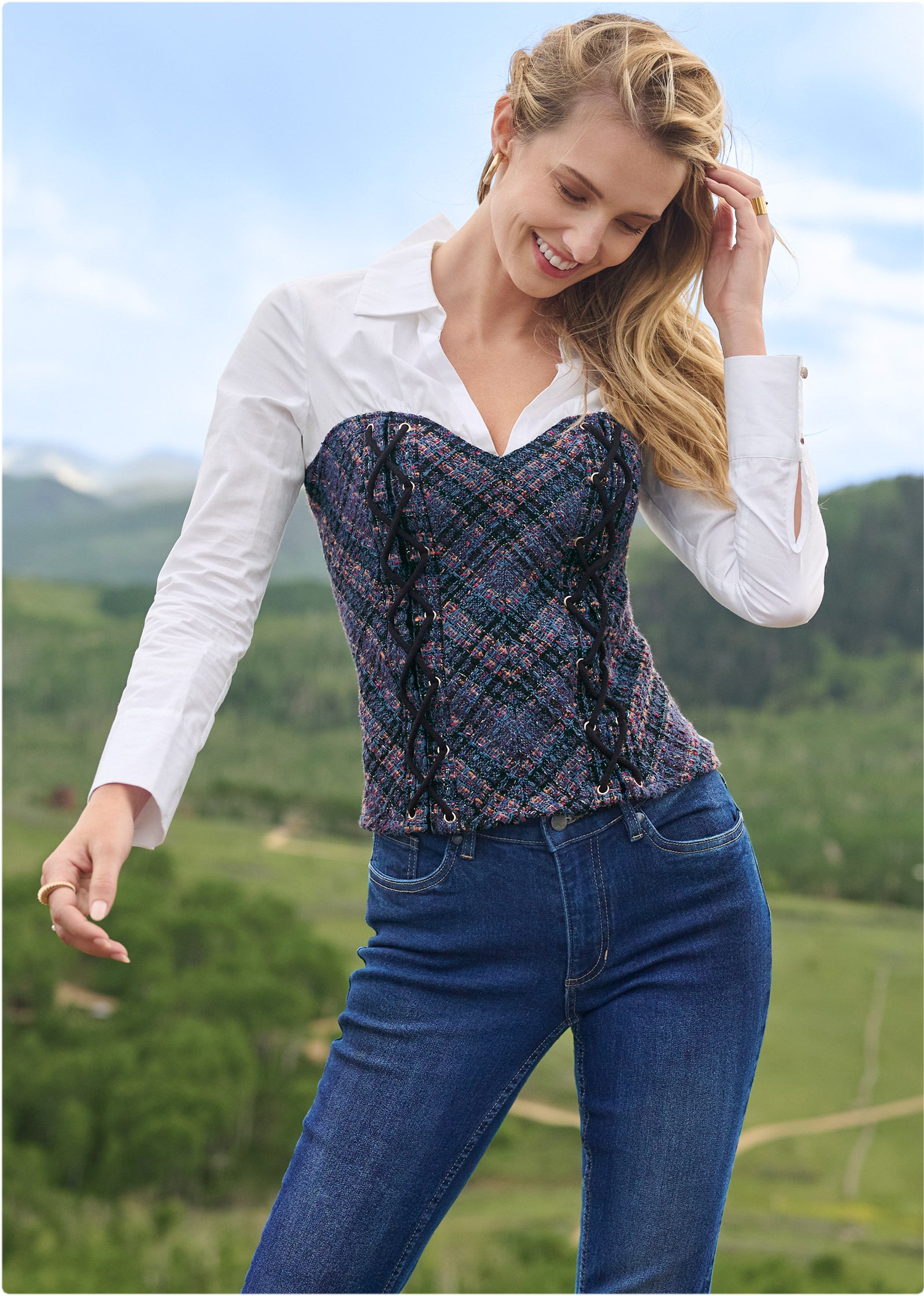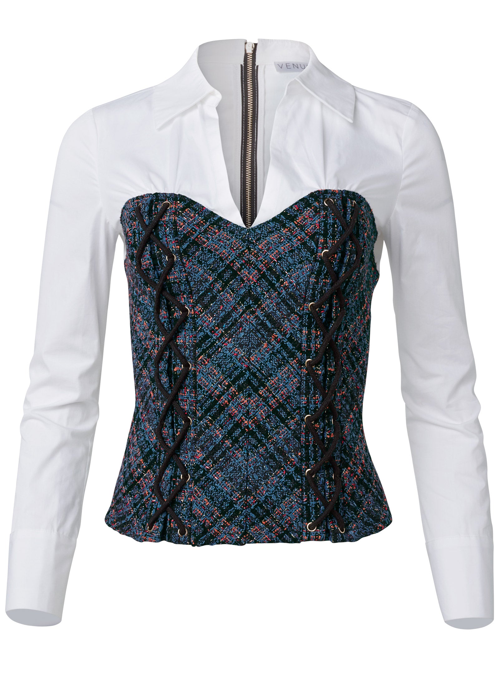 You've got a need for tweed. and this long sleeve top brings a new take to the iconic fall fabric. The classic white shirt with a deep V-neck looks like it's layered under a corset-inspired front. nailing the layering trend in one easy step. An edgy back zip closure assures this top secures without hassle.* Available in plus size* For missy sizes only; size down for a better fit* Exposed zipper closure in back* Tweed corset panel at front* 23" approx. length; varies by size* Fabric does not have stretch* Poly. Imported