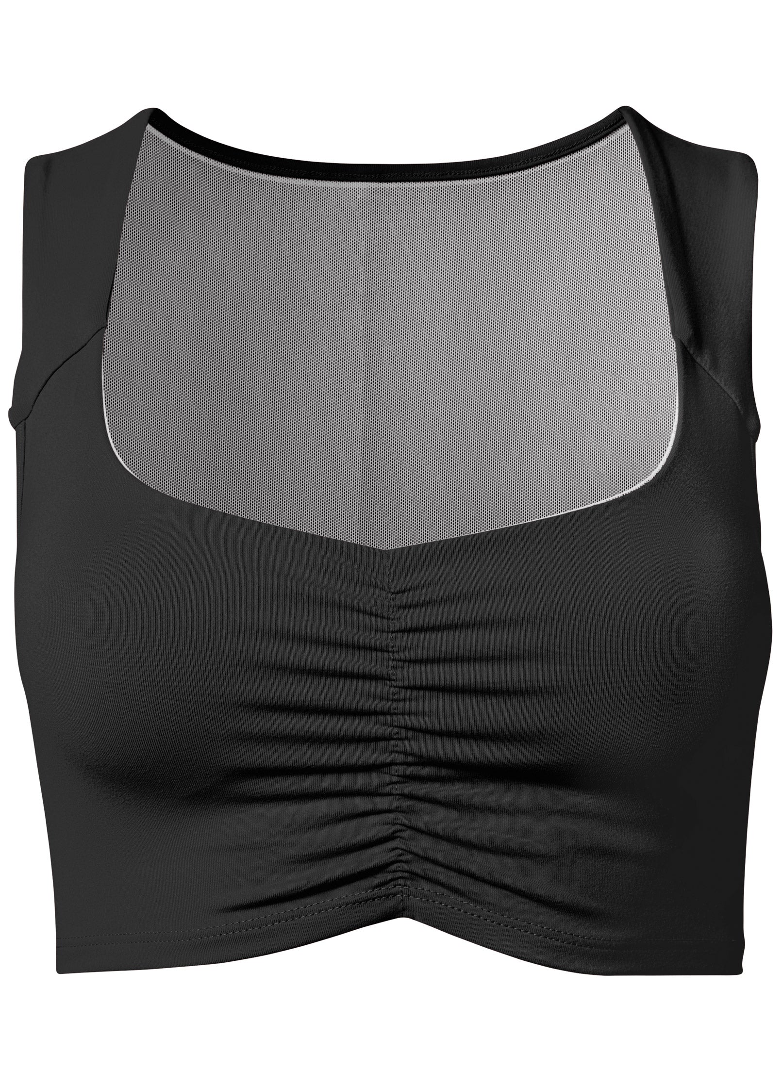 From workout to wherever. this cropped sports top is both flattering and supportive! Ruching across the bust smooths. while wide shoulder straps and full back provide lift and support as you move. Wear alone with high-waist leggings or layer up and let this feminine top peek through.* Sizes: XS (2). S (4-6). M (8-10). L (12-14). XL (16) * Plus sizes: 1X (18-20). 2X (22-24). 3X (26-28)* Scoop neckline with ruched front* Full back coverage* 13" approx. length; varies by size* Fabric has stretch* Nylon/spandex. Imported