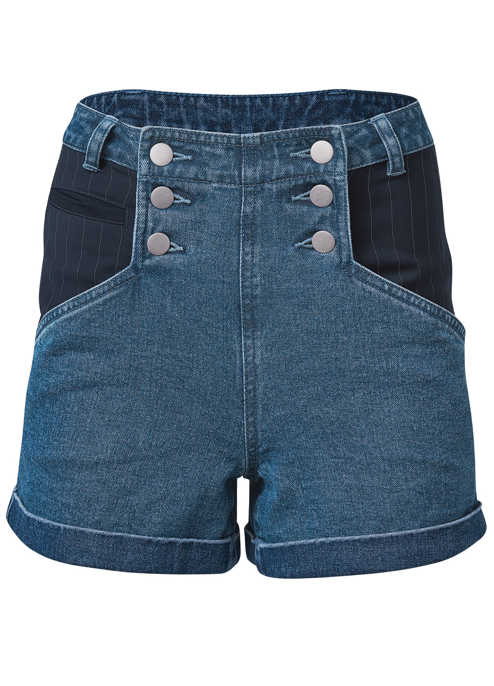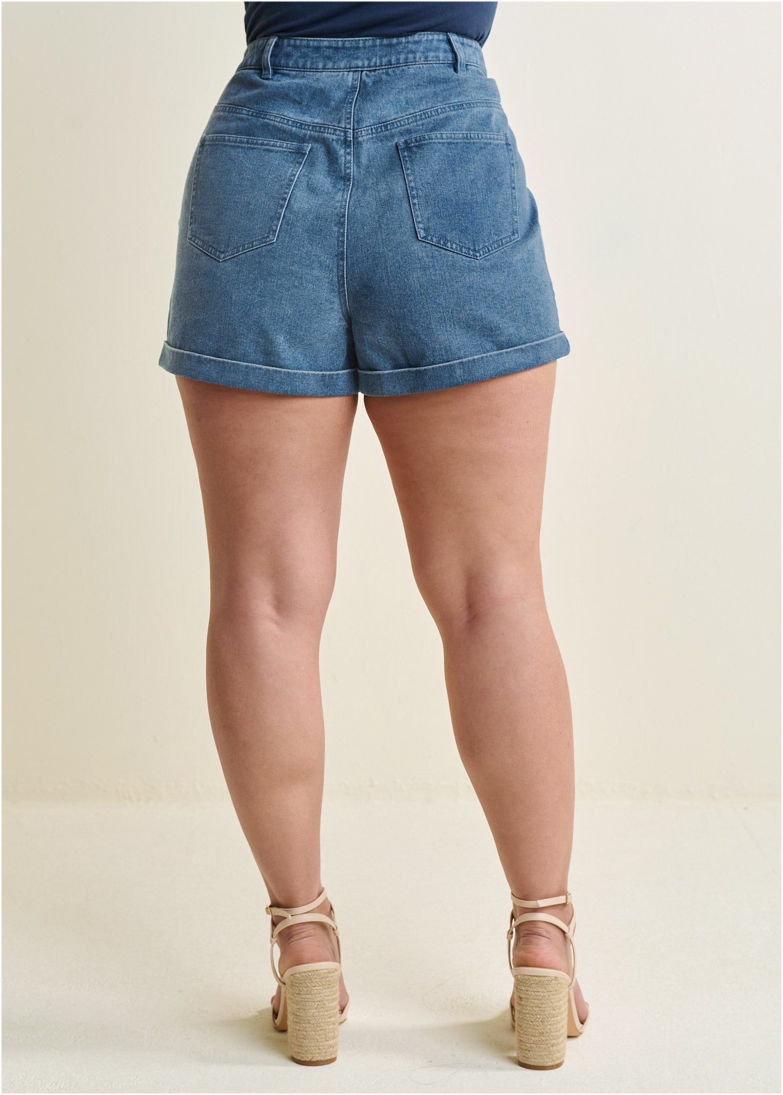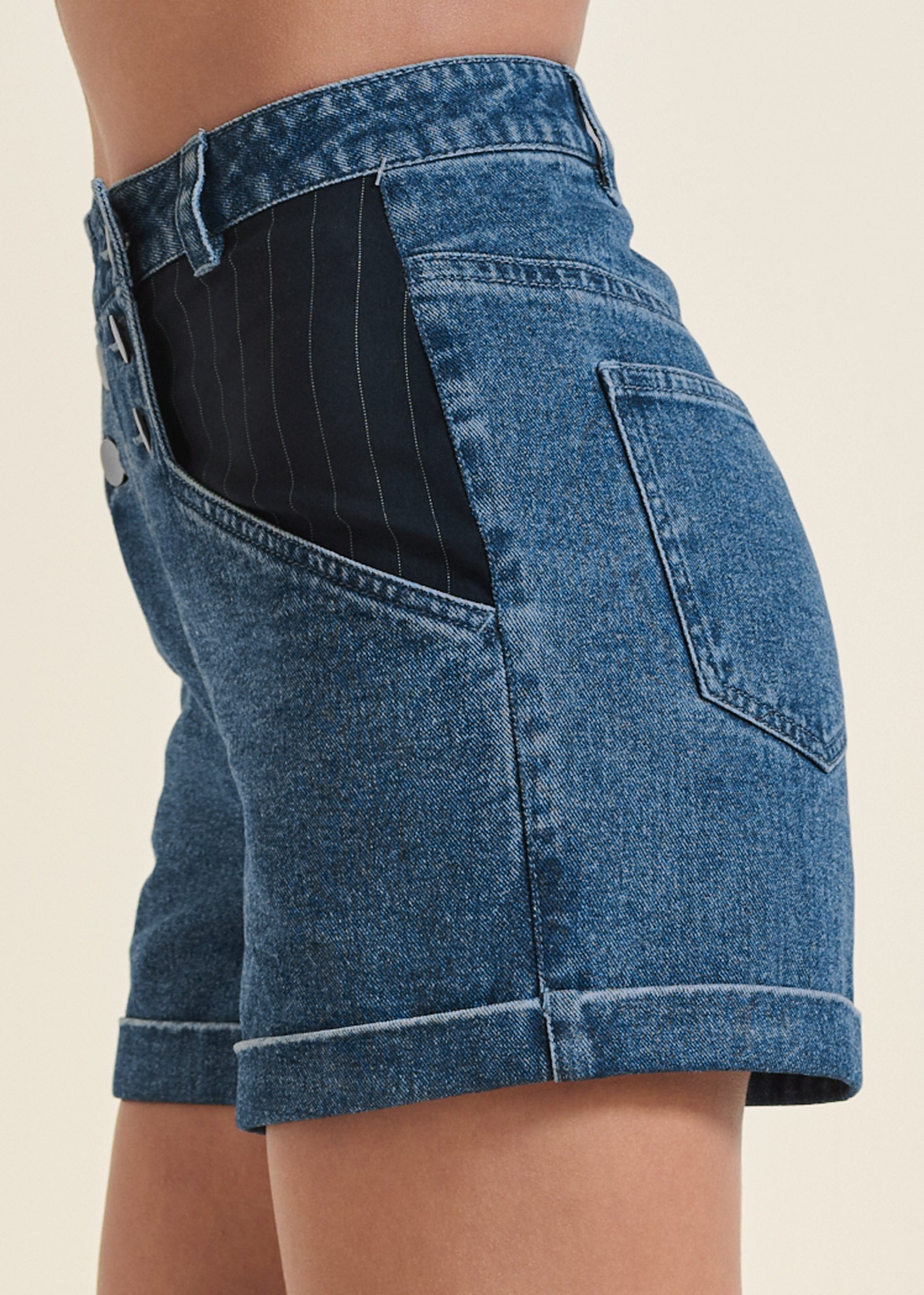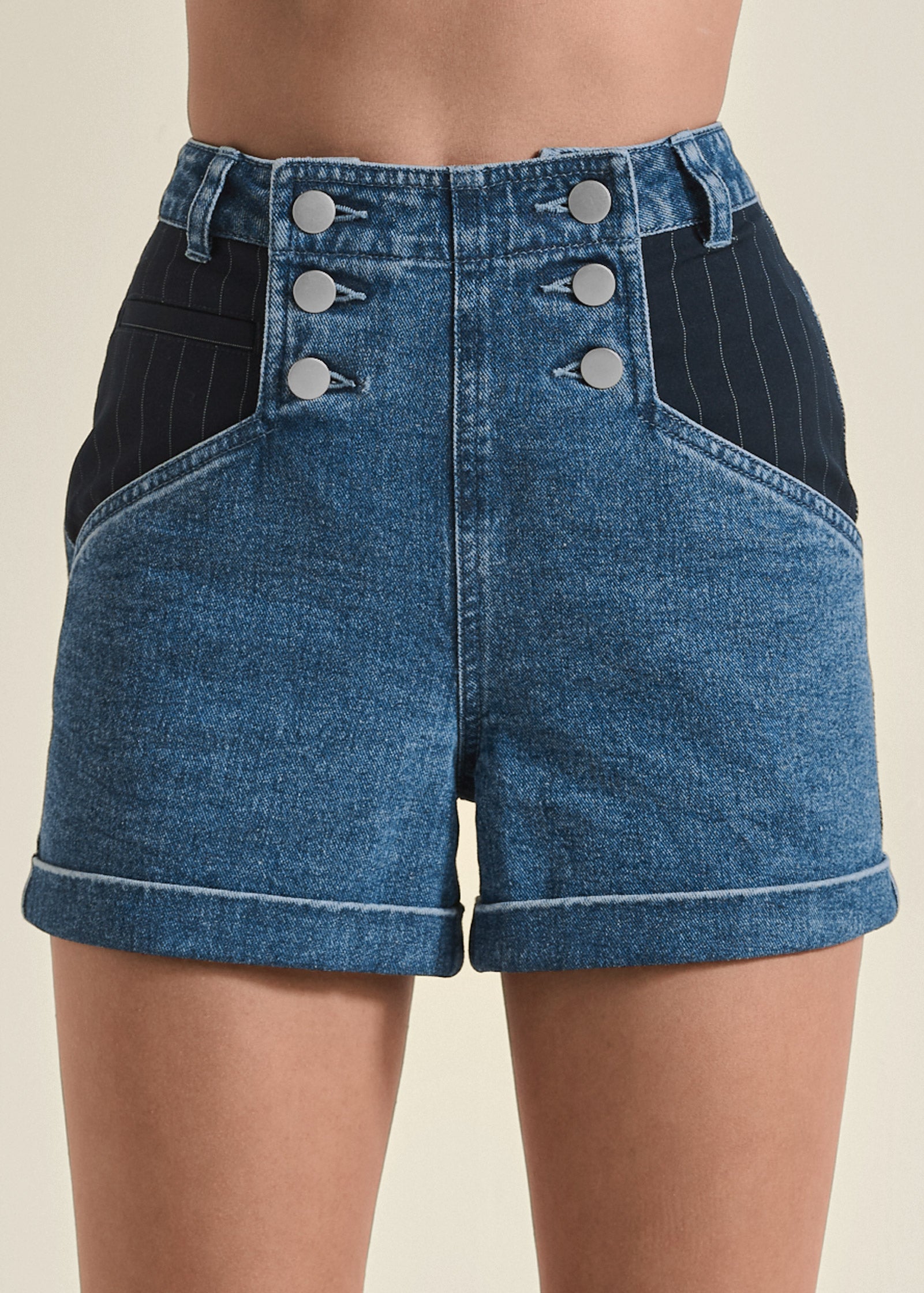 Upgrade your go-to denim shorts with elevated pinstripe insets! This cuffed pair is complete with pinstripe fabric at the hips. contrasting the classic look of jean shorts. The front button closures add nautical inspiration to this high-waist pair that sets your outfit apart.* Available in plus sizes* High rise* Cuffed hem* Button front closure* Back pockets* Pinstripe insets at hips* 3" inseam* Pinstripe insert has stretch; 100% cotton denim does not* Cotton. Imported