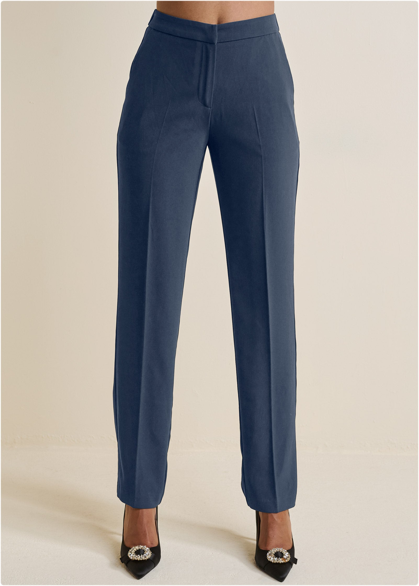 Weekend wear meets work-week chic in these casual straight-leg trousers! Comfortable. stretchy fabric feels like you're lounging. but the flat front assures a tailored look for going out and about. Thanks to the high waist and tapered leg. these pants promise an elevated silhouette you'll want to wear every day of the week.* Available in plus sizes* Elastic back waist* Decorative back pockets* Zipper/button closure* 32" inseam* Fabric has stretch* Poly/elastane. Imported