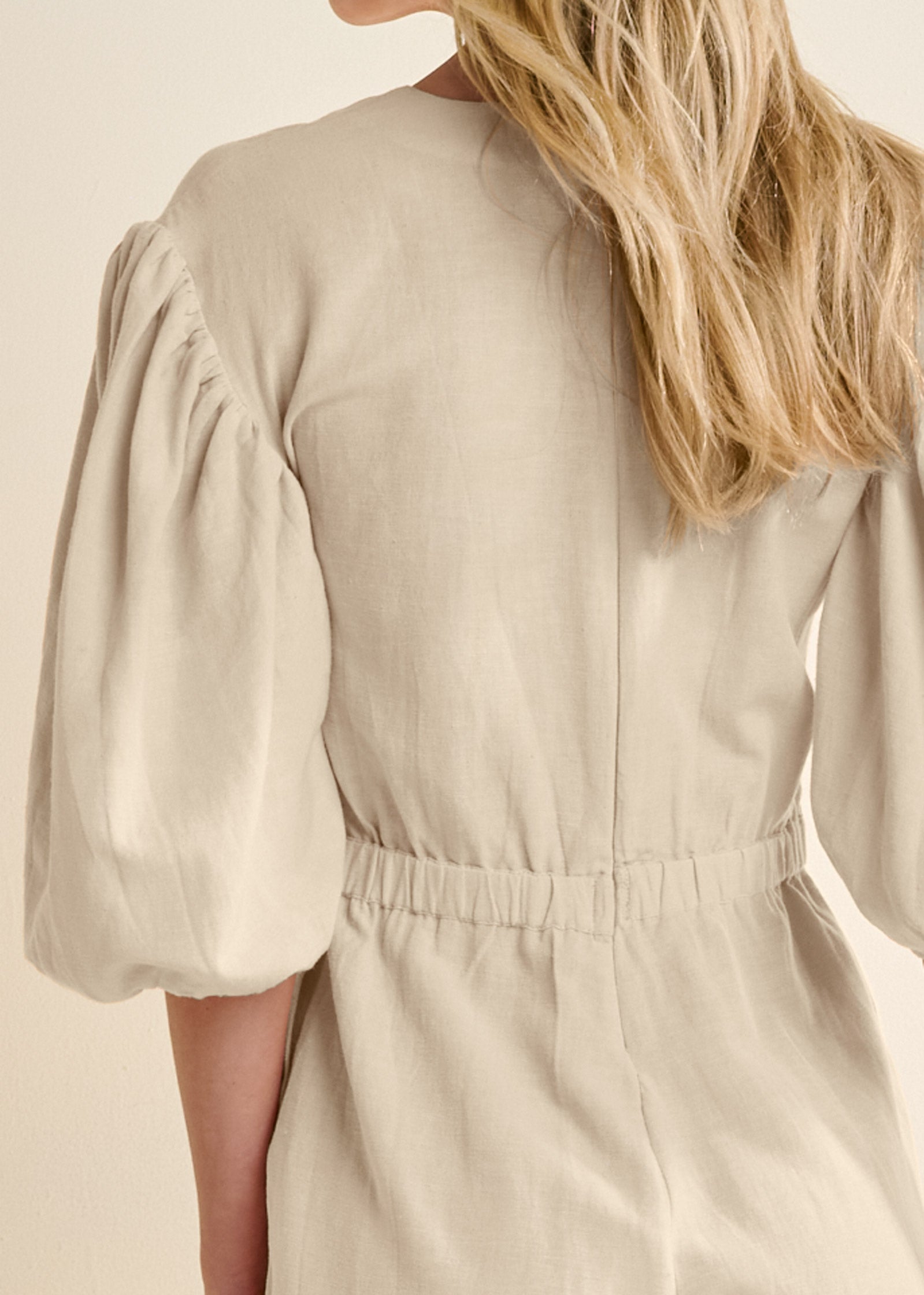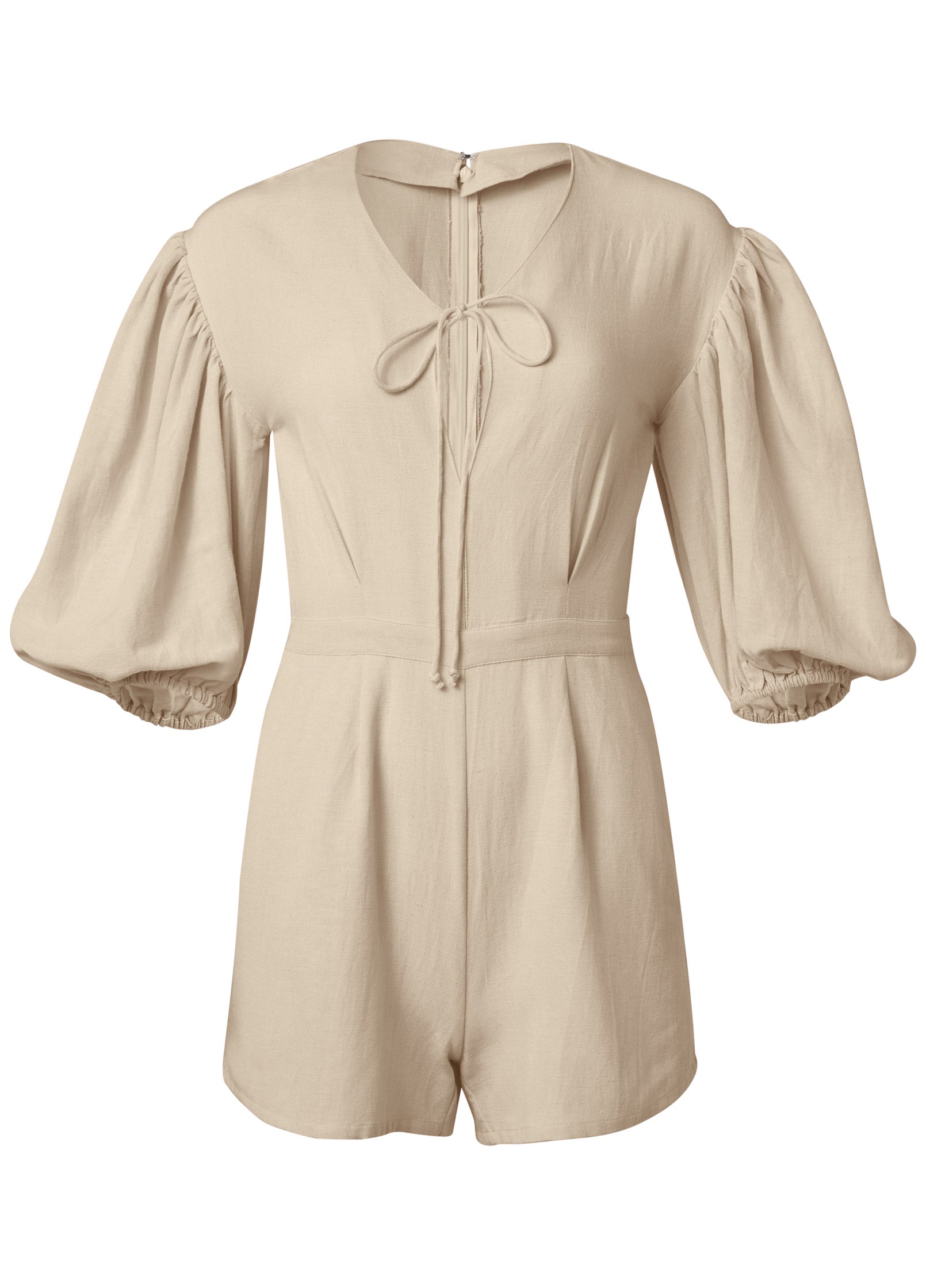 Fabricated in lightweight linen that you can dress up or down. this 3/4 sleeve romper makes outfit-planning easy. The minimalist silhouette gets a chic update with a front keyhole and tie. while drop-shoulder balloon sleeves bring volume to the understated look. Add sparkling extras to make it your own!* Item runs small; size up for a better fit* Front keyhole with tie* 3/4 balloon sleeves* Invisible back zipper closure* Elastic at back waistband* 2.5" inseam* Fabric does not have stretch* Viscose/cotton/linen. Imported