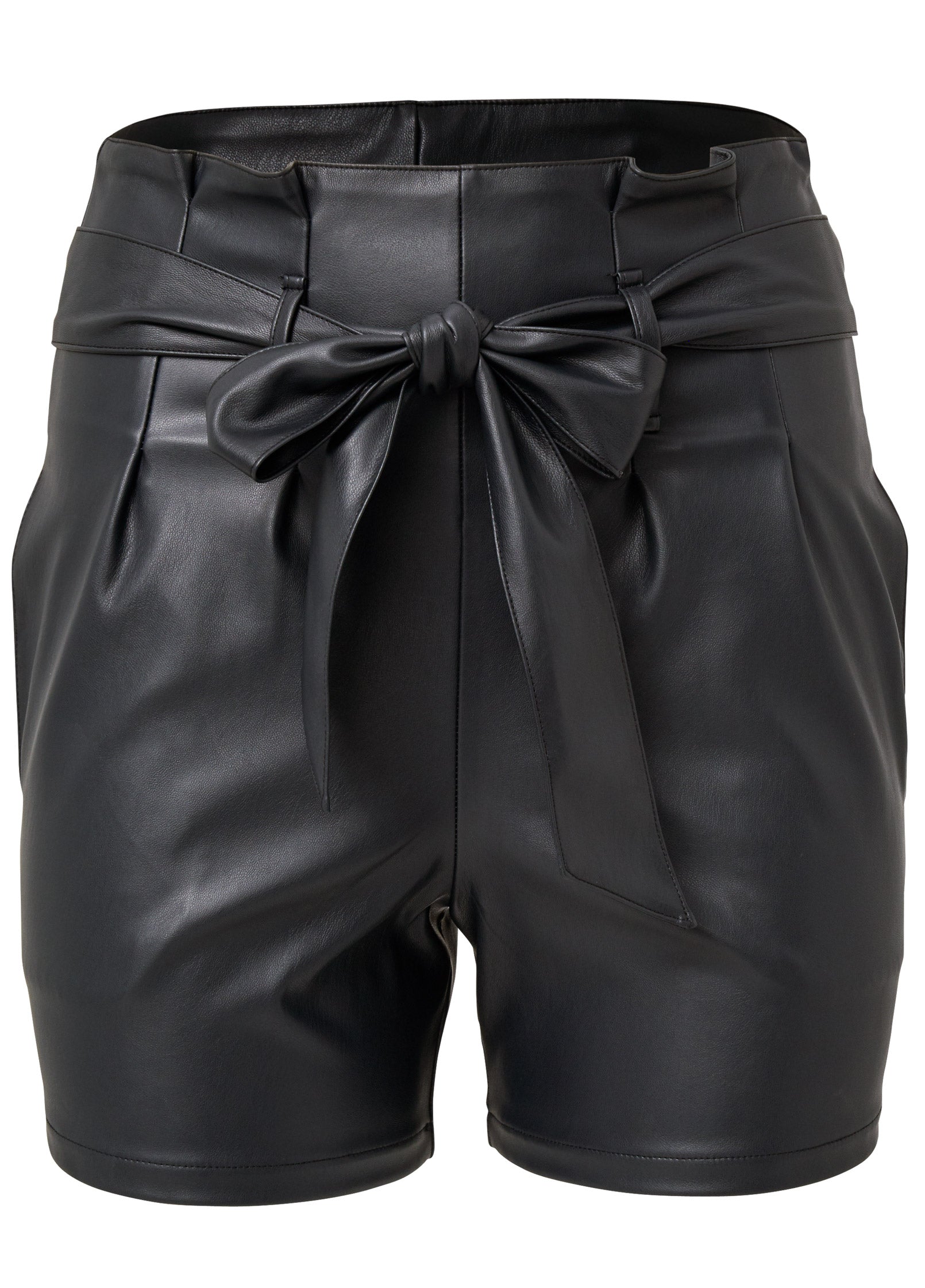 Embrace the edgy vibe of faux leather in these curve-skimming belted shorts! The flattering paperbag waist with its sash tie belt is made for tucking in a smooth top that spotlights your shape. Complete with in-demand side pockets. these shorts are a must-have addition to your wardrobe.* Sash tie belt included* High-waist* Two side pockets* Side zipper closure* 3.5" approx. inseam; varies by size* Polyurethane. Imported