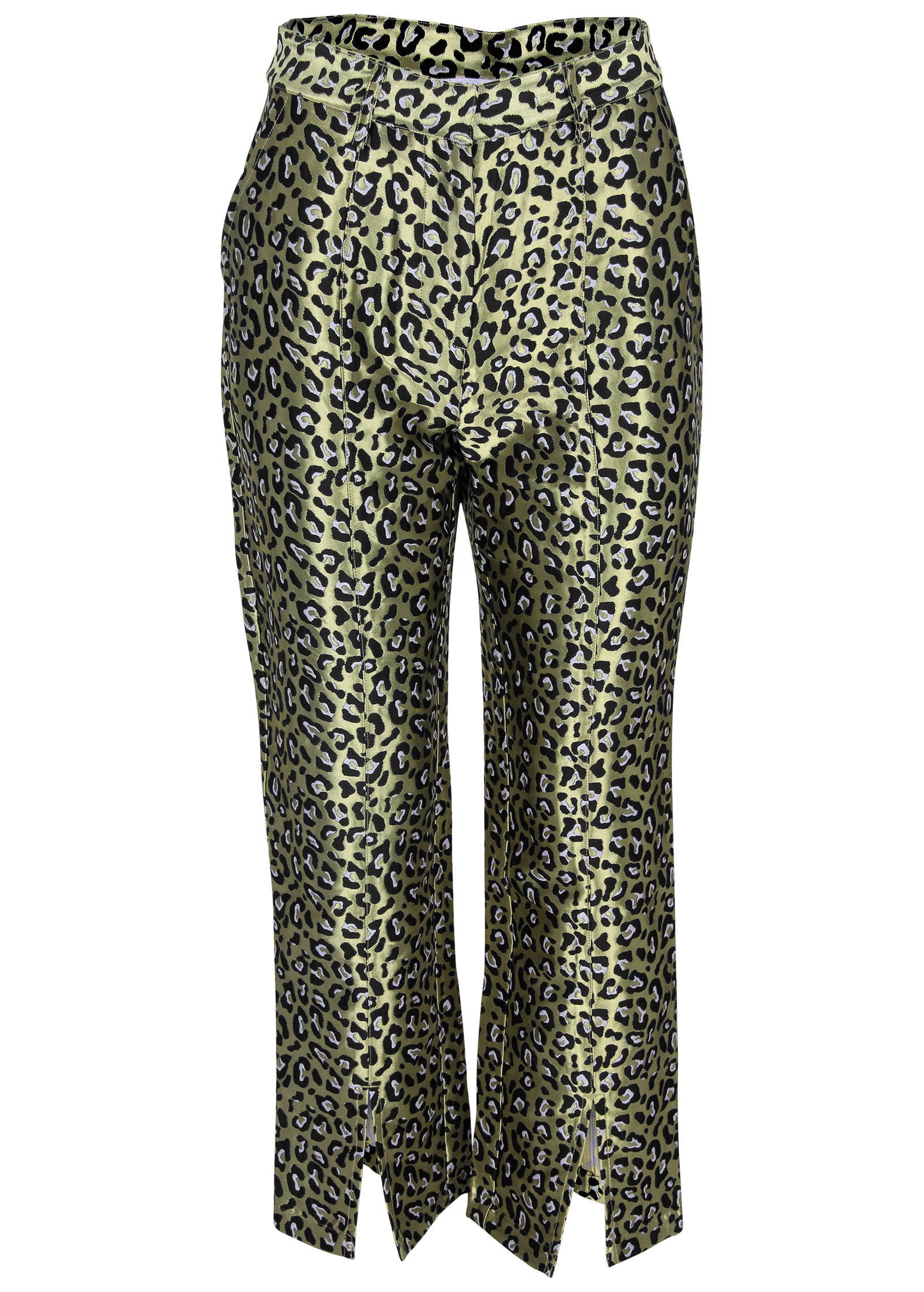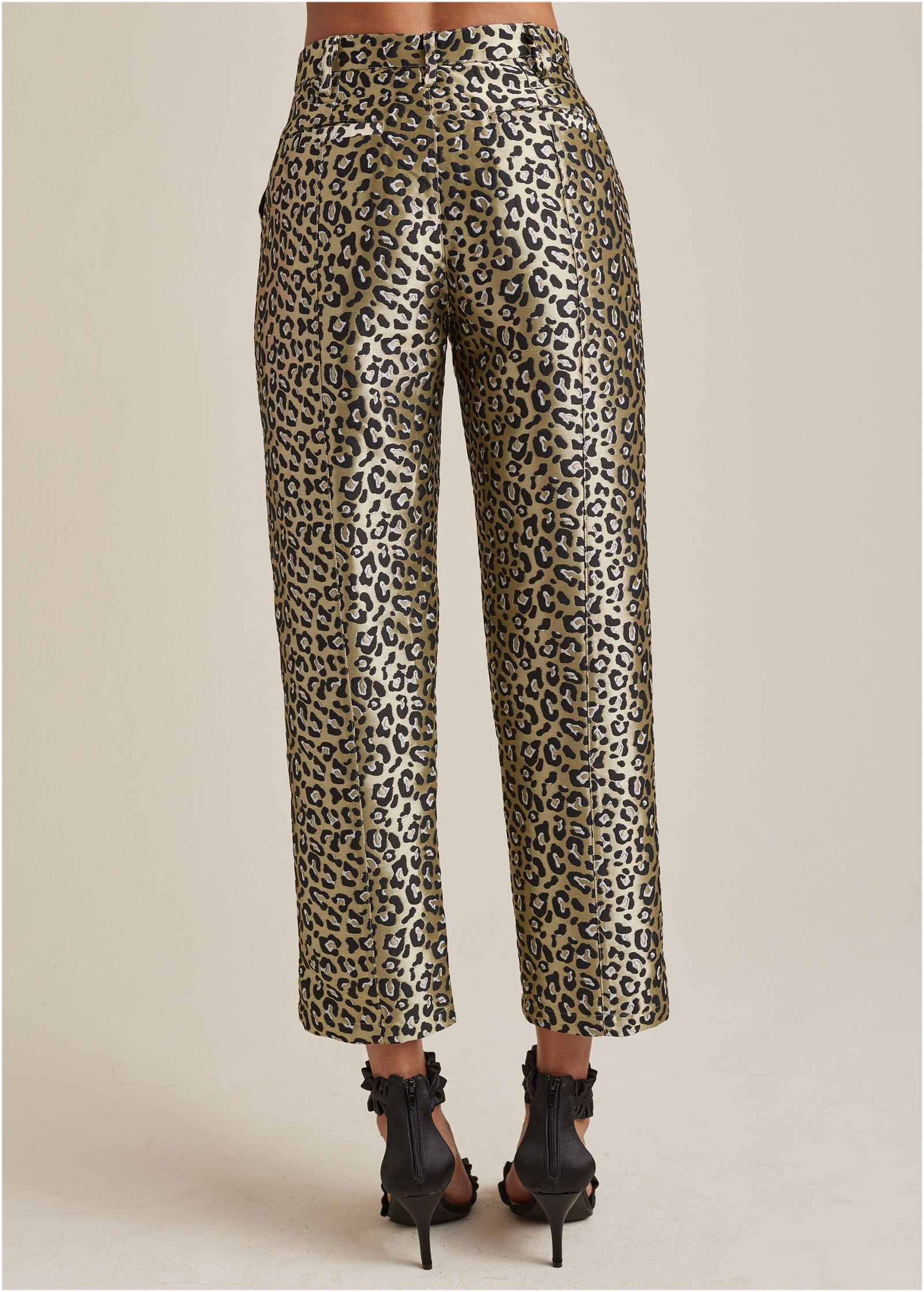 These aren't your usual holiday metallics. No. these gold pants are tailored to a T for a polished look and feature leopard-print jacquard for a fierce and shiny spin. With a slit at the hem. this pair is elegant enough for the office yet playful enough to make it to midnight to see the ball drop. Just add heels. a bold top and the matching jacket—if that's your vibe.* Available in petite sizes* Inseam: 27" missy; 24" petite* Zipper. hook & eye closures* Side and back pockets* Front slit at hem* Unlined* Polyester. Imported
