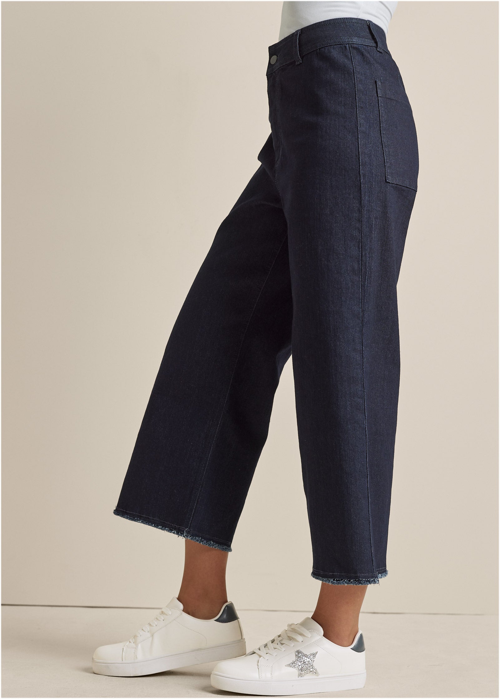 With a flattering high-rise. cropped silhouette and effortless frayed hem. these wide-leg jeans are not your average blues. No really. did you notice the ultra-dark wash? It's right on trend and combined with the trouser-esque look (no front pockets). this pair is a nice change of pace.* Available in plus sizes* 24" Inseam* Functional back patch pockets* Zip and button closure* Fabric has stretch* Cotton/poly/elastane. Imported
