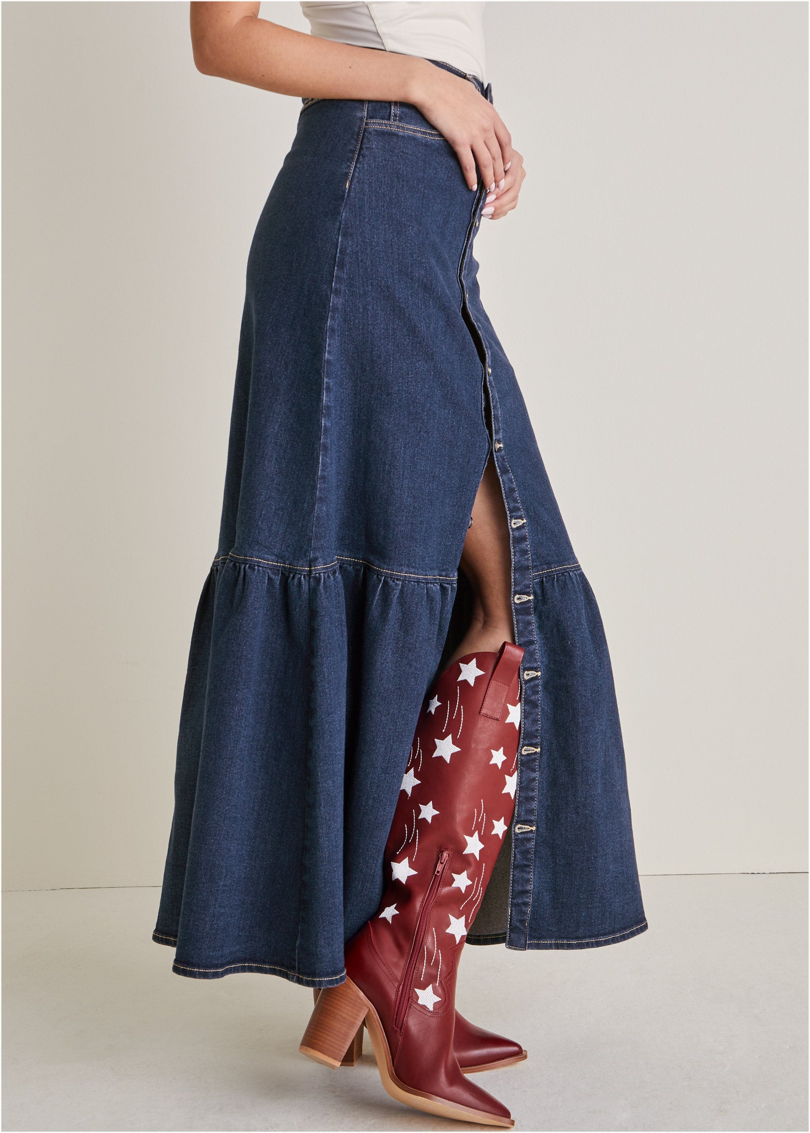 A free-spirited western vibe is yours with this long denim skirt. The flared shape and twirly tiered hem give this playful piece a flirty feel. Leave a few buttons undone at the bottom to reveal a pop of leg and show off your bold boots underneath. Paired with a tee or tank. cozy sweater and more. you'll find yourself reaching for this versatile skirt just as often as your favorite pair of jeans.* Available in plus sizes* Runs small; size up for a better fit* Button front* Pockets* Maxi length. 41"* Fabric has stretch* Cotton/polyester/elastane. Imported