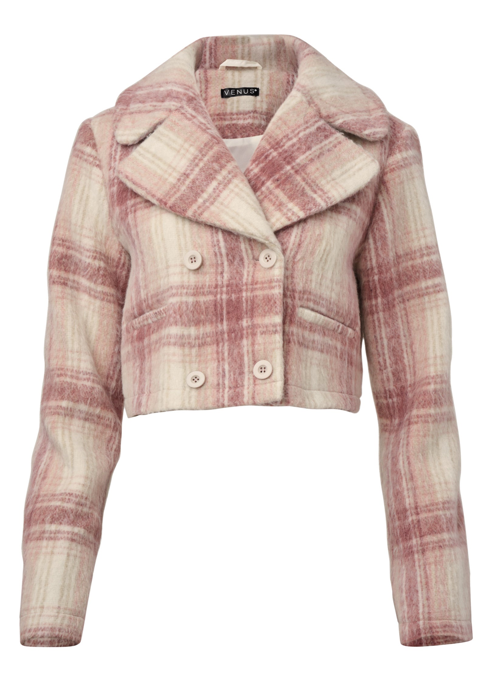 This isn't your classic plaid jacket. In a soft pink-and-white palette with a boxy shape and cropped silhouette. this topper feels refreshingly modern. For a play on proportions. team it with high-rise wide-leg jeans.* Fabric does not have stretch* Long sleeves* Button closure * Partially lined* Functional side pockets* 19.5" approx. length; varies by size* Poly/wool. Imported