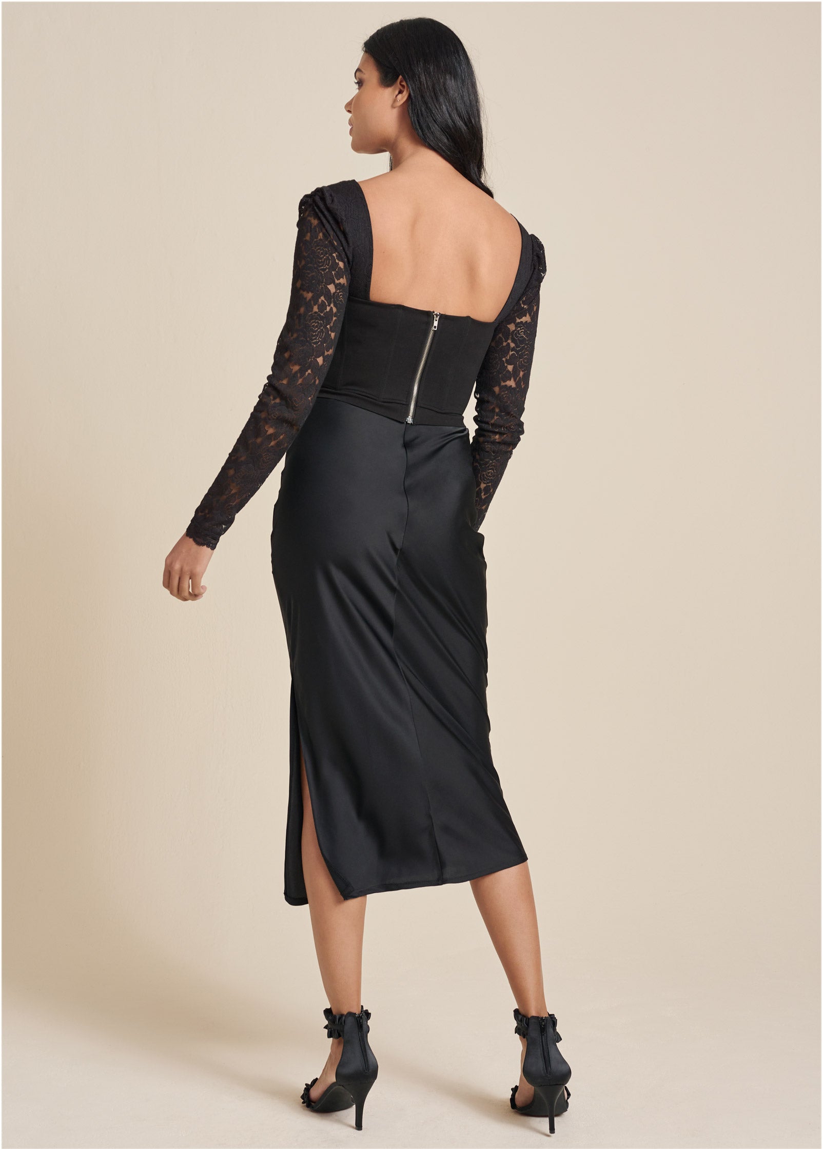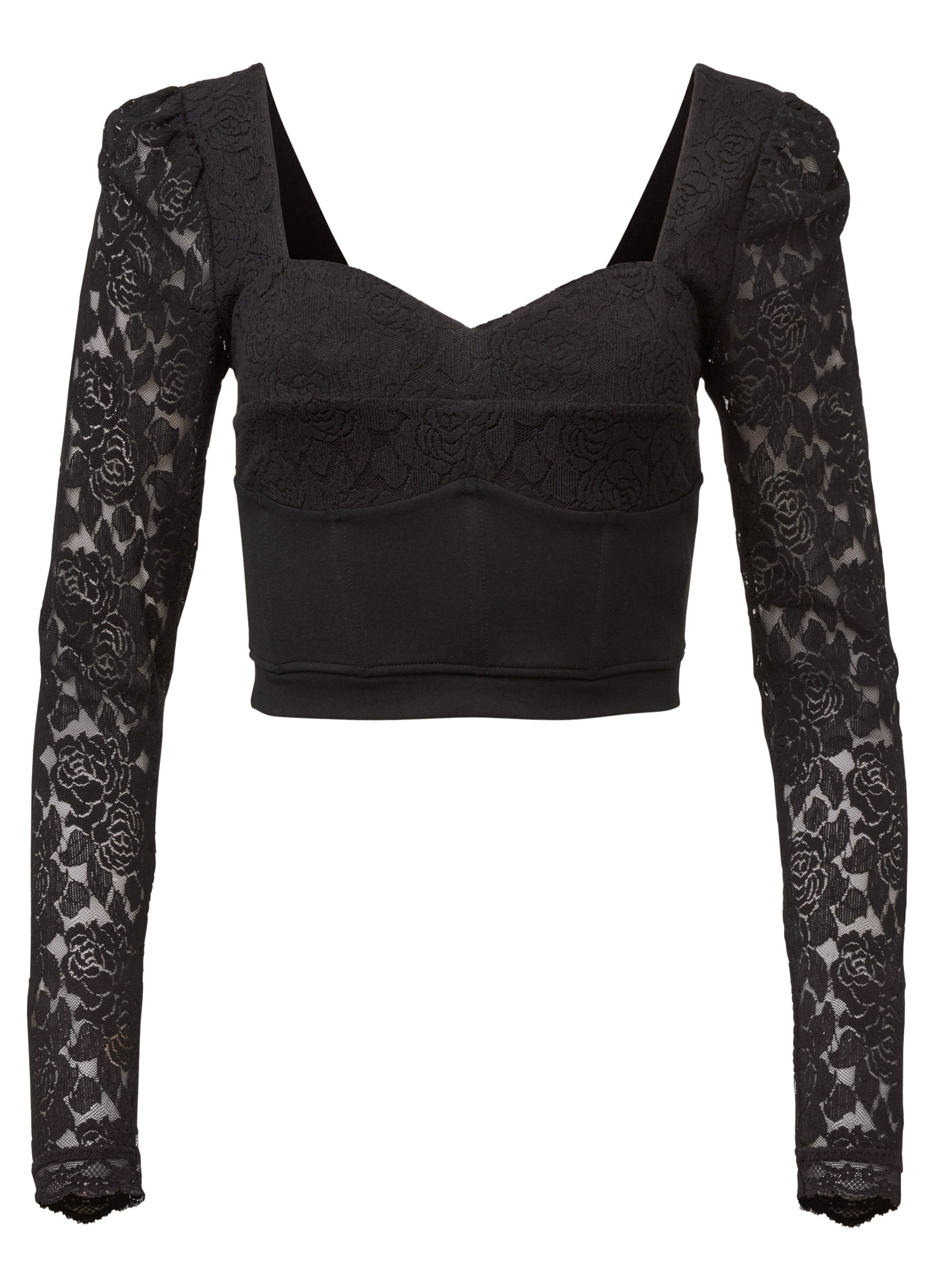 This little black top is nothing short of alluring. The bustier-like silhouette features a flirty sweetheart neckline that adds a softness to the top's overall edge. What really draws the eye are the sheer lace long-sleeves. Pair this cropped top with a high-waist bottom for a head-turning look.* Sizes: XS (2). S (4-6). M (8-10). L (12-14). XL (16) * Plus sizes: 1X (18-20). 2X (22-24). 3X (26-28)* 16" approx. length; varies by size * Fabric has minimal stretch * Long sleeves* Rayon/nylon/spandex. Imported