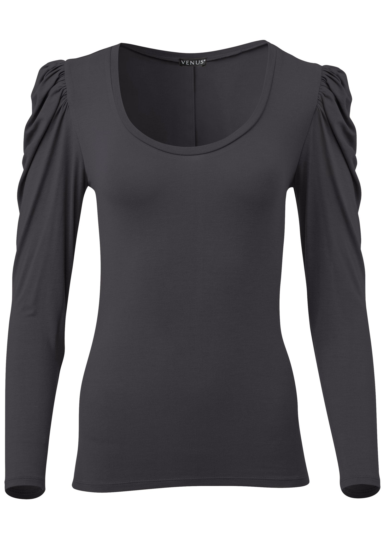 This long-sleeve tee is anything but basic. Sure. its scoop neckline and sleek. body-skimming fit are classic. but the bold draped puff sleeves are another story! Made in our Everyday Ease T-shirt fabric. this top has the perfect amount of stretch making it an everyday favorite.* Sizes: XS (2). S (4-6). M (8-10). L (12-14). XL (16) * Plus sizes: 1X (18-20). 2X (22-24). 3X (26-28)* 24" from shoulder* Scoop neck* Long sleeves* Everyday Ease (Ecovero™ Viscose/spandex. Imported)