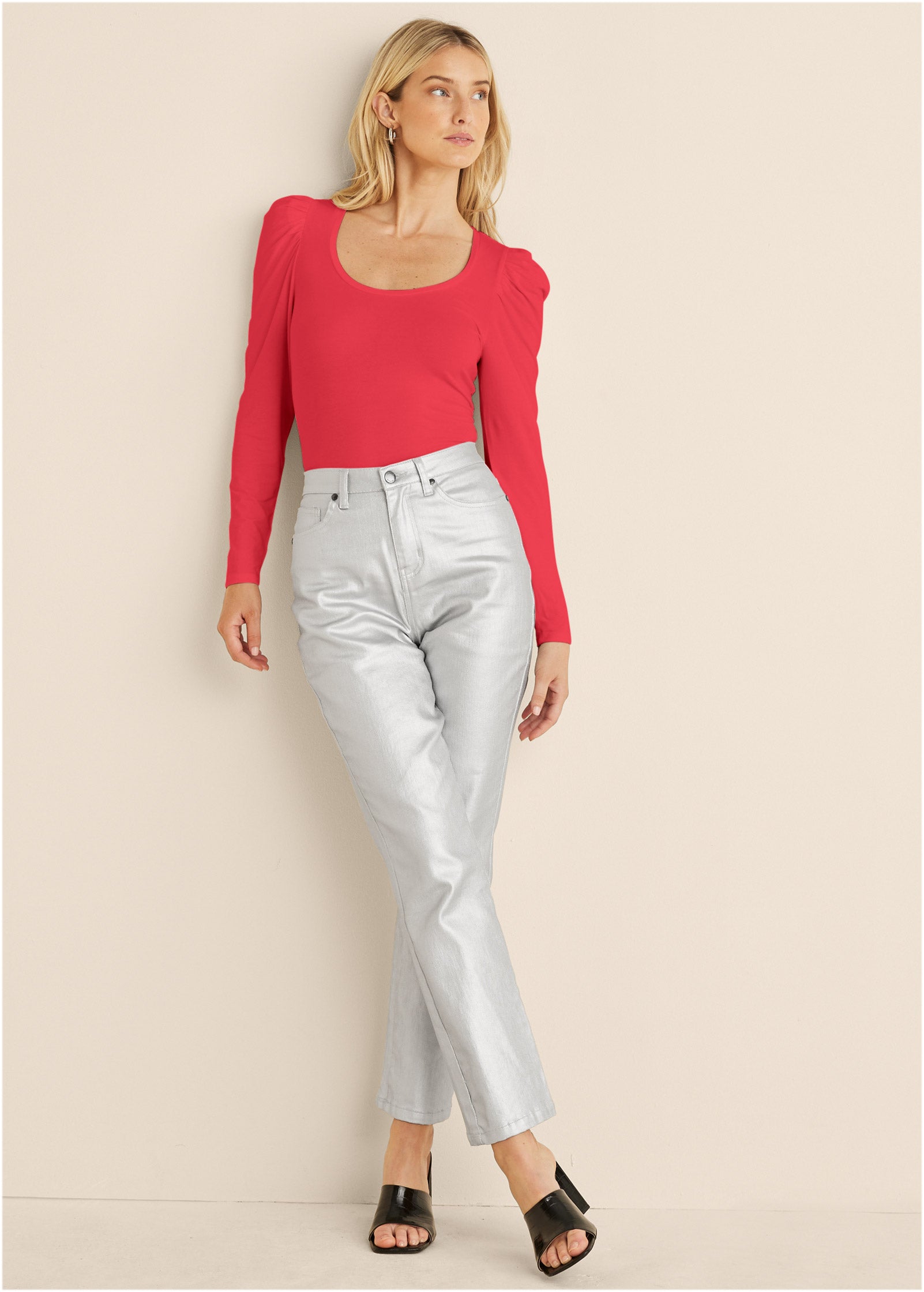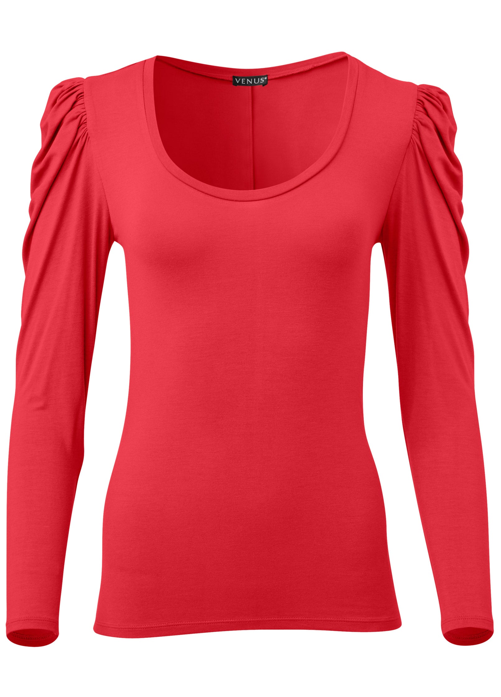 This long-sleeve tee is anything but basic. Sure. its scoop neckline and sleek. body-skimming fit are classic. but the bold draped puff sleeves are another story! Made in our Everyday Ease T-shirt fabric. this top has the perfect amount of stretch making it an everyday favorite.* Sizes: XS (2). S (4-6). M (8-10). L (12-14). XL (16) * Plus sizes: 1X (18-20). 2X (22-24). 3X (26-28)* 24" from shoulder* Scoop neck* Long sleeves* Everyday Ease (Ecovero™ Viscose/spandex. Imported)