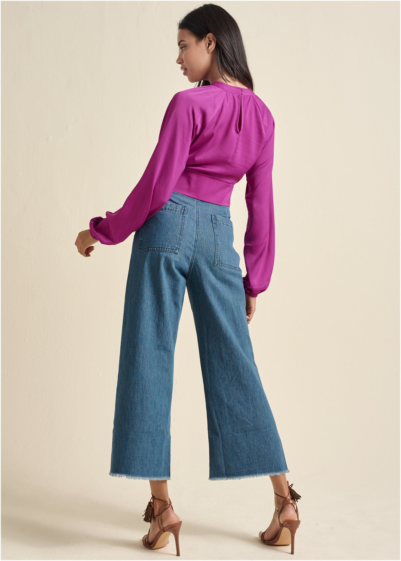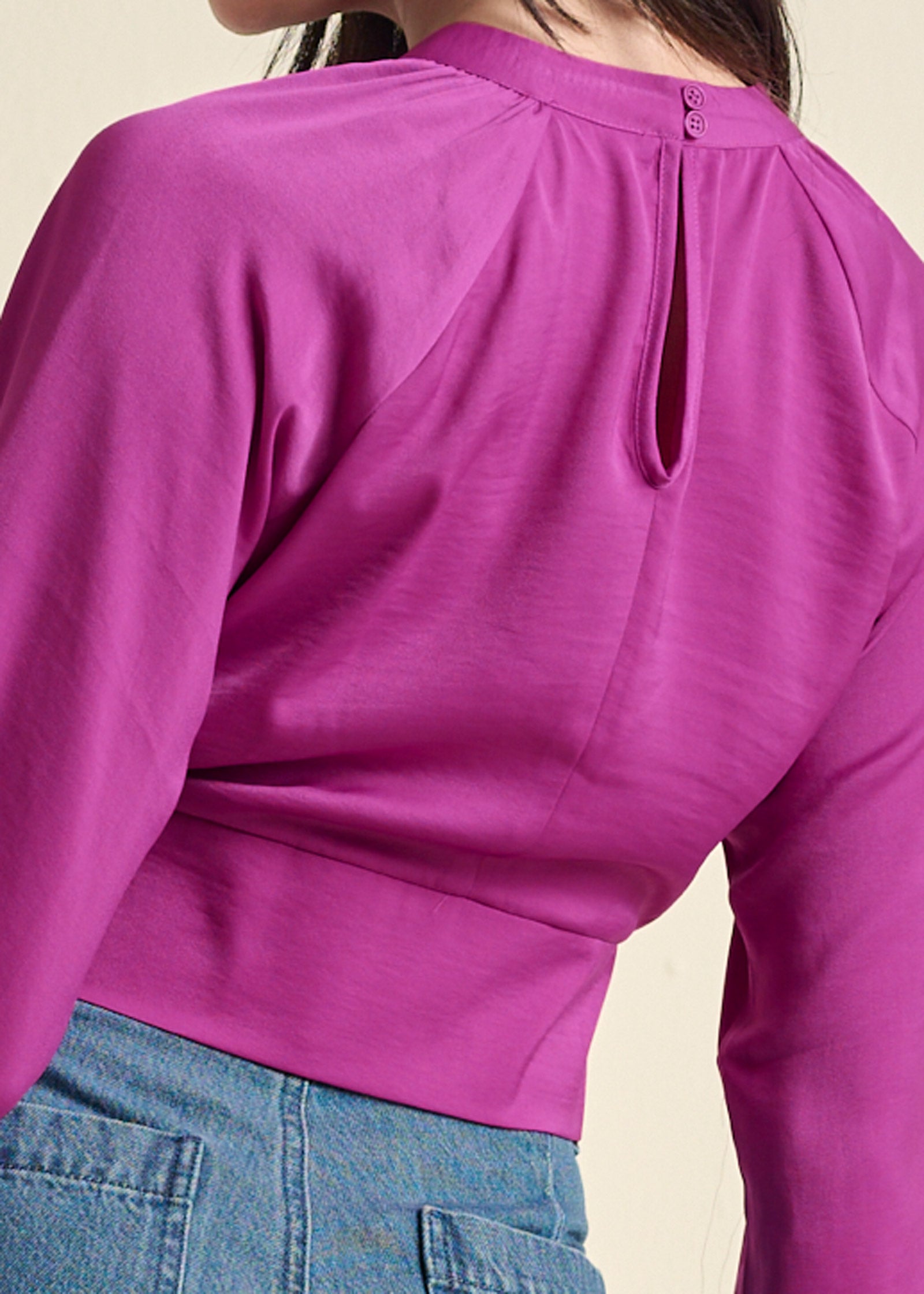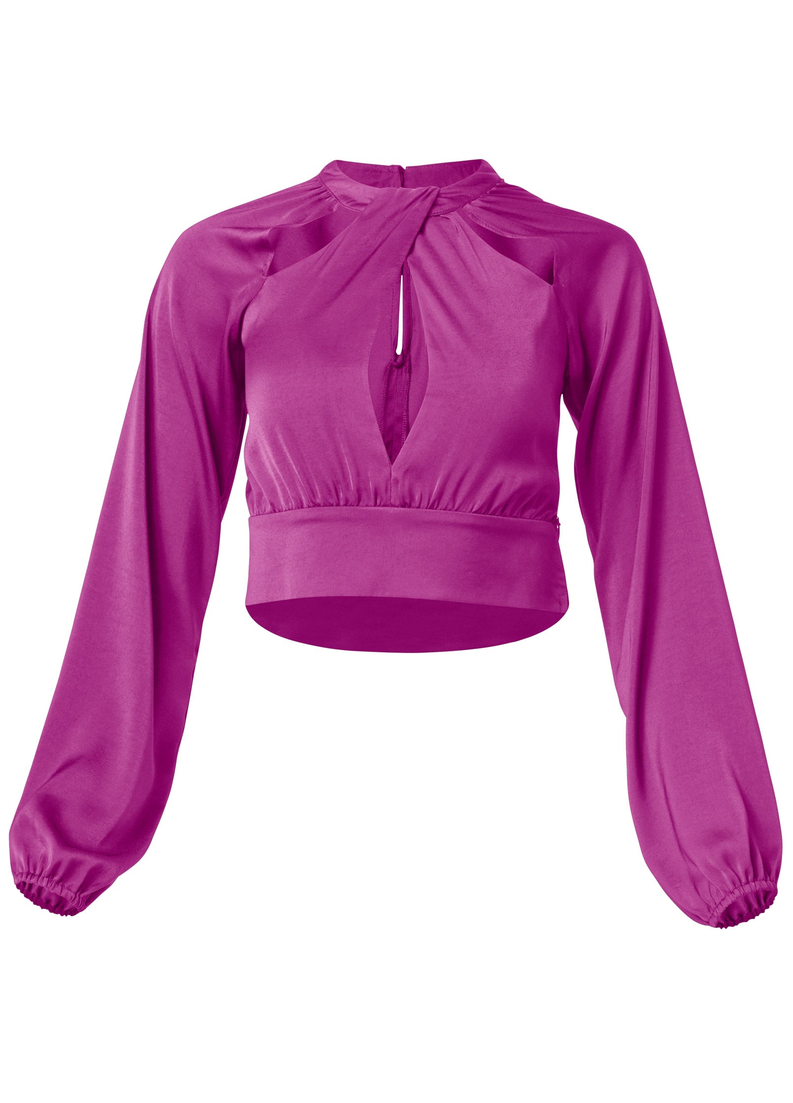 Three revealing front cutouts give this blouse edge. formed by the twist-front mock neck that draws the eye up. A wide. waist-defining band finishes the cropped hem. while the elastic cuffs of the long sleeves create a loose fit to balance the daring bodice that buttons behind the neck.* Sizes: XS (2). S (4-6). M (8-10). L (12-14). XL (16)* 15" approx. length; varies by size* Cropped * Button closure at back neck* Long sleeves * Keyhole* Fabric does not have stretch * Poly. Imported