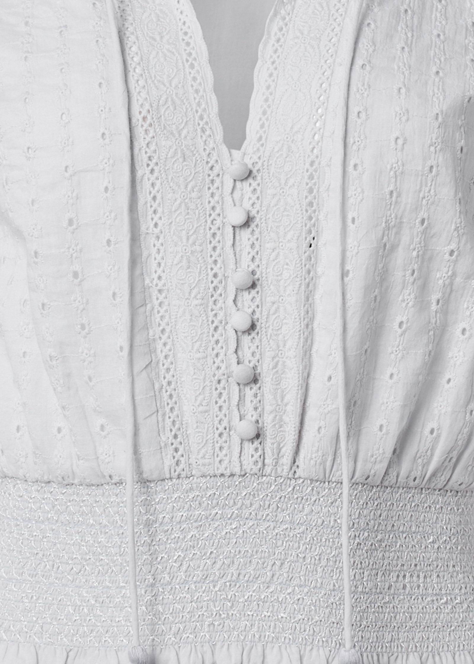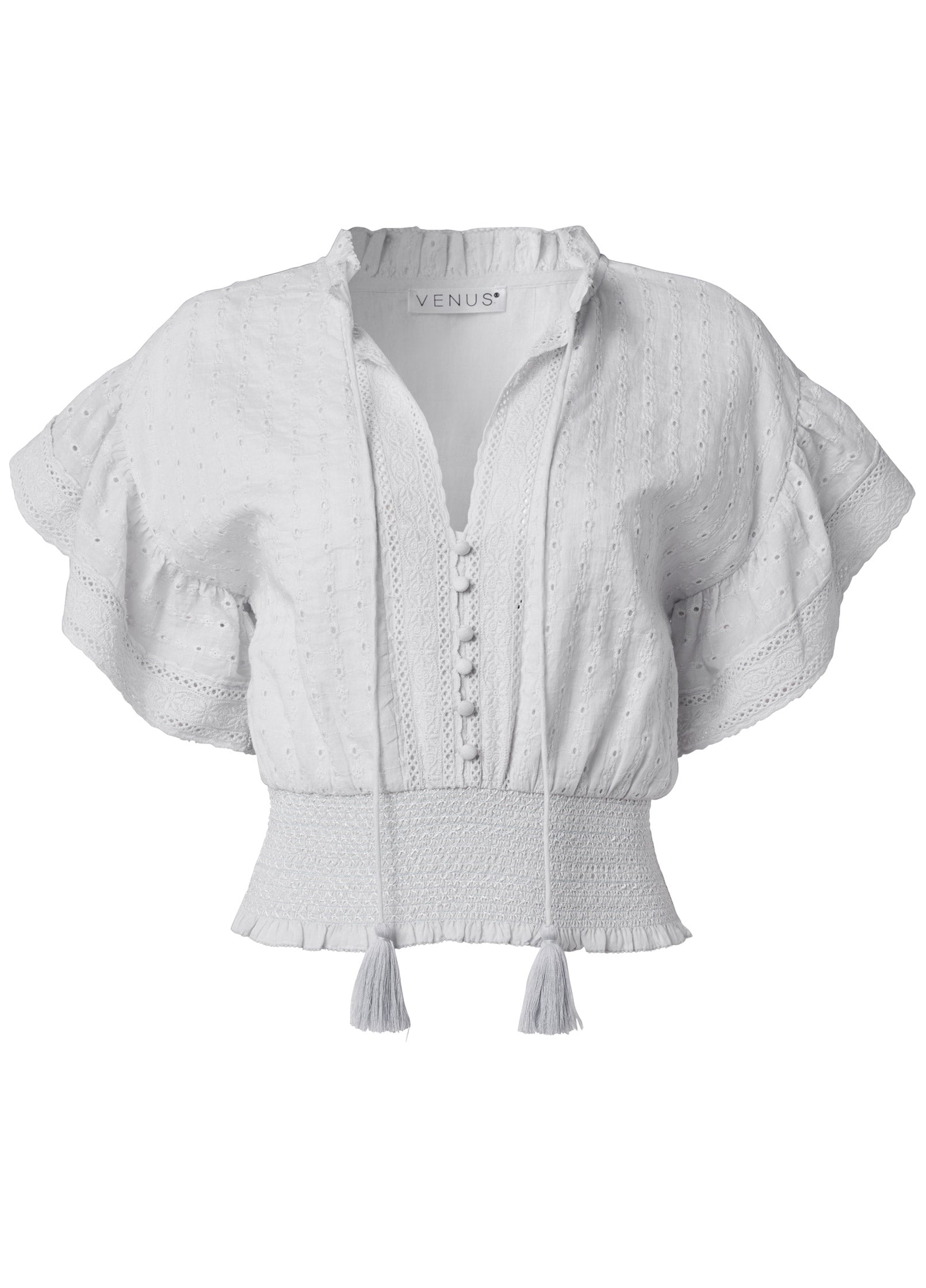 Of-the-moment trends meet boho elements in this eyelet crop top with fluttery short sleeves! Its V-front and button details make this smocked-hem top chic. with tassel ties hanging from the neckline for a free-spirited touch. Slightly scalloped edges work with the eyelet to create a feminine feel.* Available in plus sizes* Crop top* Smocked band at waist* Adjustable tie closure with tassels* Wide short sleeves* V-neck* Front button details* 19" approx. length; varies by size* Fabric does not have stretch * Cotton. Imported