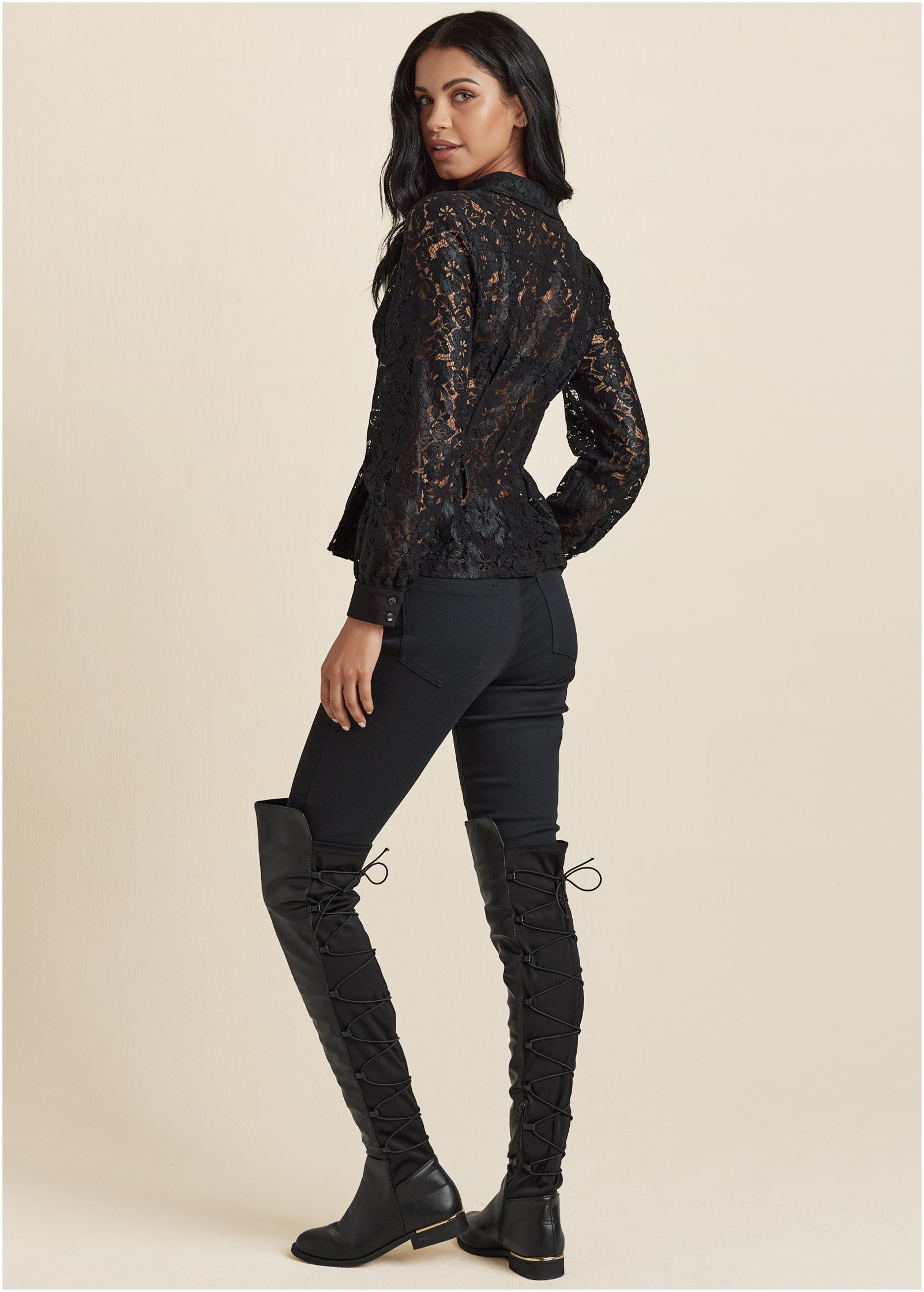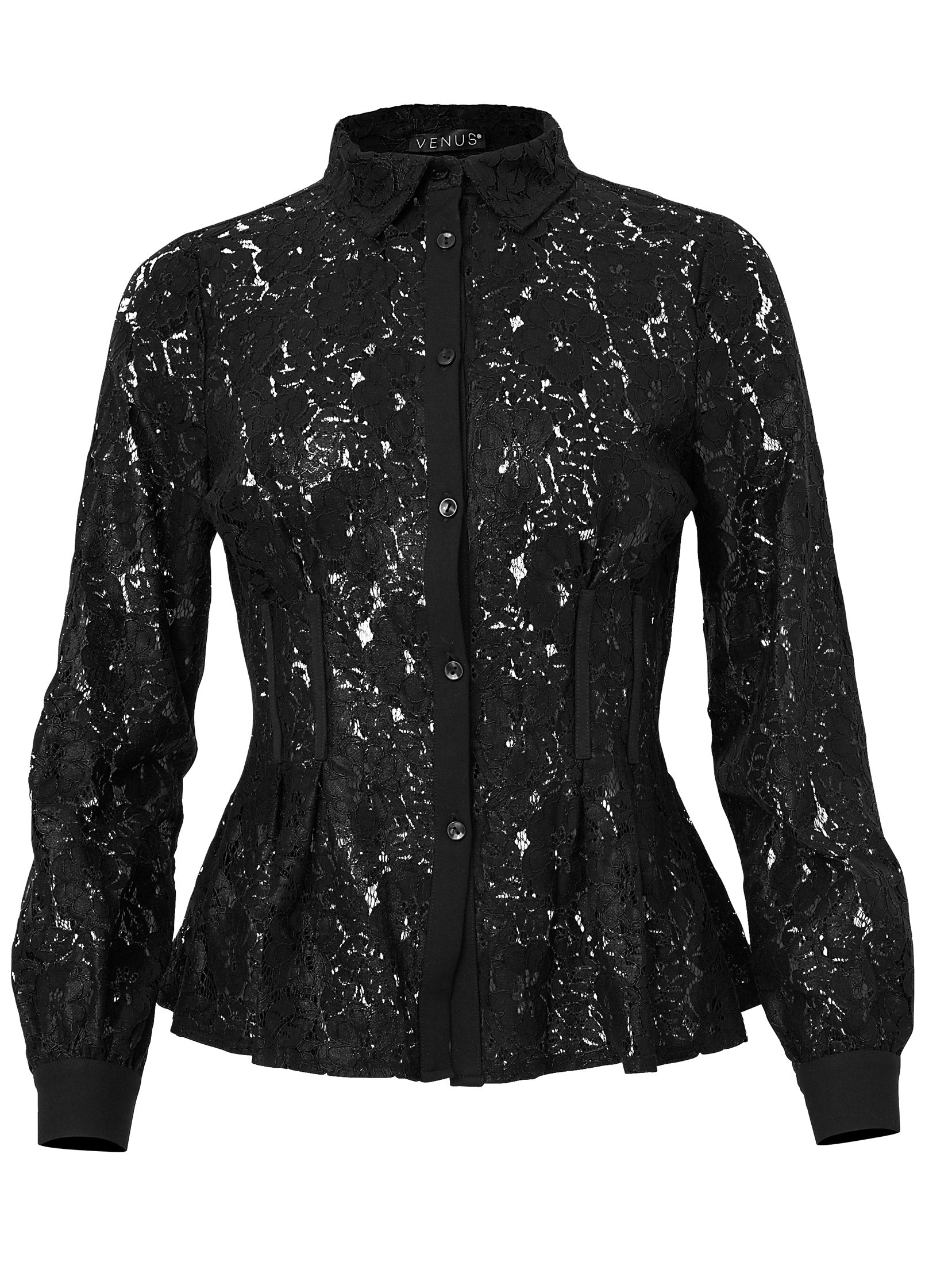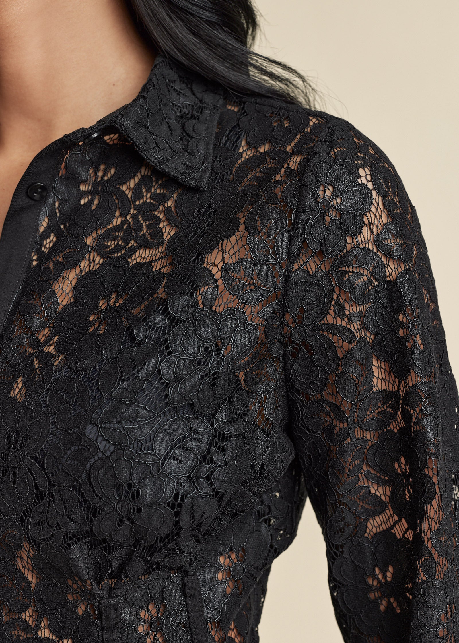 This top makes a case for opposites attracting. Delicate lace is feminine and romantic. while the sheer element adds a sultry spin. The silhouette: polished with shirting details. yet playful with a peplum shape. Pair this bold piece with sleek skinny jeans or faux-leather pants and get ready to own the room.* 25" approx. length; varies by size* Sheer* Collared neckline* Button front closure* Long sleeves with button cuffs* Cotton/polyamide. Imported