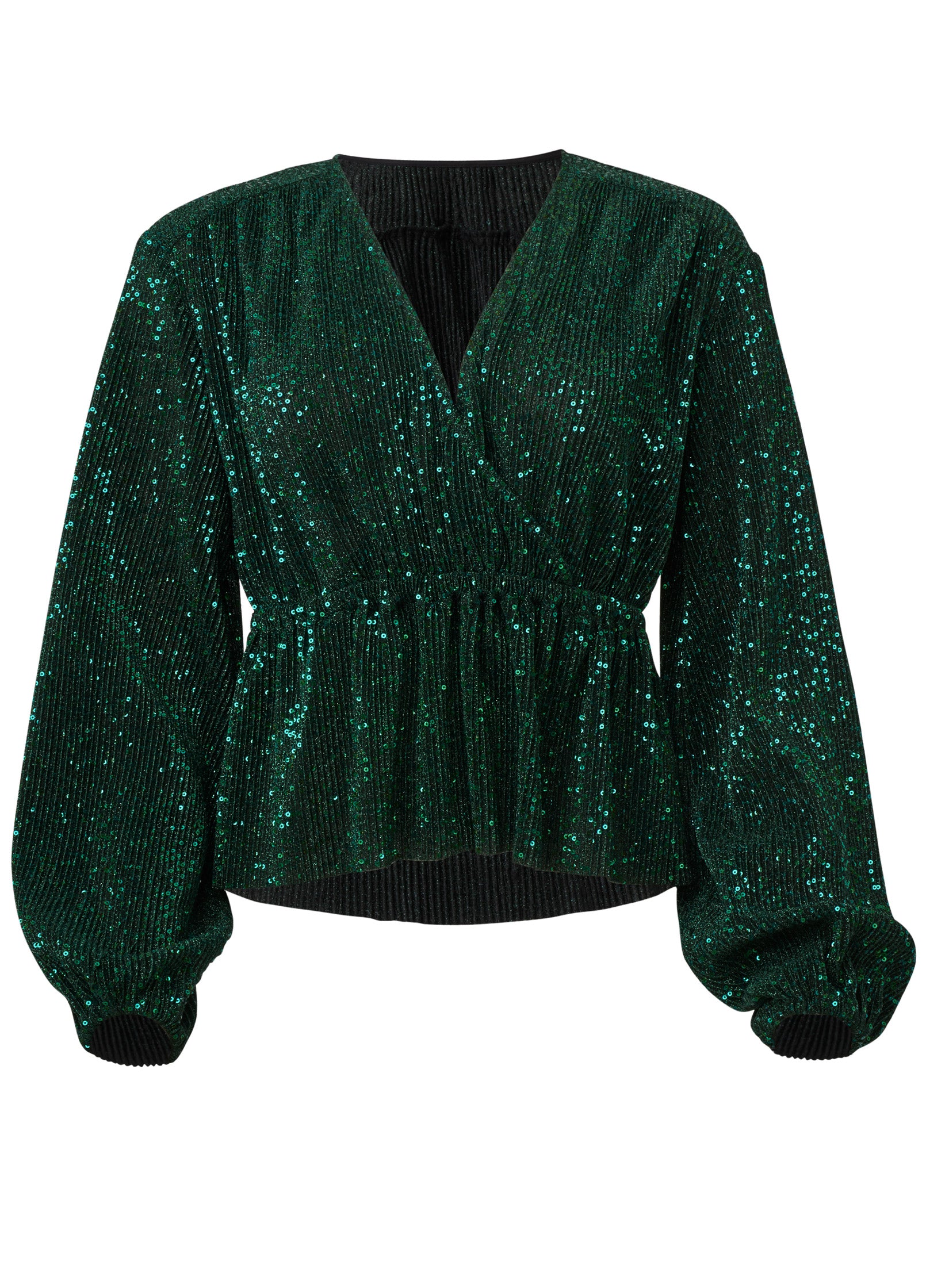 Sometimes more is more and here's your proof positive. Emerald green sequins make this top sparkle and shine like a disco ball. ready to light up the night! Puff sleeves add a playful vibe while a defined waist flatters your figure. Team this luxe top with sleek pieces for a dazzling party look.* Wrap-style front* Long sleeves with elastic cuffs* Elastic waist* 21" approx. length; varies by size* Fabric has minimal stretch* Poly. Imported