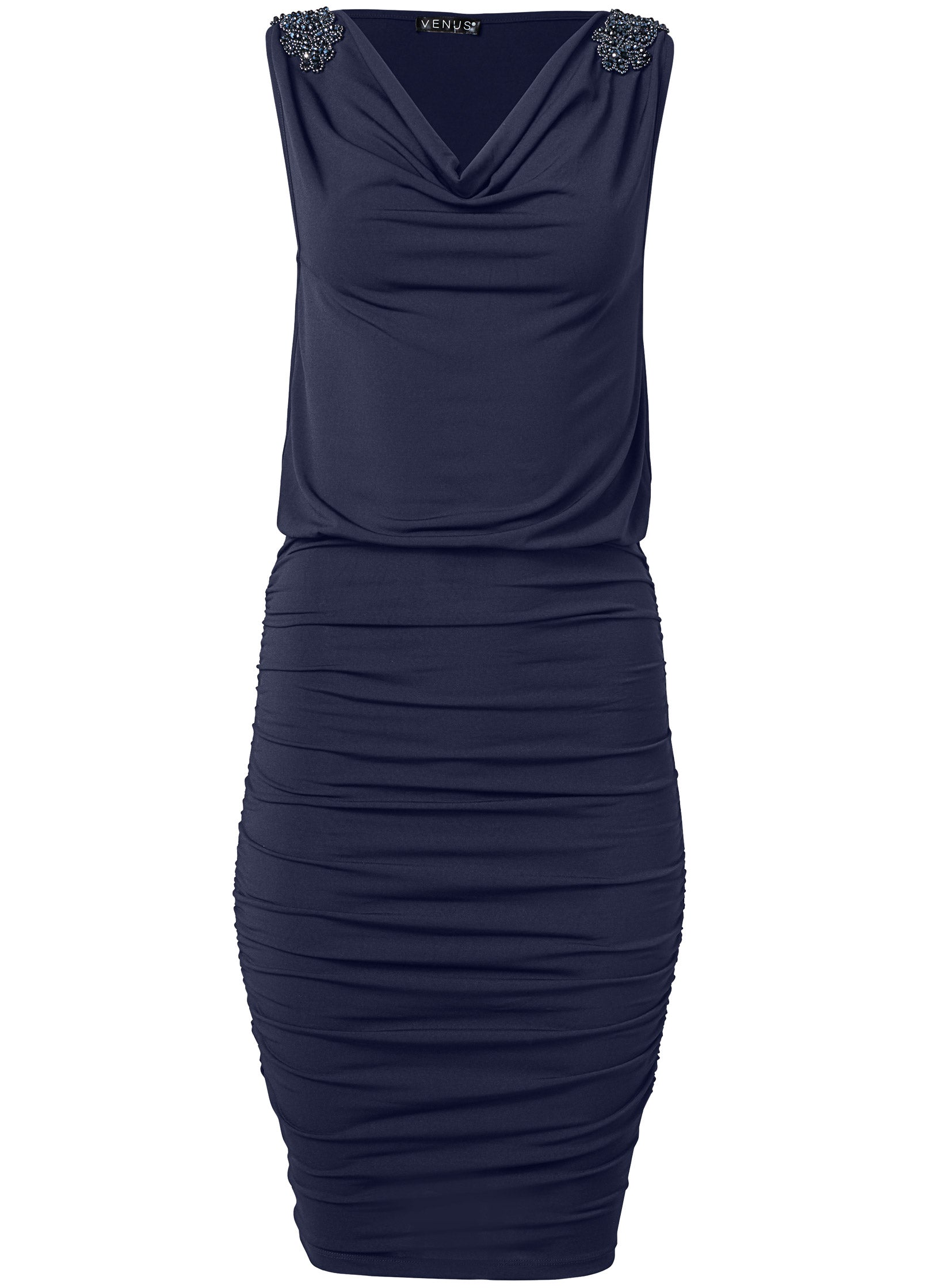 Beaded embellishments sit on the shoulders of this sleeveless midi dress. framing the graceful cowl neck that drapes onto the relaxed and blousy bodice. The side and back seams on the skirt lead to allover ruching that smooths your curves in a flattering silhouette that slims.* Sizes: XS (2). S (4-6). M (8-10). L (12-14). XL (16) * Plus sizes: 1X (18-20). 2X (22-24). 3X (26-28)* Cowl neck* Wide tank straps with embellishments* 38" approx. length; varies by size* Fabric has stretch* Poly/spandex. Imported