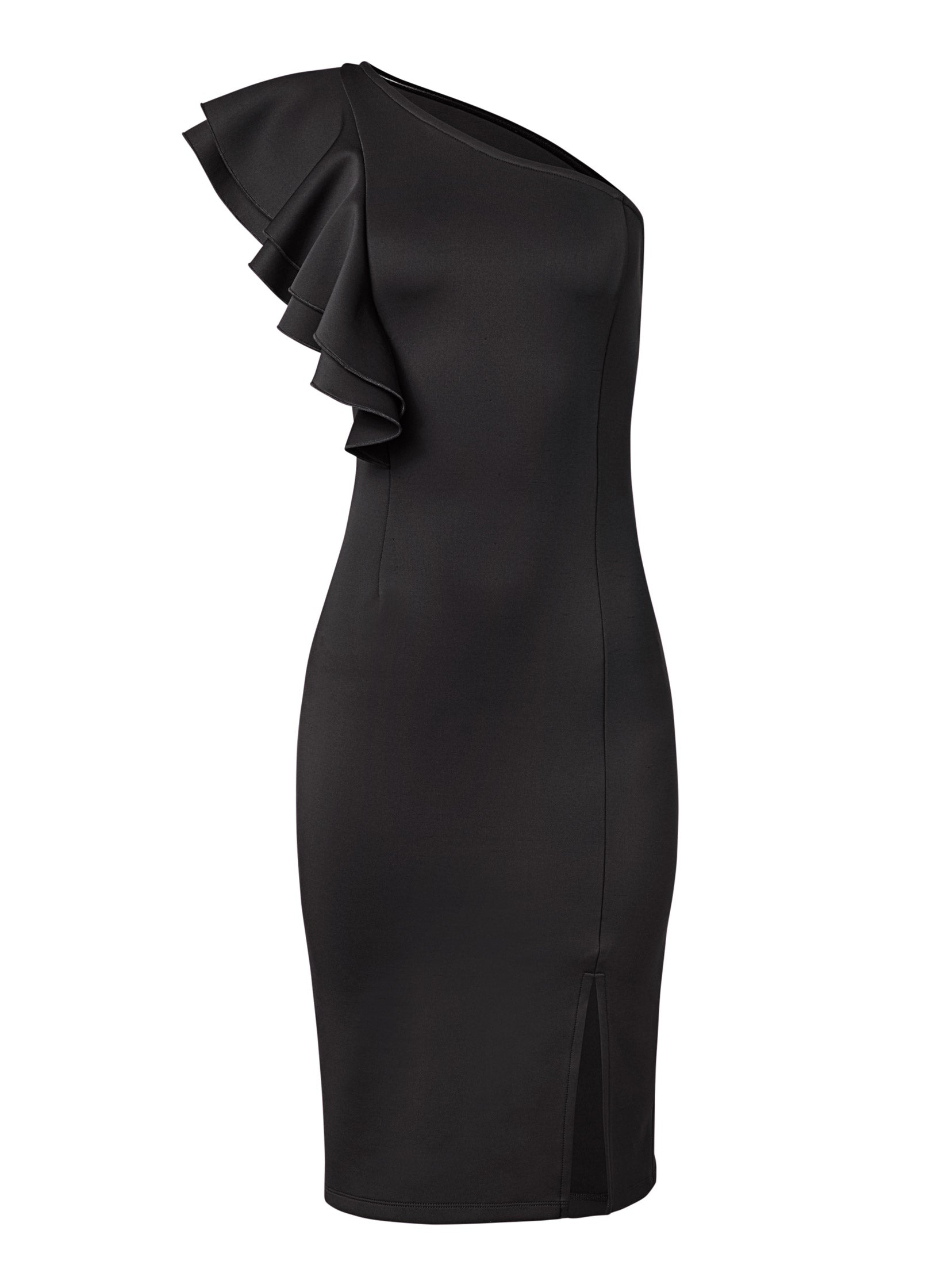 Dramatic one-shoulder styling with a ruffled sleeve assures this midi dress makes an instant statement! The smooth-fitting knee-length silhouette has a side slit to balance the one shoulder and zips up the side for a seamless front and back look.* Sizes: XS (2). S (4-6). M (8-10). L (12-14). XL (16) * Plus sizes: 1X (18-20). 2X (22-24). 3X (26-28)* Item runs large; size down for a better fit* Invisible side zipper* One-shoulder with ruffle detail* Side slit* Midi length: 40"* Fabric has stretch* Polyester/elastane. Imported