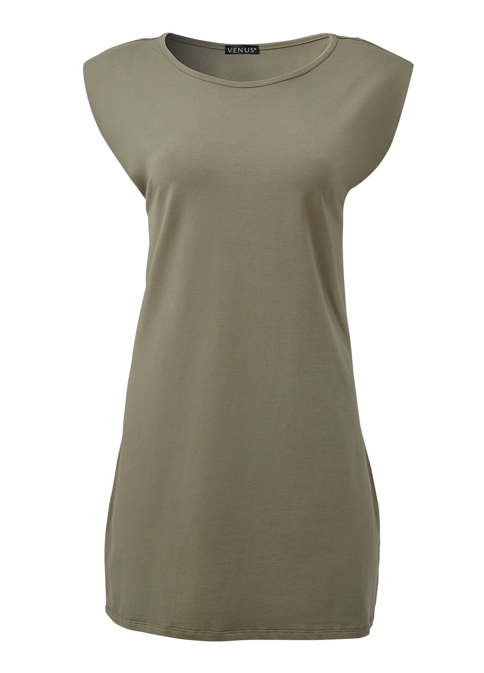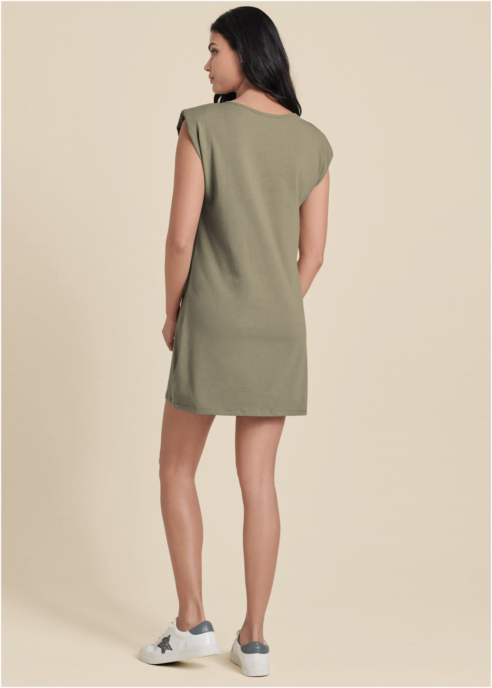 The slightly padded shoulders of this cap-sleeve shift dress balance the hips and loose hem. This short dress drapes from the shoulders creating a roomy scoop neck keeping with the overall relaxed fit. The billowy silhouette of this classic shift make it a choice that works for every body.* Sizes: XS (2). S (4-6). M (8-10). L (12-14). XL (16)* Plus sizes: 1X (18-20). 2X (22-24). 3X (26-28)* Runs tight; size up for a looser fit * Shoulder pads* 33" approx. length; varies by size* Pull-on; no closure* Cotton/spandex. Imported